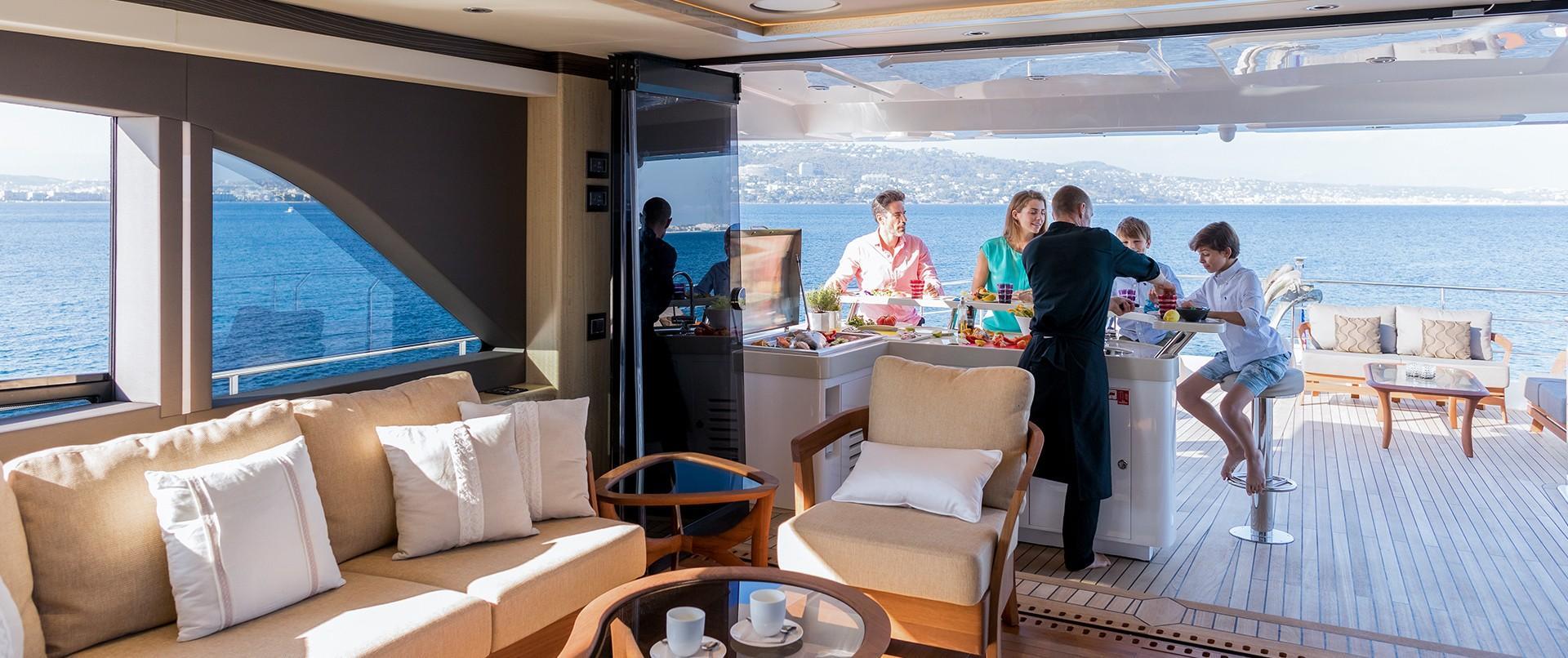 The Majesty 100's interior spaces are thoughtfully designed to provide an abundance of lounging areas, ensuring that every moment on board is one of relaxation and leisure. Whether you prefer intimate gatherings with friends, formal dining experiences, or simply basking in the sun on the spacious deck, this yacht offers a setting for every occasion.