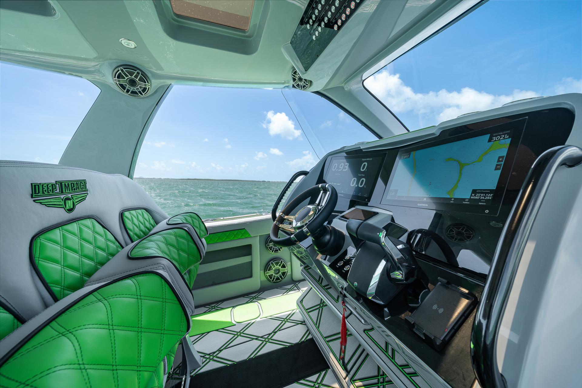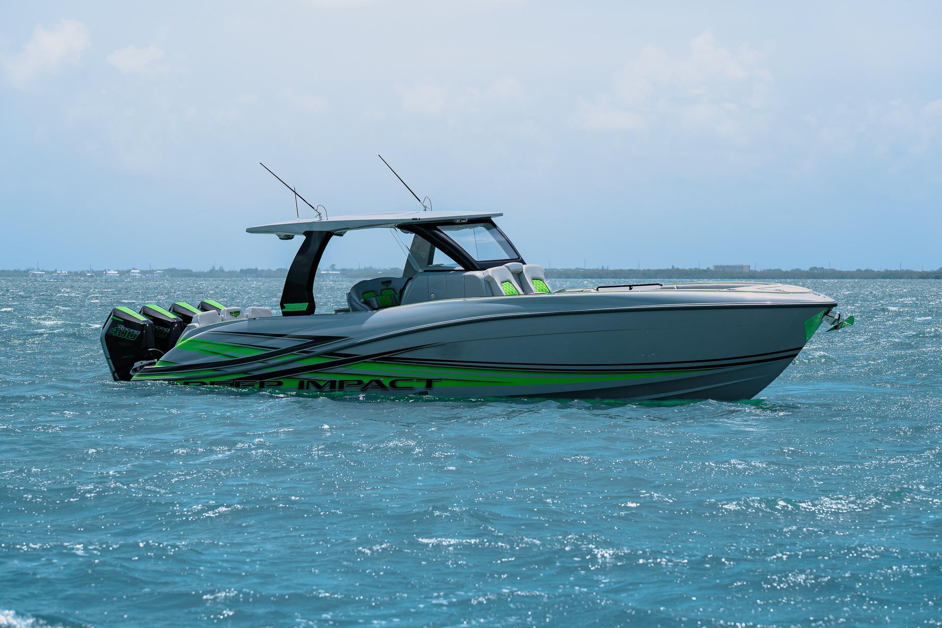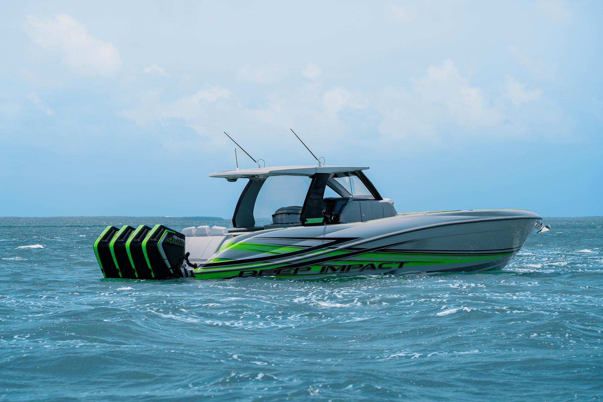 2026 Deep Impact 399 Sport powered by Quad Mercury Racing 400R!Built for Offshore!Features of this 399 Sport include:Quadruple Mercury Racing 400R'sCustom Paint Option Two: Painted Hull from Rub Rail to Water Line - Multi Colored, Gunwale Accent, Deep Impact LogoDual 19" Garmin GPS 9019 DisplaysExtreme JL Audio Sound System PackageSummer Kitchen with Fridge, Bottle Storage and Trash CanCockpit TableGarmin in BowGarmin on HardtopRecessed Anchor LockerBow Storage Compartment Forward Bow Seating with Backrests and StorageForward Deluxe Lounge Seat Four 160 Gallon Fish Boxes Insulated Full Cabin with Head, Day Bed & Sink Triple Helm Seat with Drop Down Bolster Backlit LED Switching System Oversized Hard Top with White Powder Coated Frame Dual Sunroof Forward and Aft Spreader Lights Multi Colored Under Gunwale and Hard Top Lighting Underwater LightsL-Shaped Transom Seat with Insulated Cooler10 LED Cup Holders 4 USB Plugs 8 Pull Cleats Transom Storage Locker Stainless Bow and Stern Eyes Freshwater Washdown Under Gunwale Netted StorageRecessed Shower in HardtopDive Door Trim Tabs 430 Usable Gallons of Fuel 58 Gallons of Fresh Water