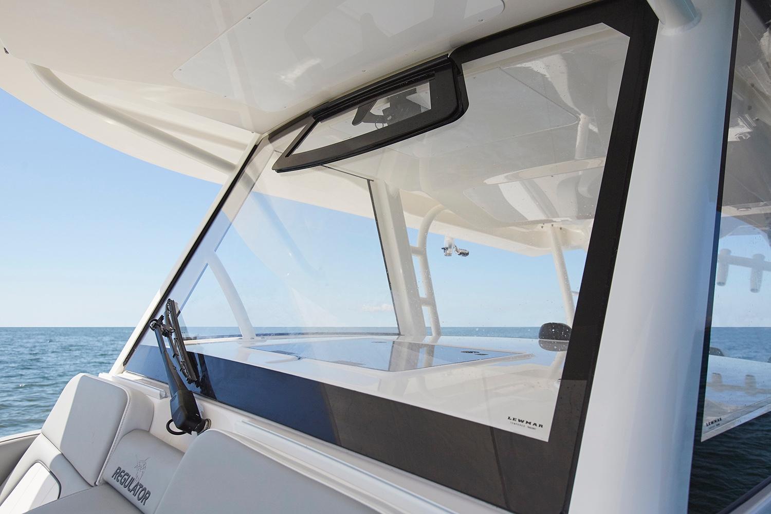 - Fiberglass T-Top with Surfboard Edges, Electronics Box, Navigation/Dock Lighting, Spreader Lights, and Multi-Colored LED Lights, plus Rocket Launchers built into Aft Support Frame and Integrated Wraparound Windshield with Vent and Windshield Wiper/Washer
