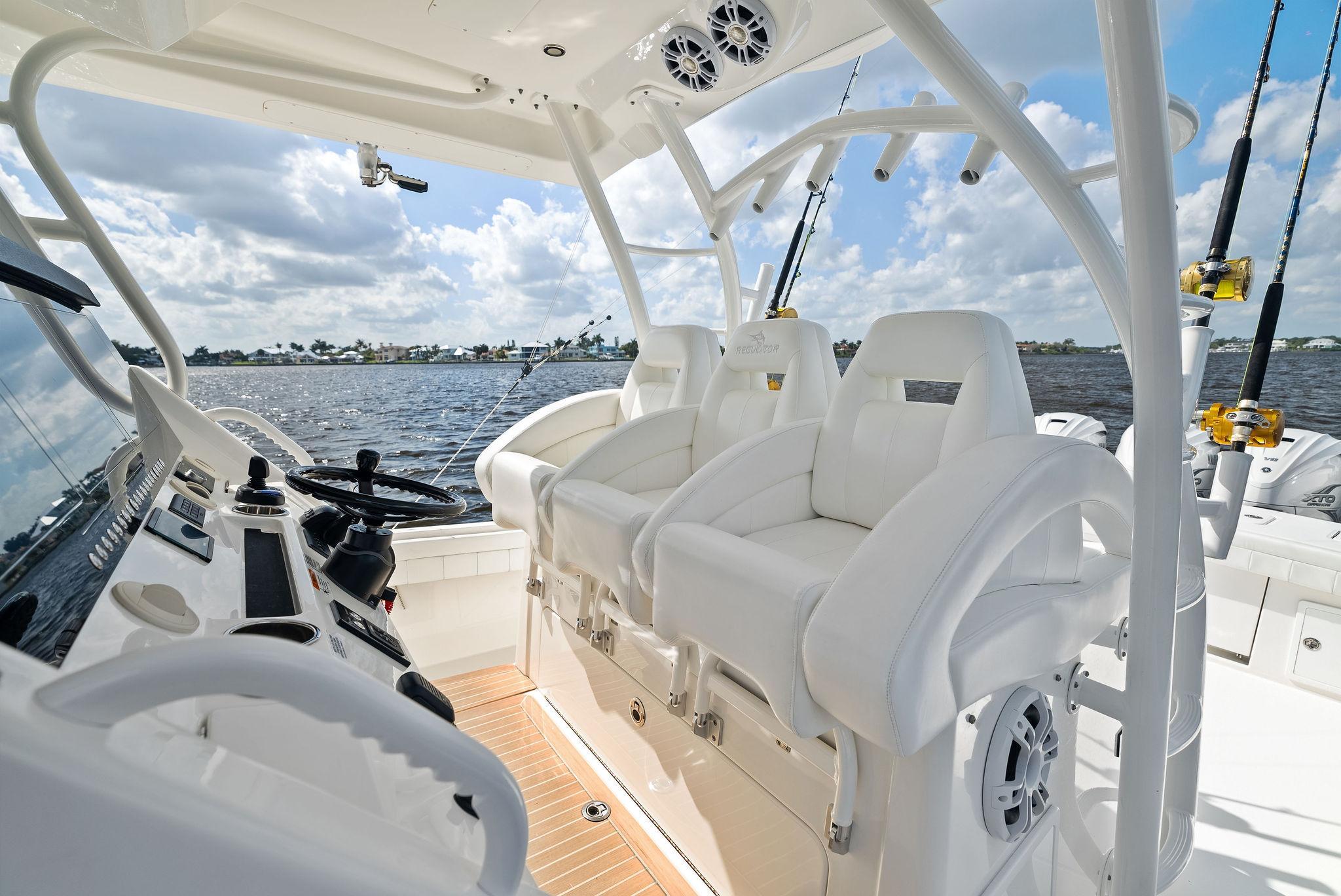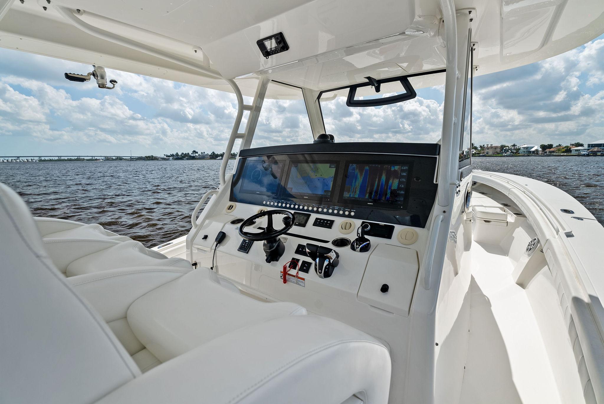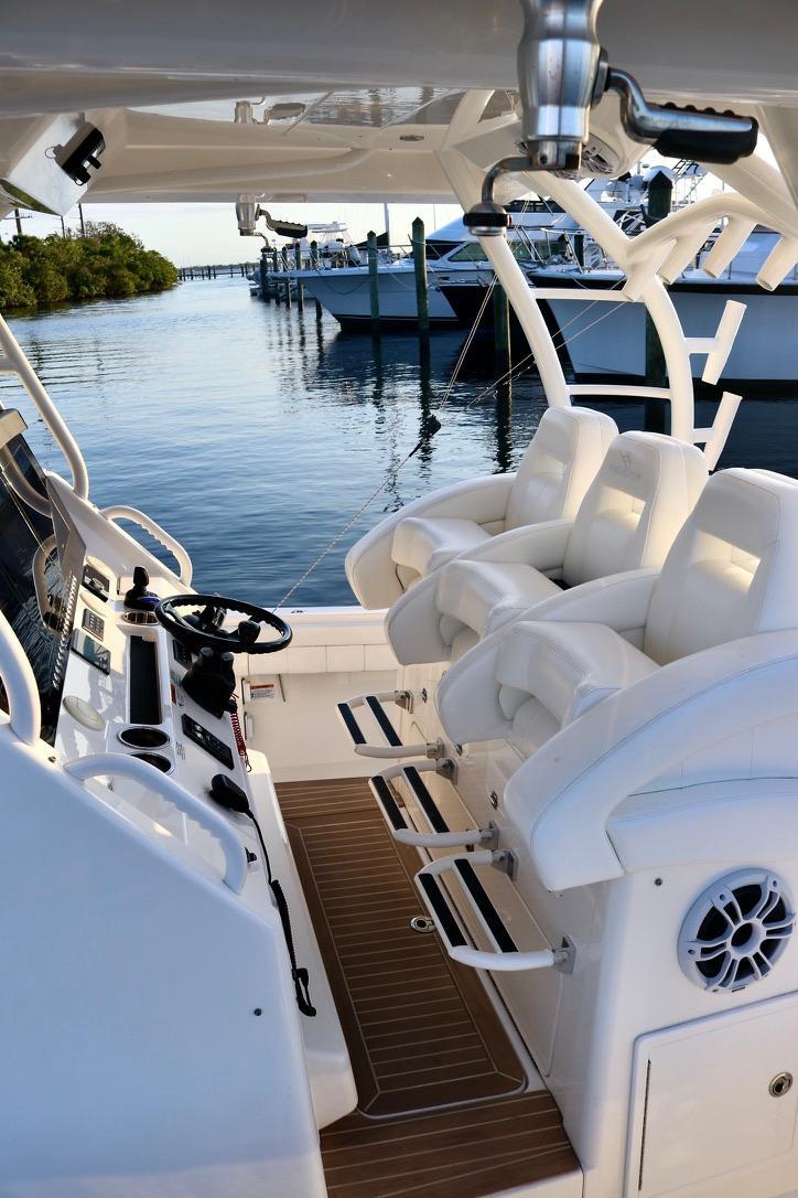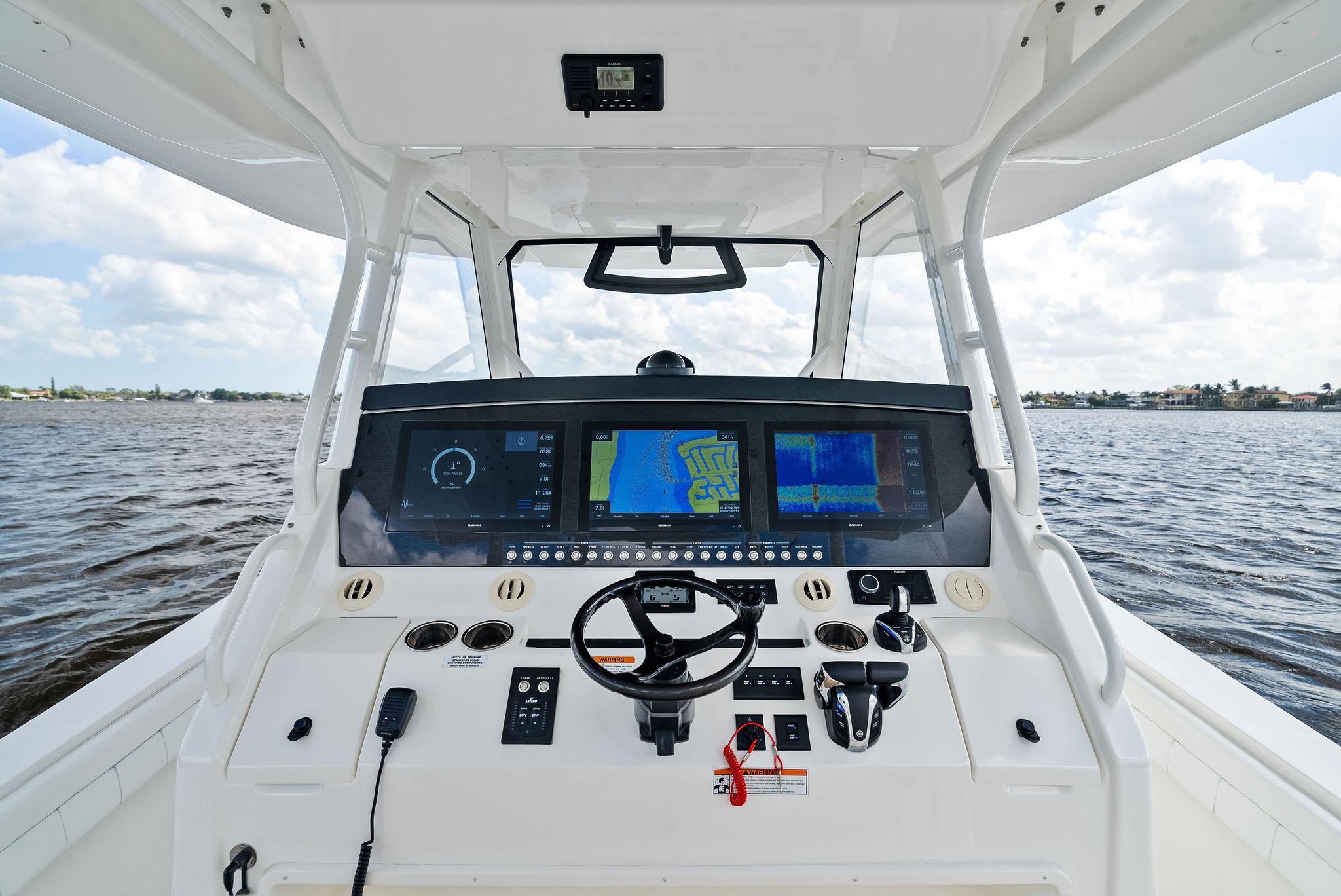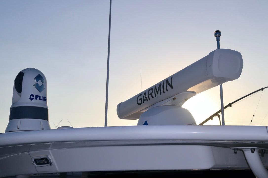 - Factory-Installed Garmin® Offshore 41 Package: Triple 17’’ GPSMAP® 8617 Multi-Touch Widescreen Chartplotter/Sonar Displays, VHF 215 AIS Radio with 8’ Digital VHF Antenna, GMR™ 1224 xHD2 12kW Open-Array Radar, Airmar® B275LHW with Wide Beam 1kW CHIRP Transducer, and Reactor Steer-by-Wire Autopilot, Plus Black Flushmount Electronics Face and Mic Relocation Kit