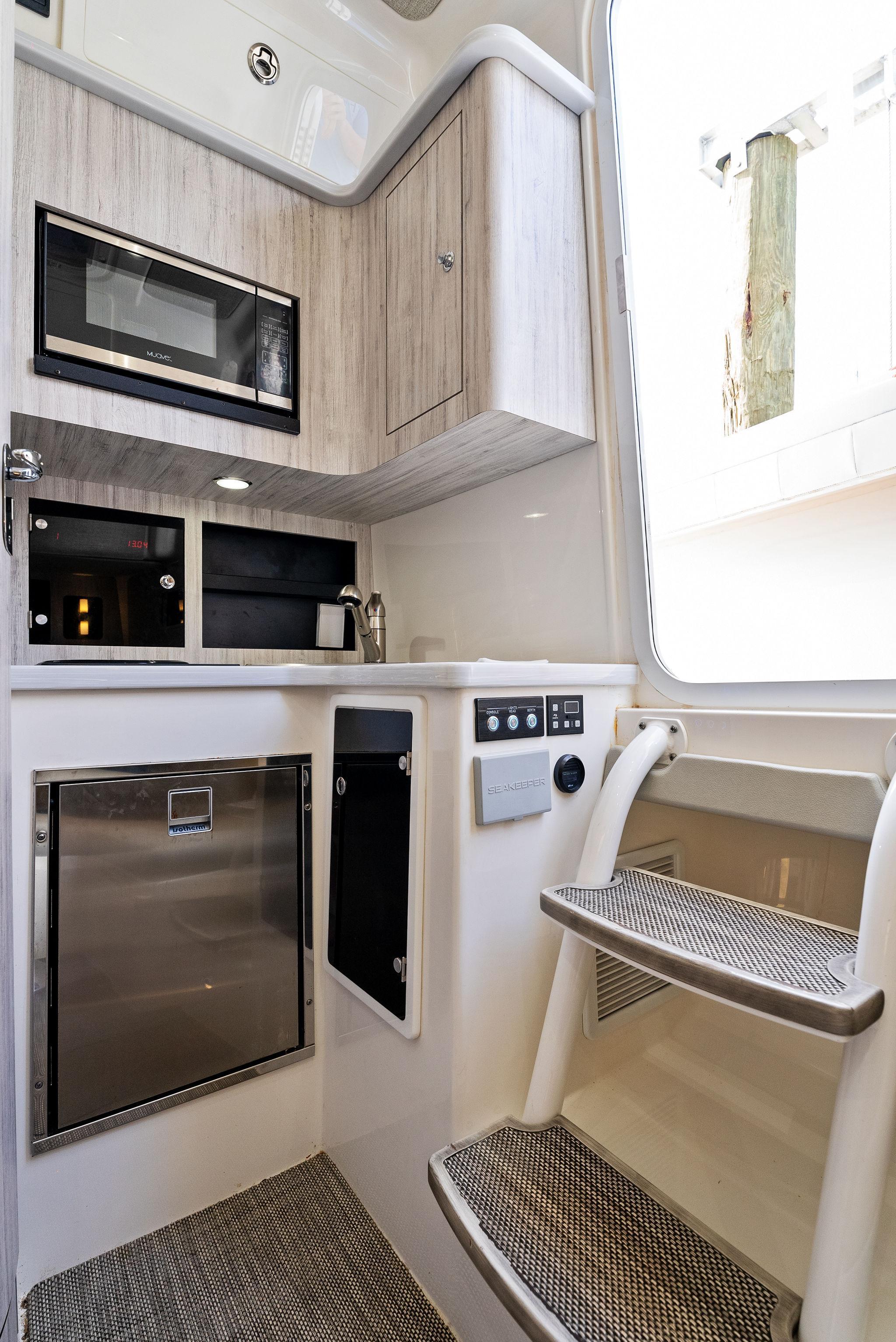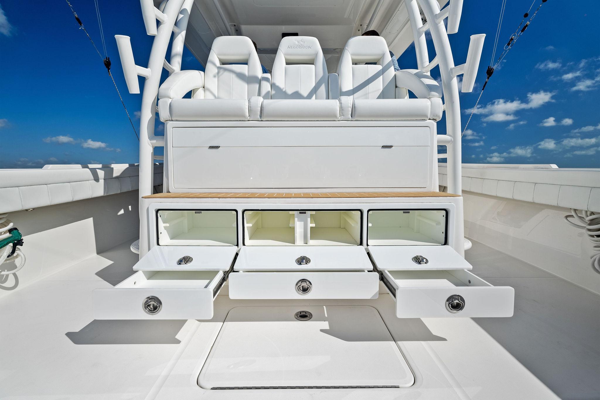 - 3X Deluxe Helm Seating with Mezzanine Seating and Prep Area with Countertop, Electric Grill, Sink, Drawers, and Tackle and Tray Storage Compartments