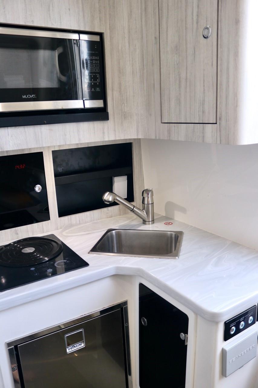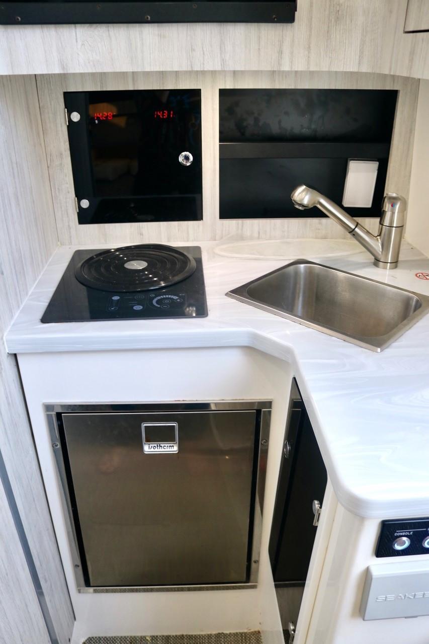 - Galley with Refrigerator, Microwave, Sink, Inductive Cooktop, and Cabinet Storage