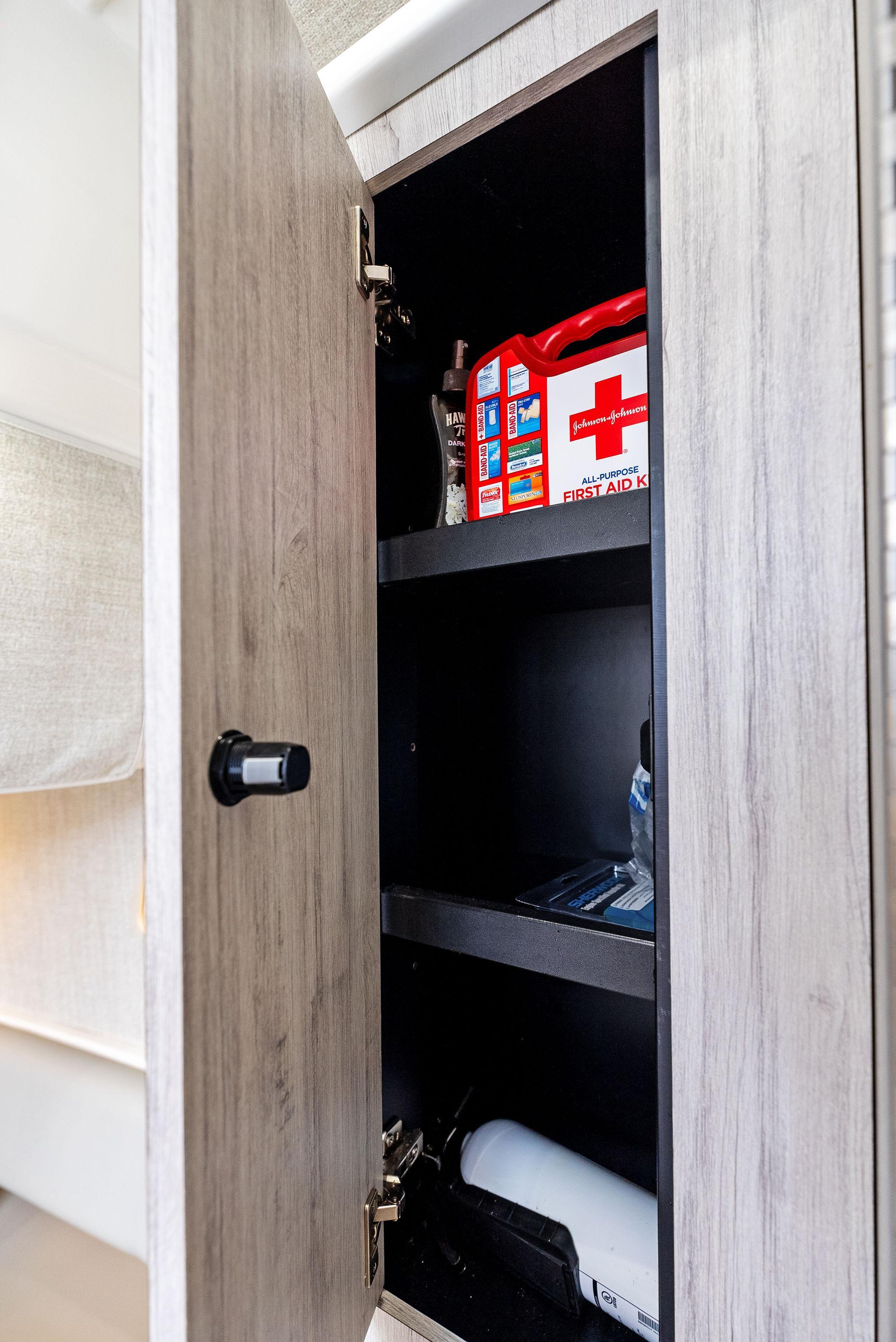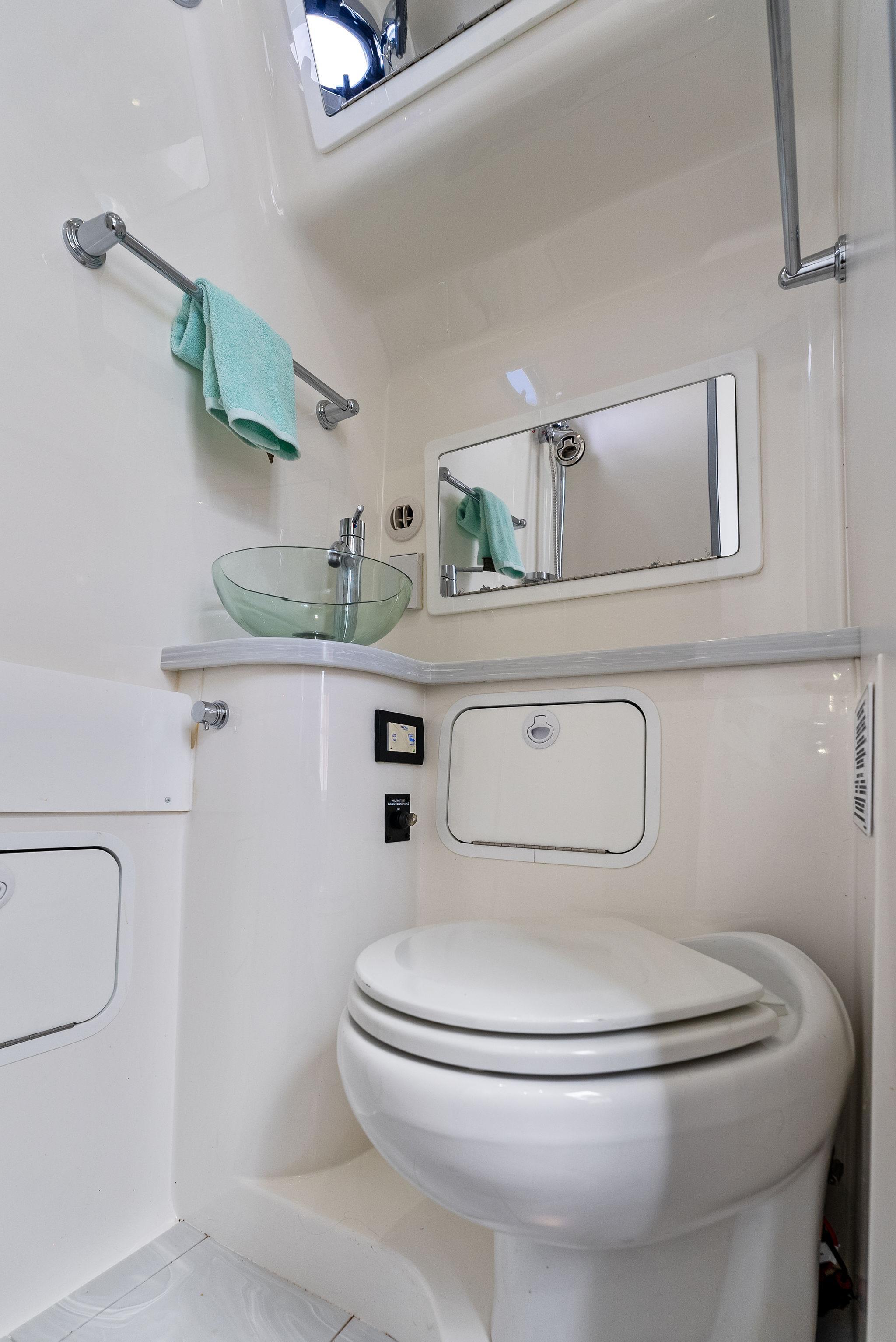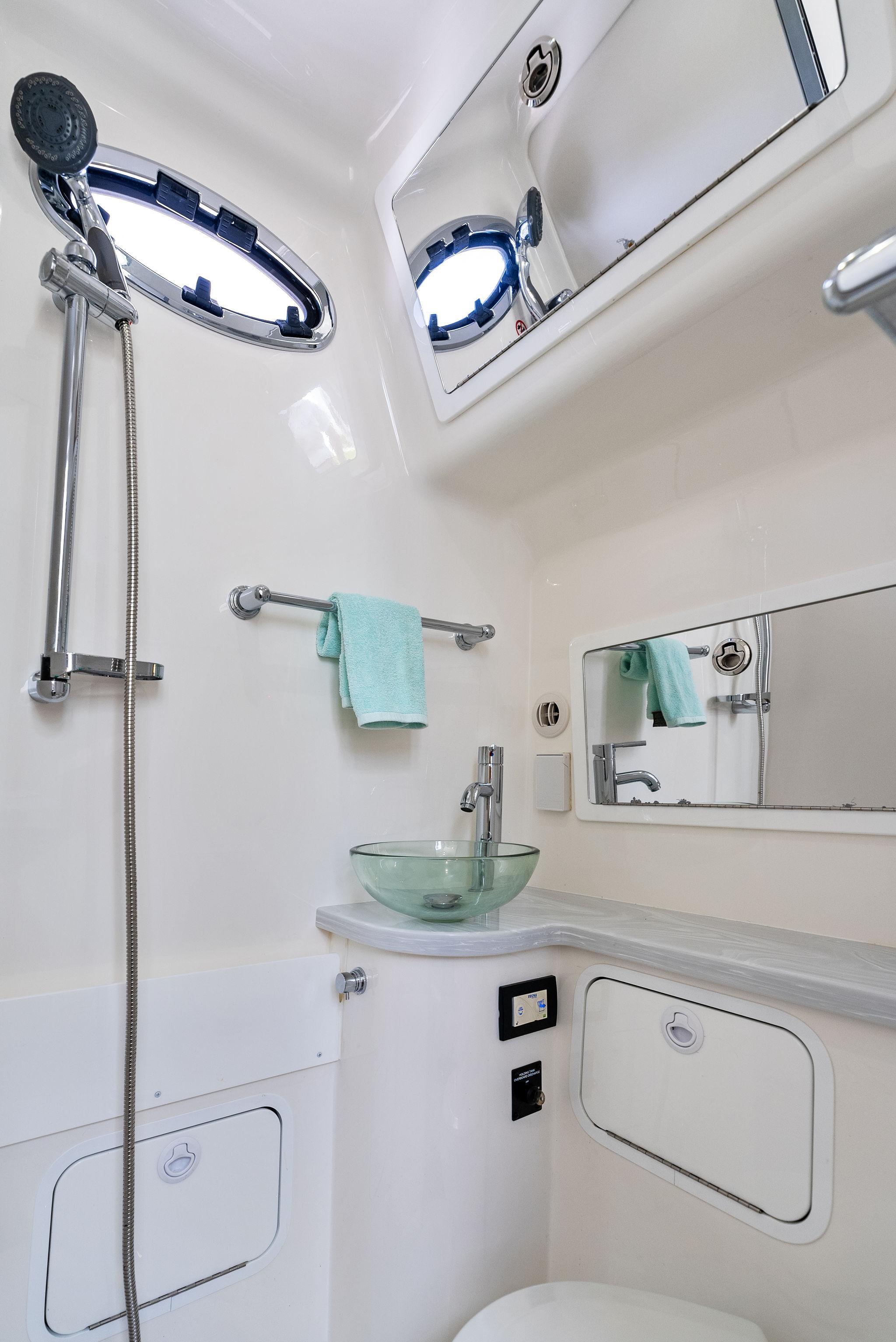 - Stand-Up Head Compartment with Solid Surface Countertop, Sink with Hot Water and Cabinet Storage, Interior Lighting, and Mirror