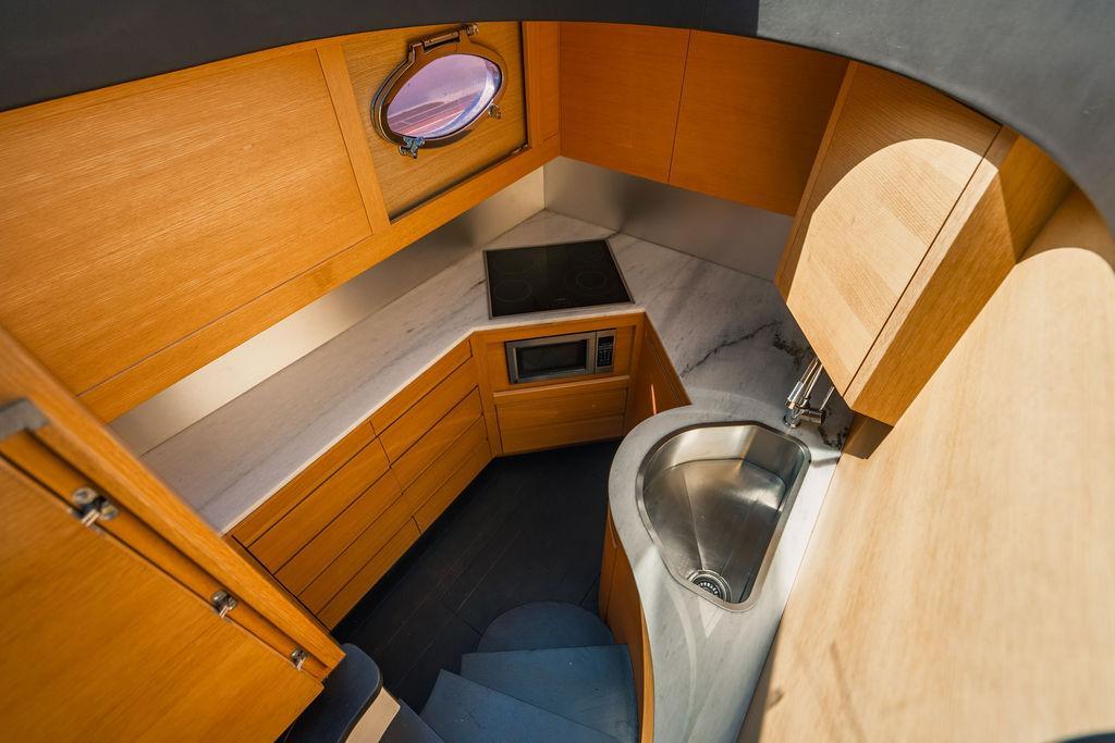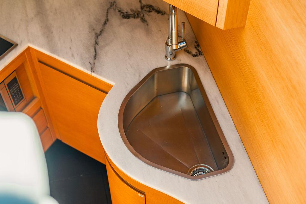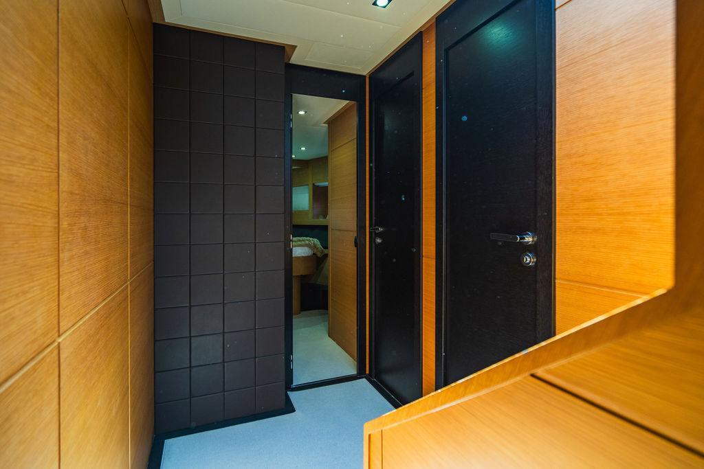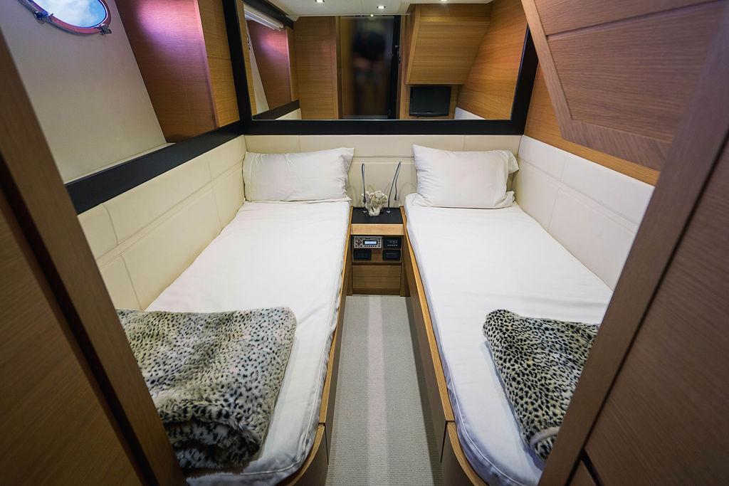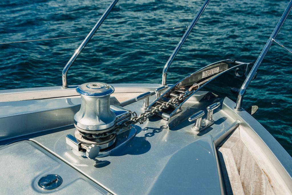 Areas of the deck such as: the bow area, side decks and cockpit are covered with anti-slip finish or polished gelcoat such as hull and superstructure.