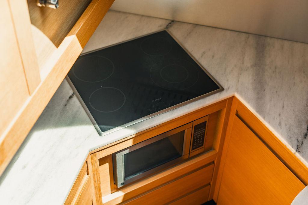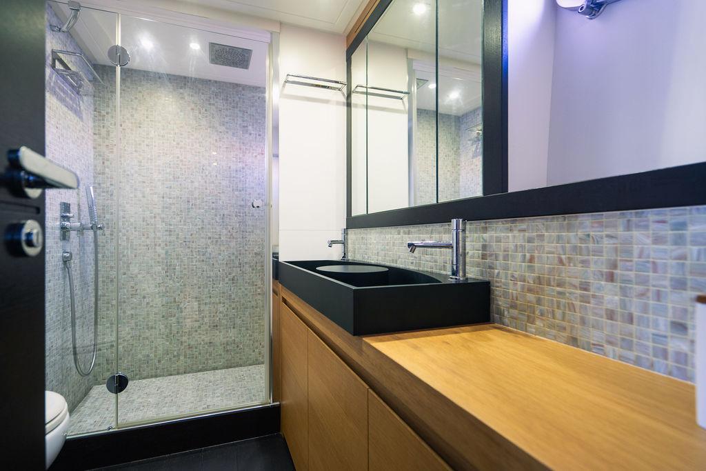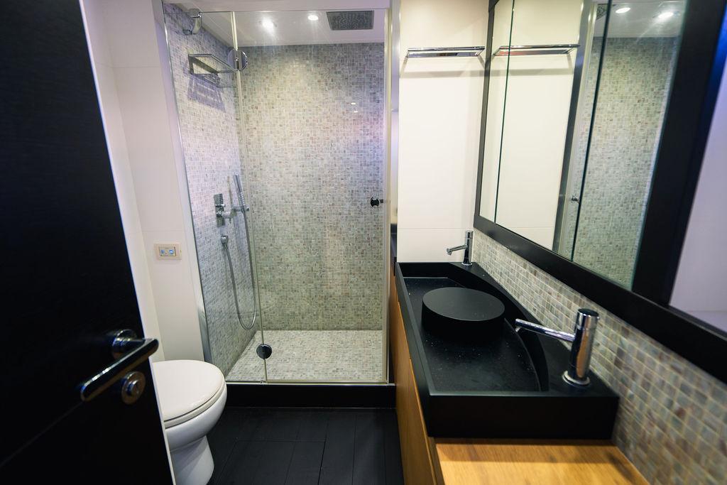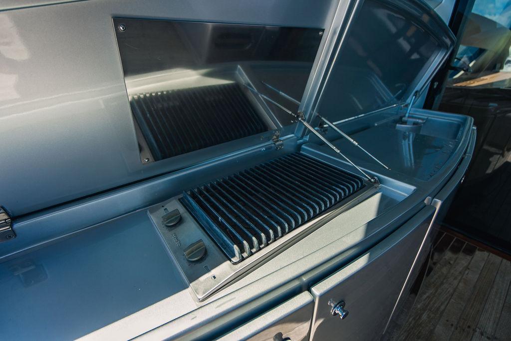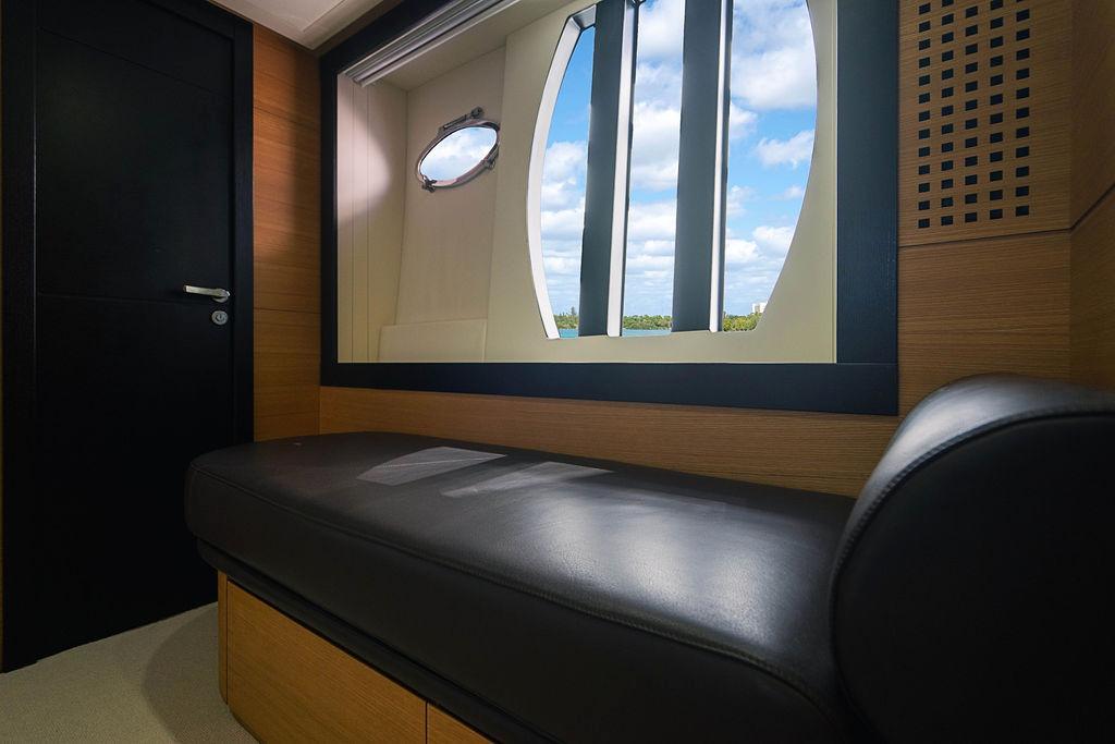 - Hideaway aft sliding door in black painted aluminum and tempered glass