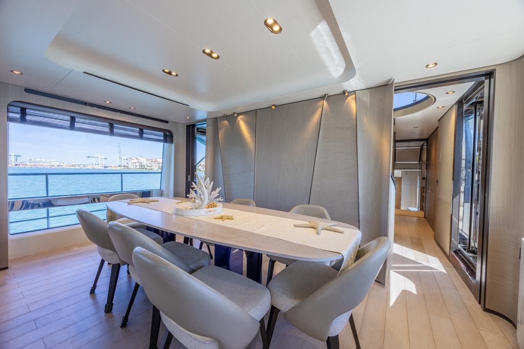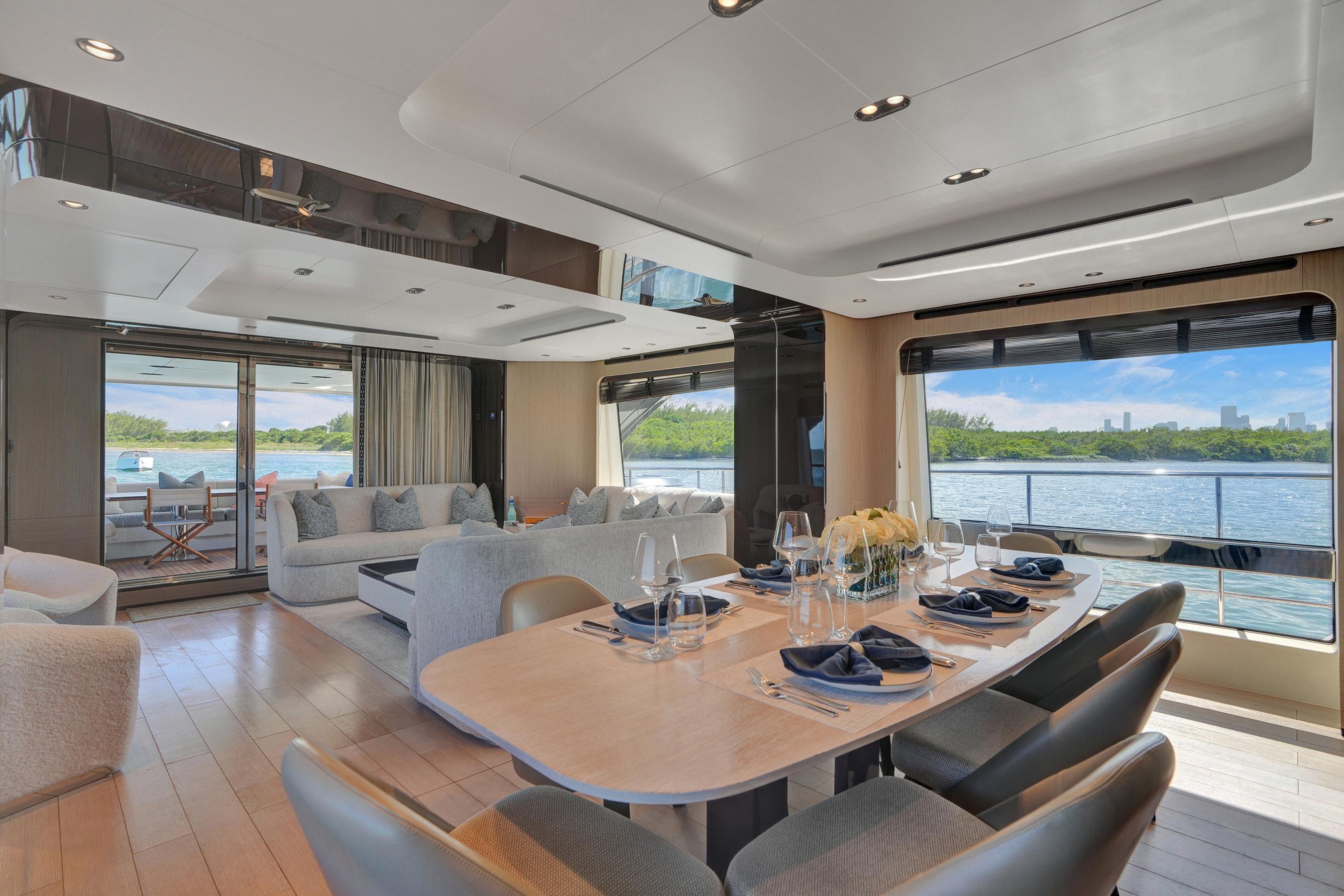 The main deck features an open-plan saloon and dining area, offering panoramic ocean views through floor-to-ceiling windows.