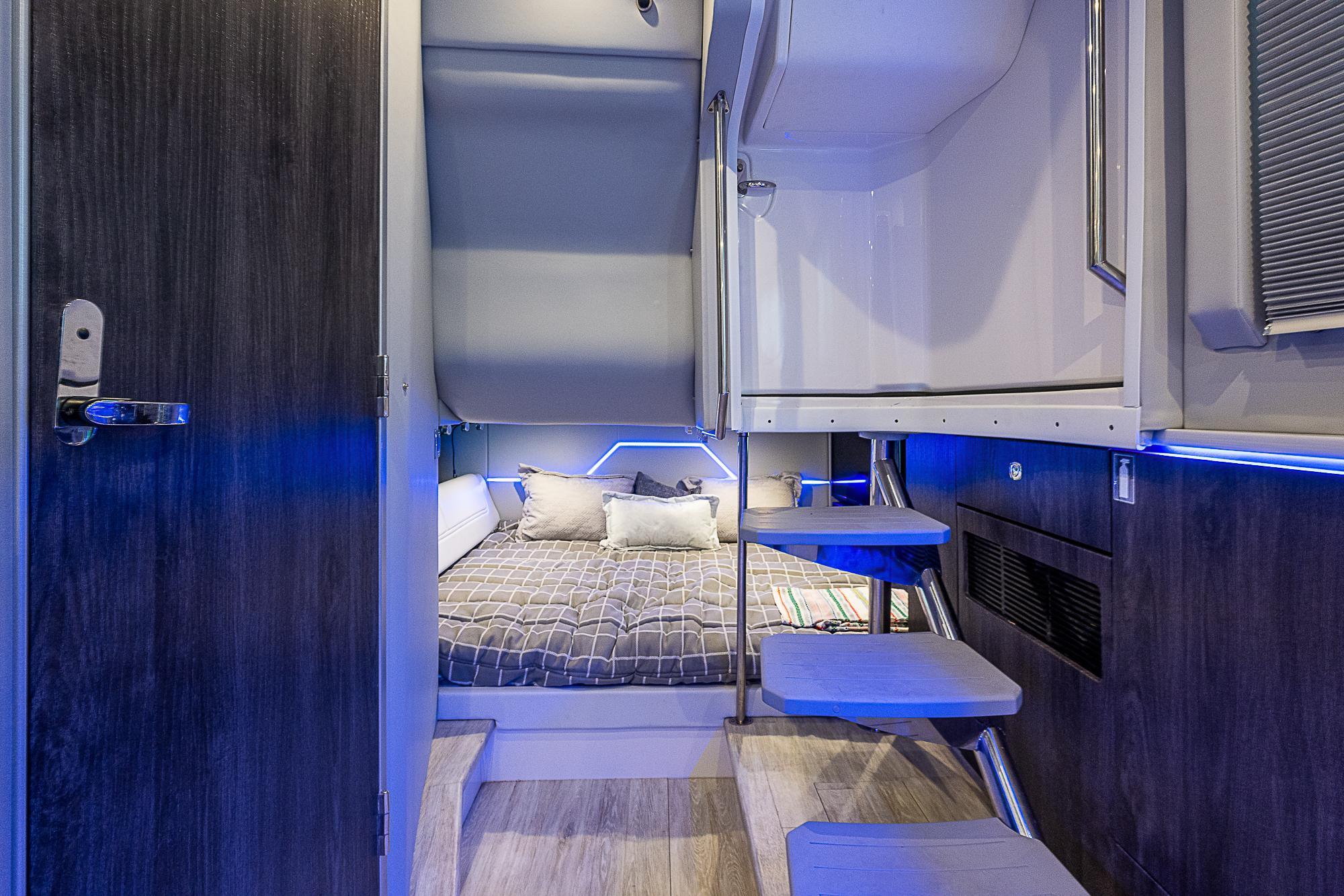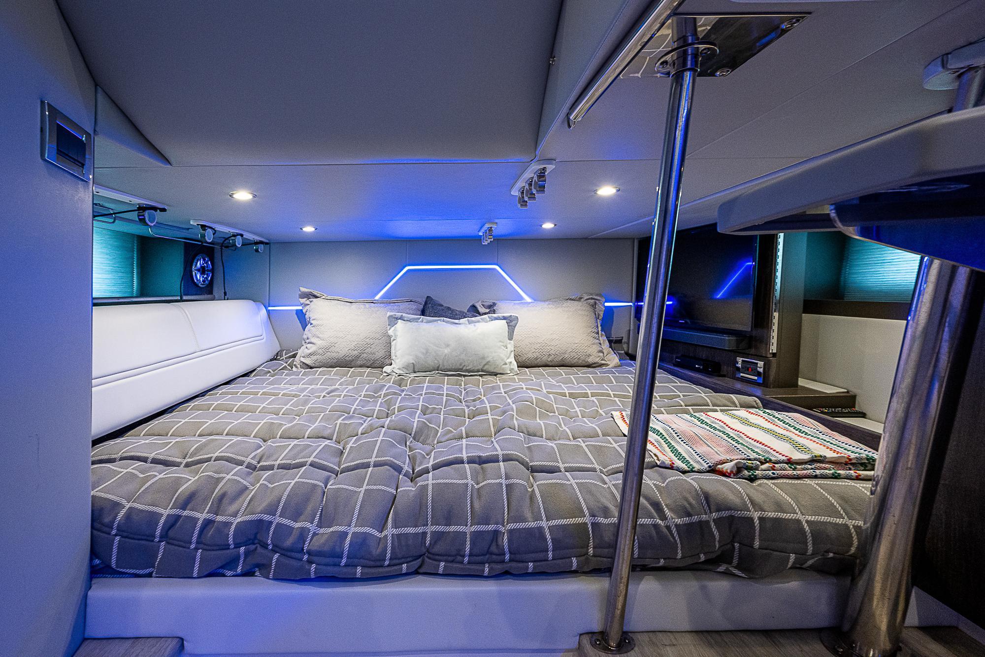 Aft cabin with privacy curtain, queen size Sensus memory foam bed, pillow shams, upholstered headboard, entertainment module, storage unit with 32 inch LED/LCD HDTV with sound bar and Blu-ray player with Wi-Fi.