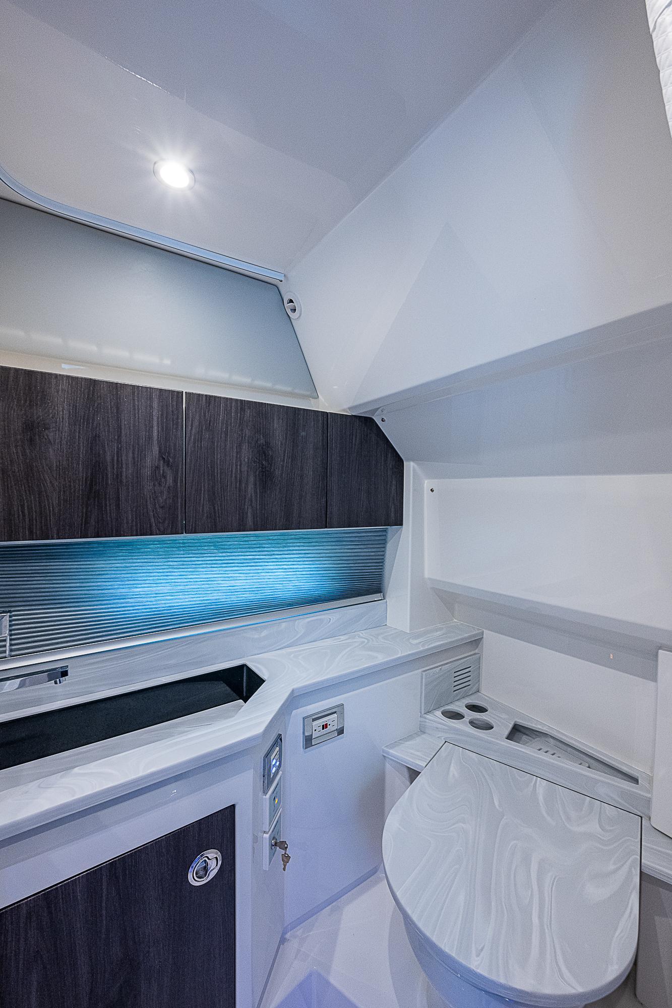 Molded private head compartment with vanity, color coordinated Finishes, Corian countertop, custom molded with wall mounted faucet, porcelain Flush and Forget vacuflush head with 43 gallon holding tank and dockside pump out, Shower with Corian seat, exhaust fan and nightlight.