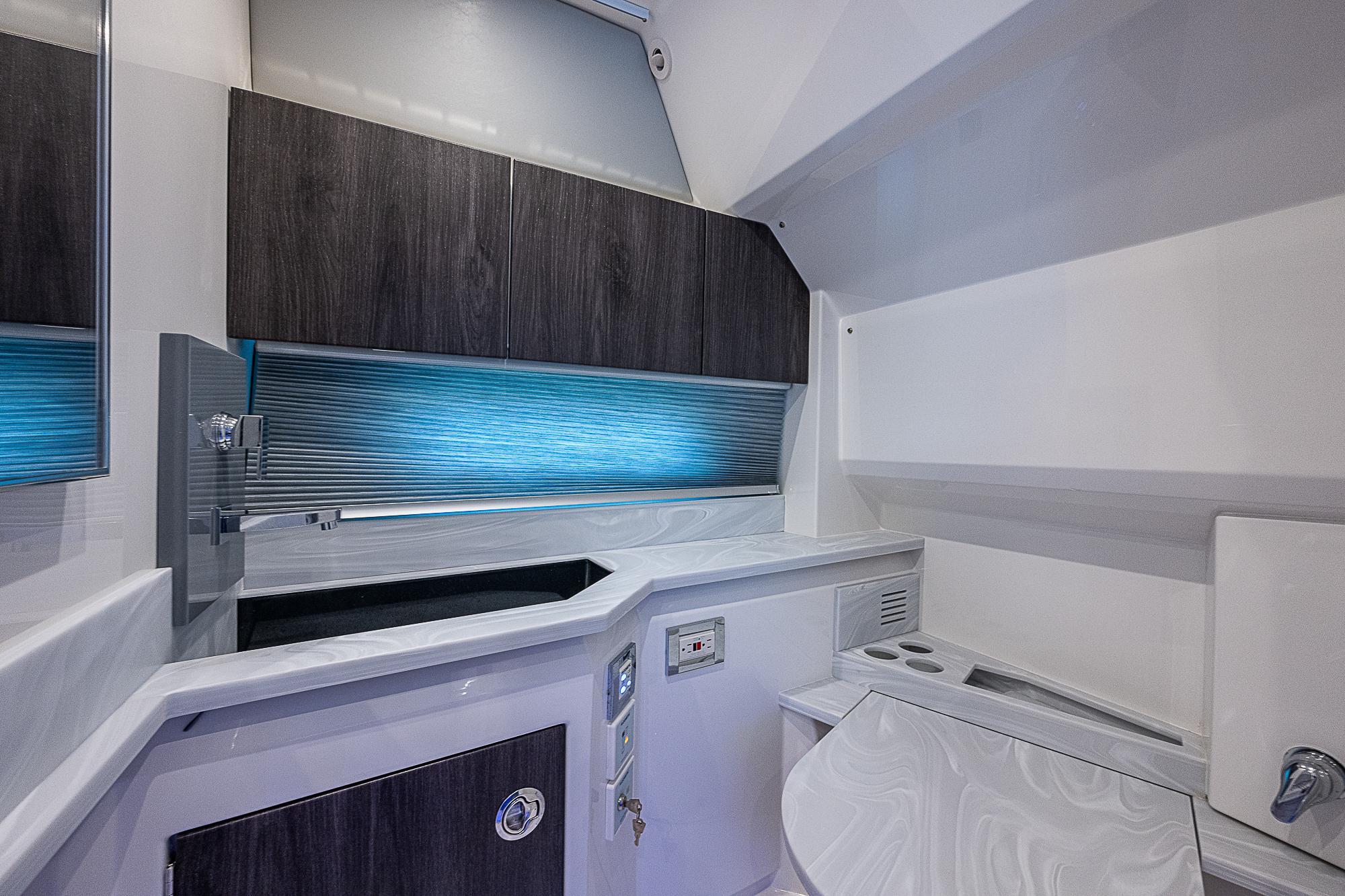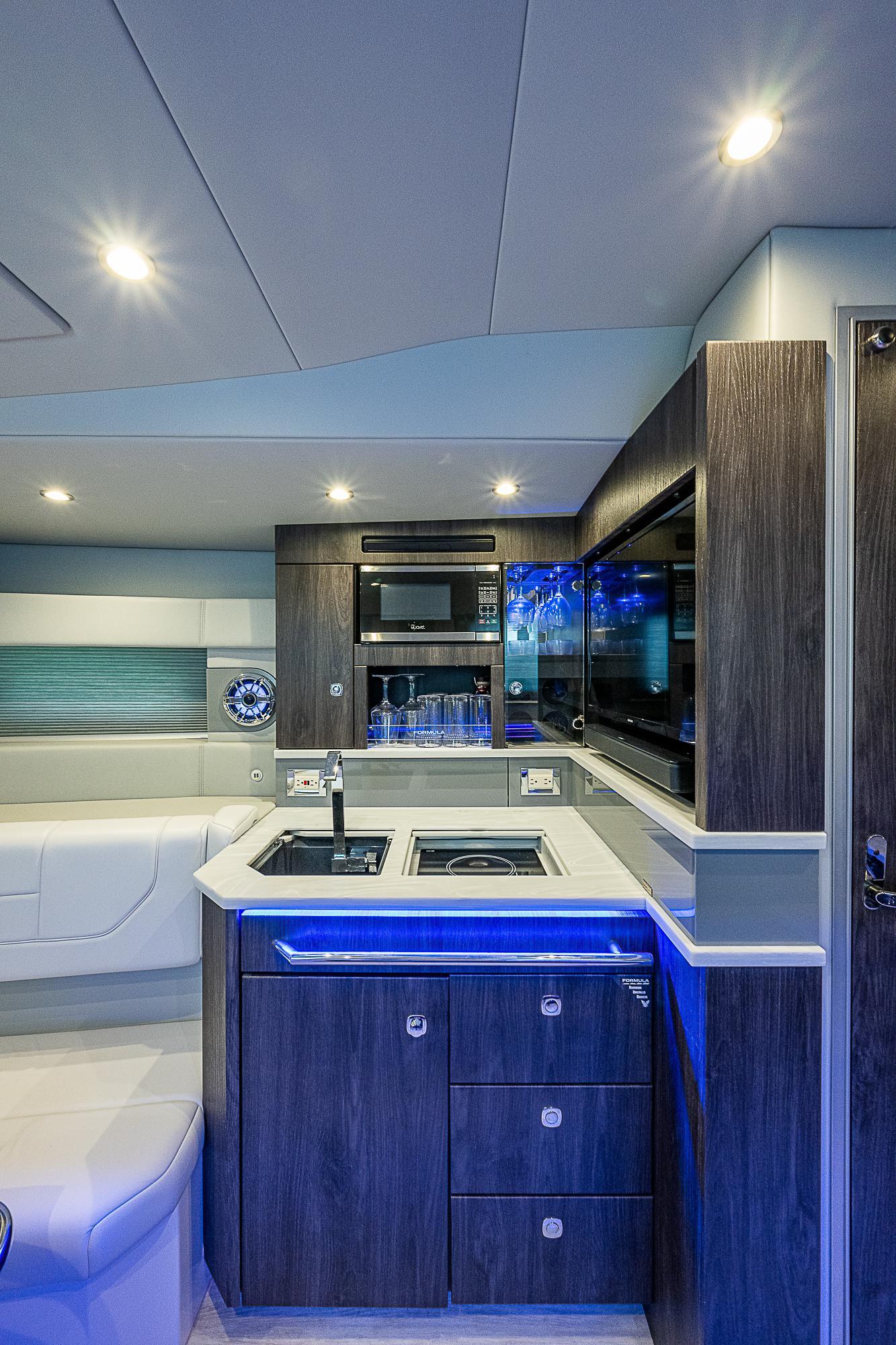 Complete galley in color coordinated finish with storage and hard wood dovetail drawers, blue LED lit cabinet showcase with tempered stemware and tumblers, Corian countertop, Corian sink with glide away Corian self cover.