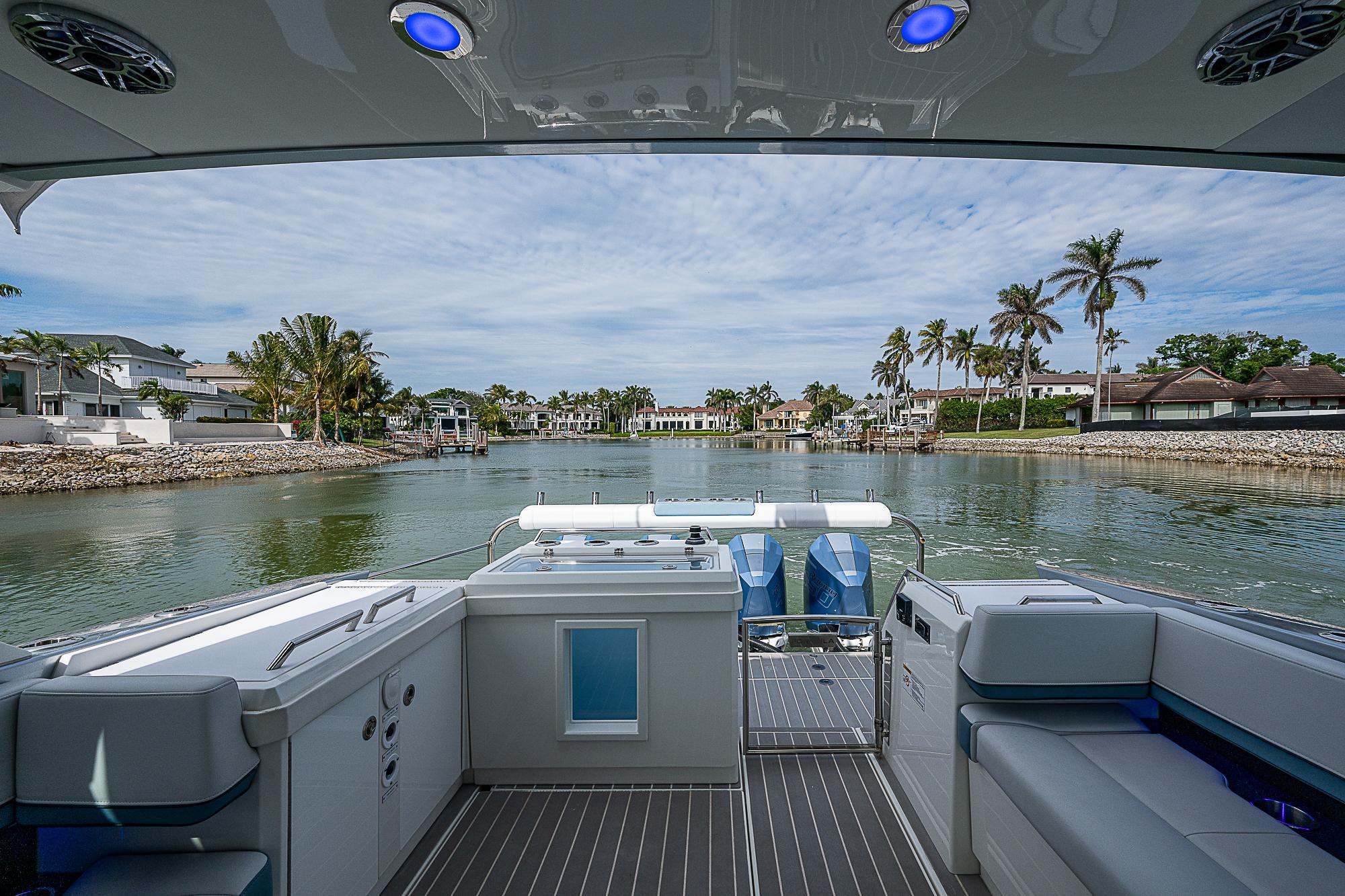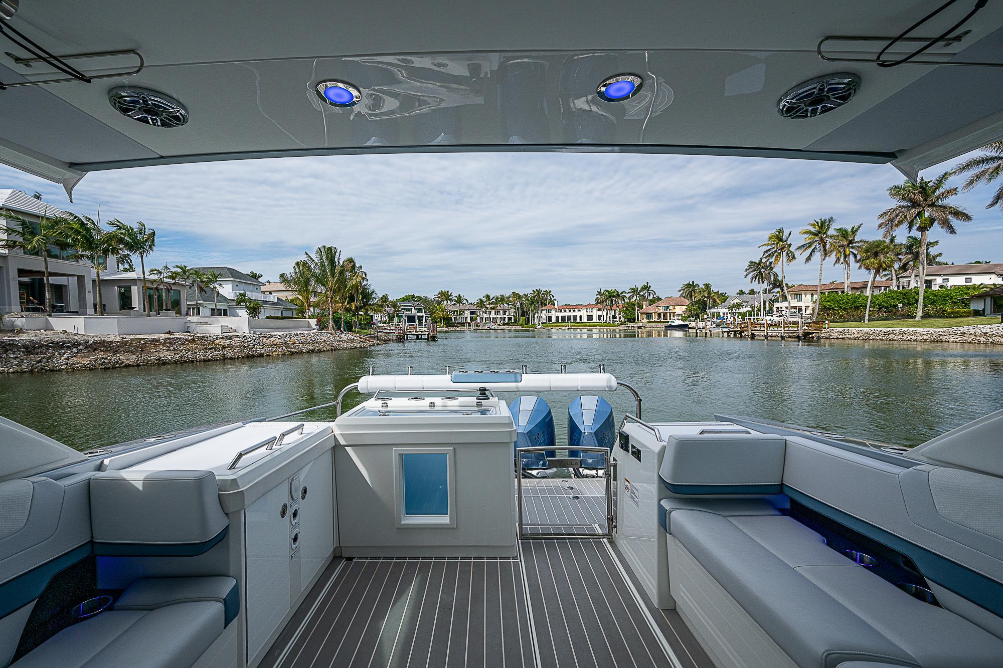 Rockford Fosgate waterproof transom mounted stereo control with JL audio speakers. Cockpit blue LED lighting system.