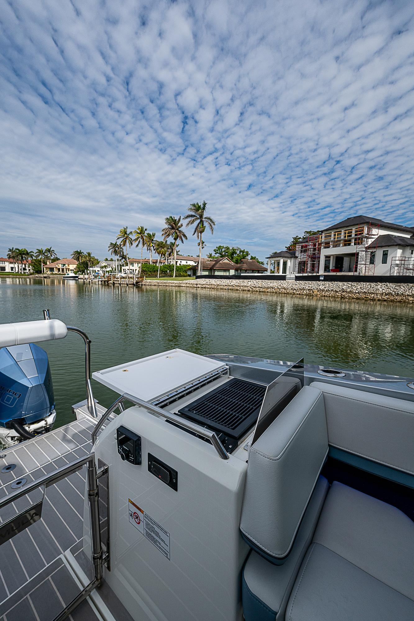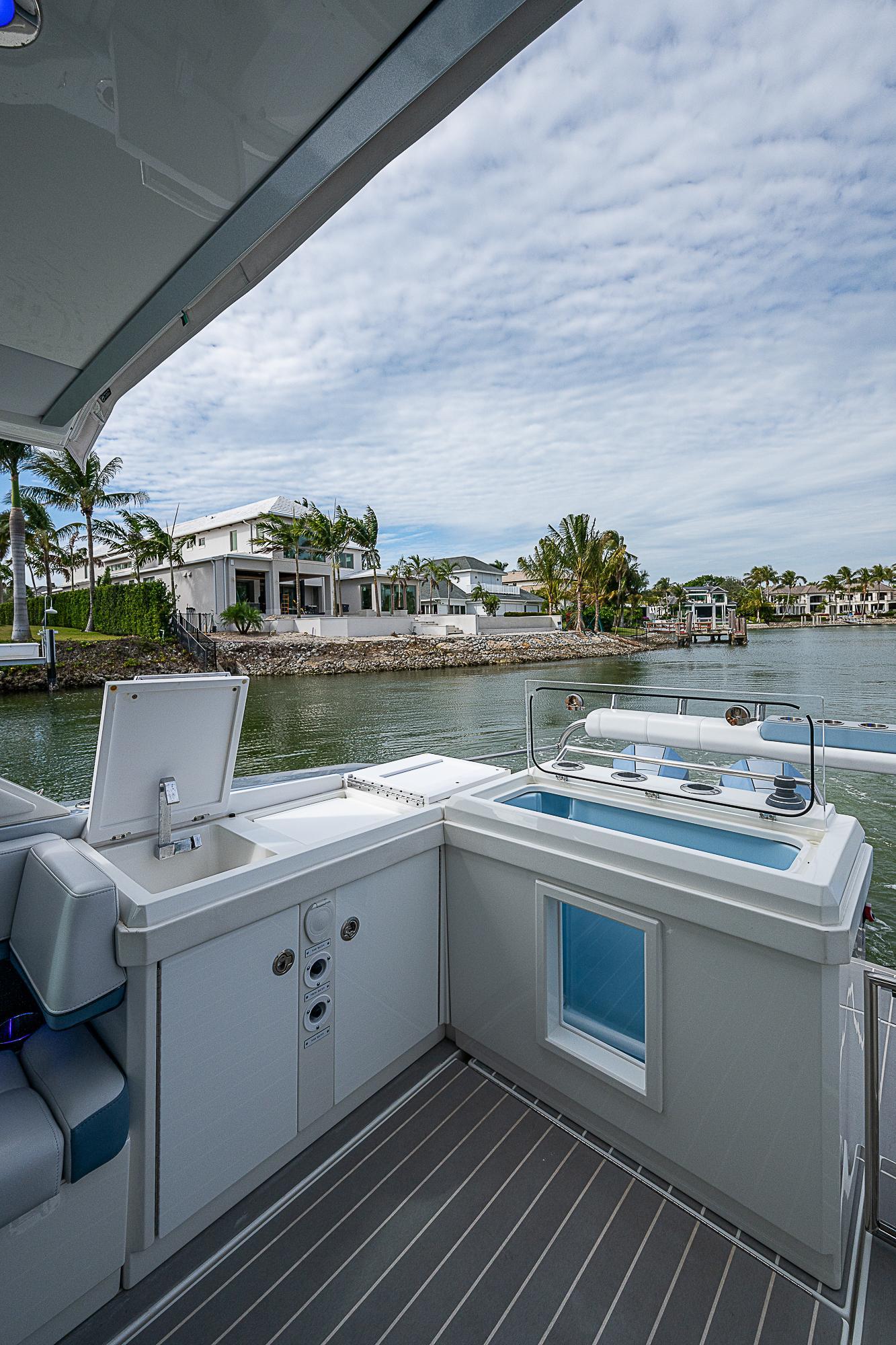 Bait prep station with fresh water sink, paper towel holder, cutting station with removable cutting board, retractable raw water spray wash down hose, tackle drawer and fishing supply storage and accessory switch panel.