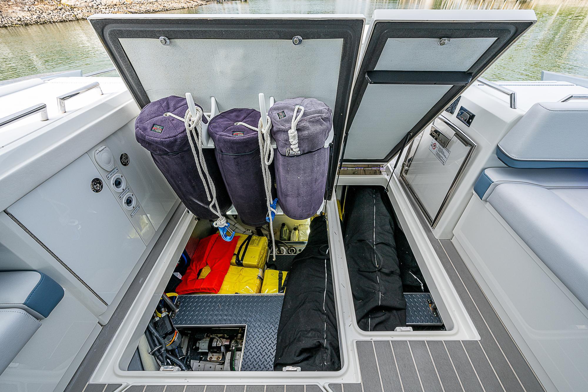 Port side gear lockers with dedicated storage for dock lines and on deck television.
