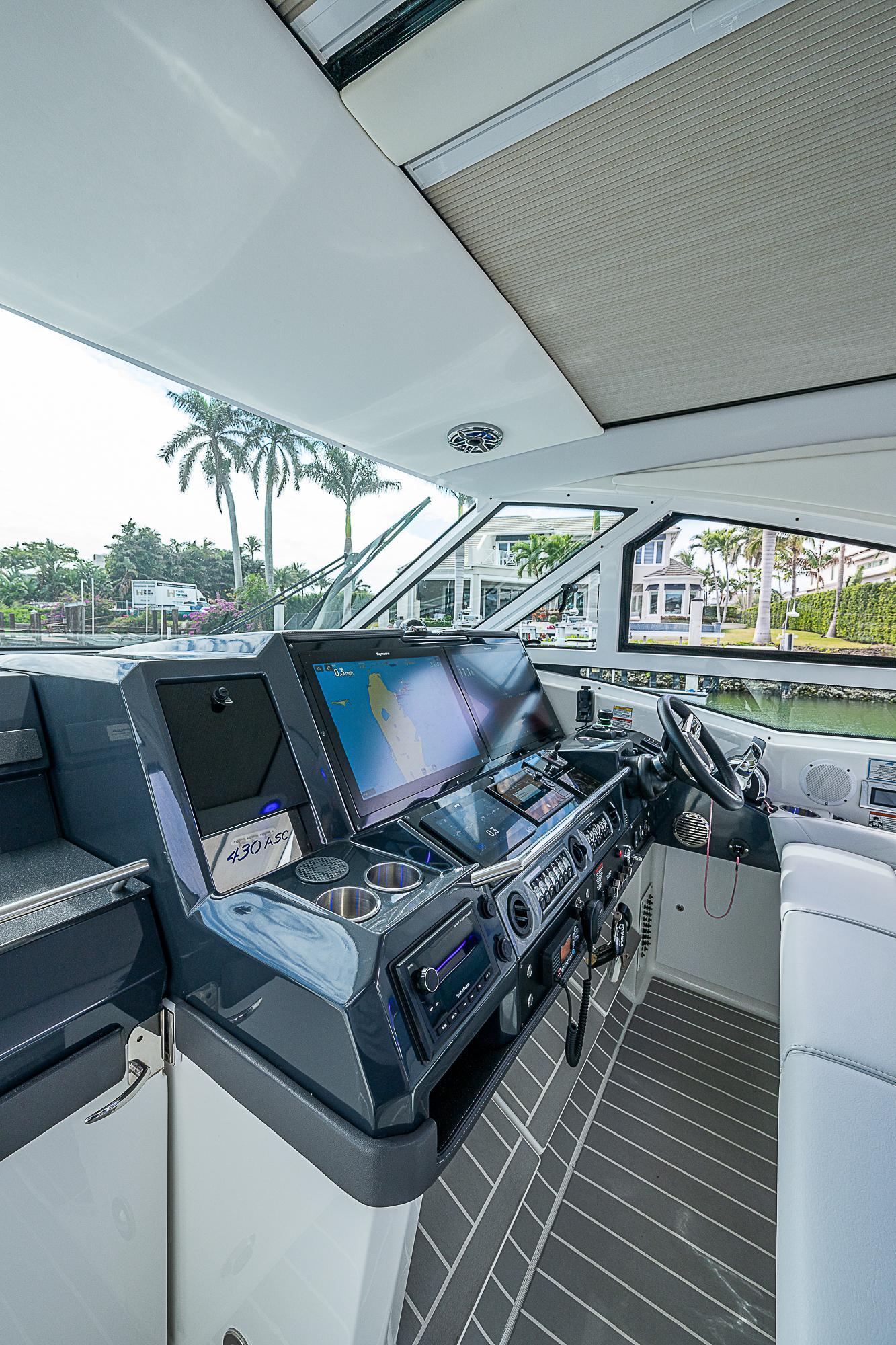 Molded composite dash with Ritchie compass, Raymarine twin Axiom XL24GPS widescreen color display/Chart plotters with depth sounder, illuminated waterproof accessory rocker switches, ETA circuit breakers, auxiliary 12V outlet, dual USB charging ports, wireless phone charger,
