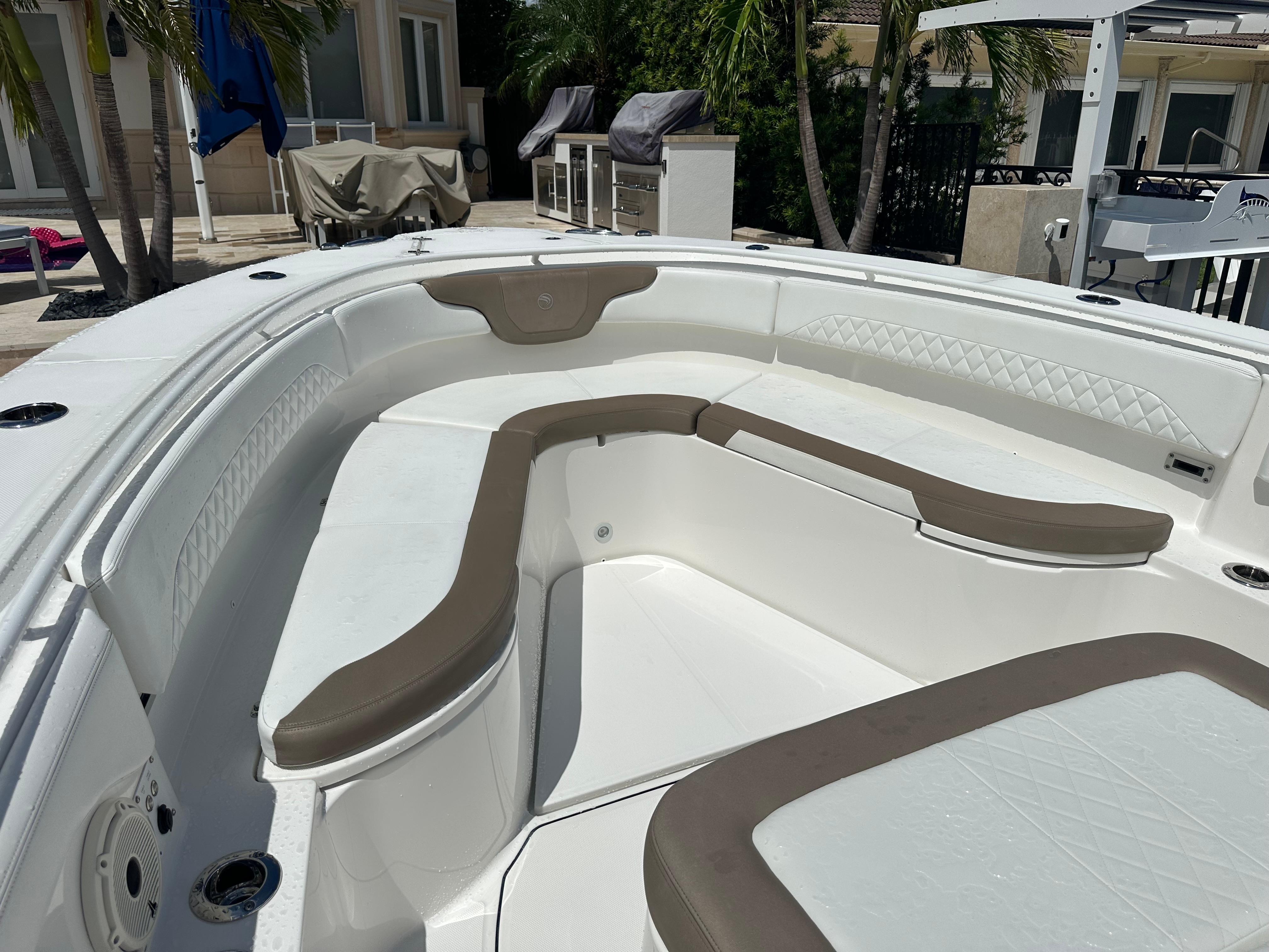 - Large lounge in front of helm w/ cup holders, 12V outlets on both sides