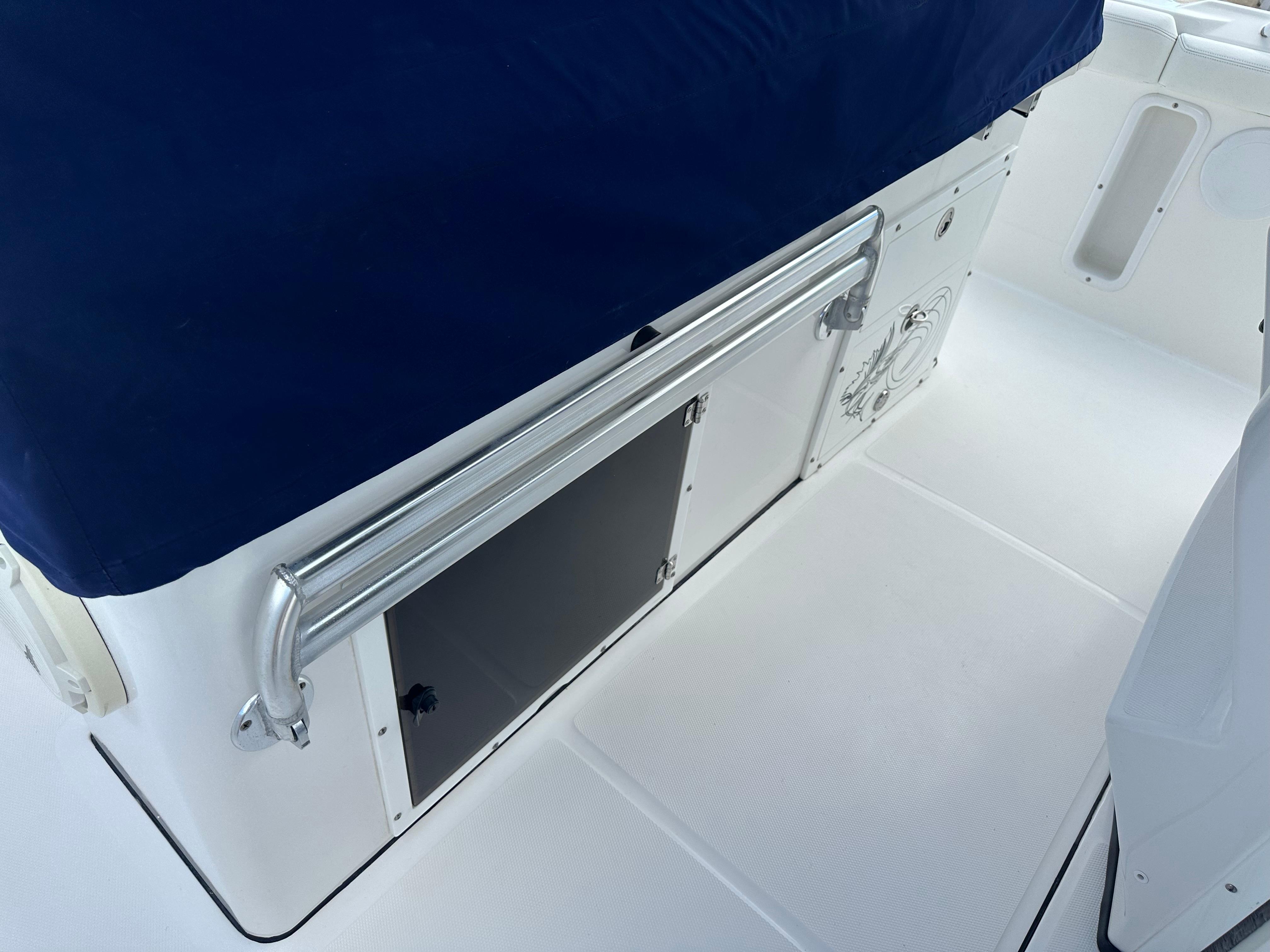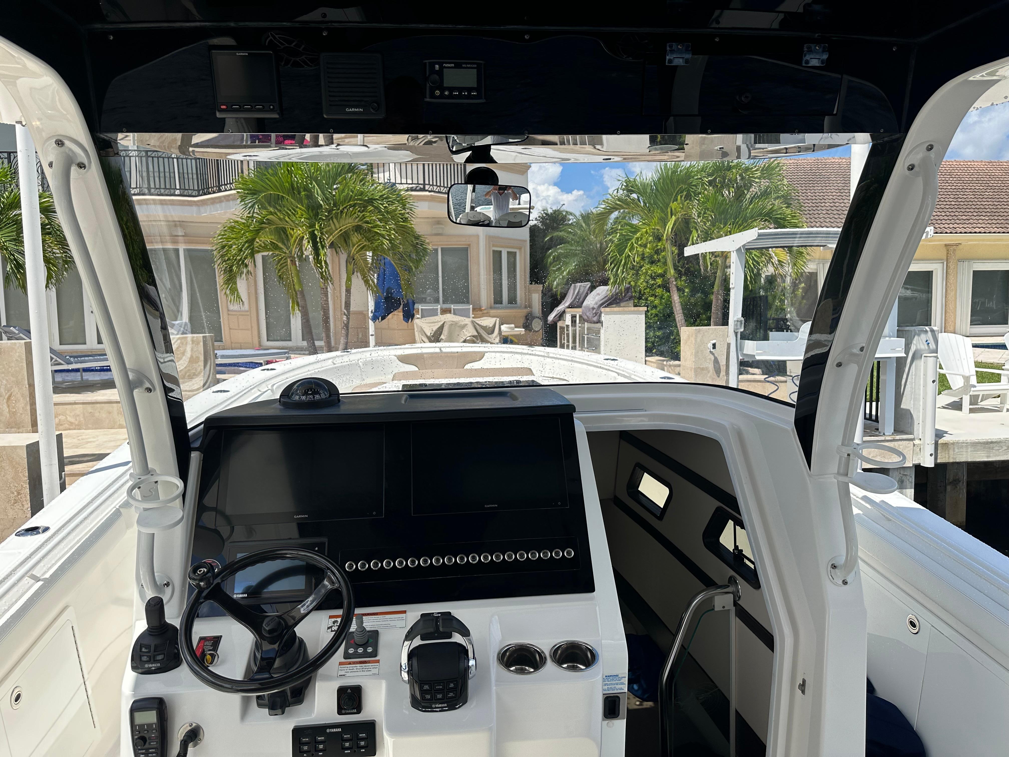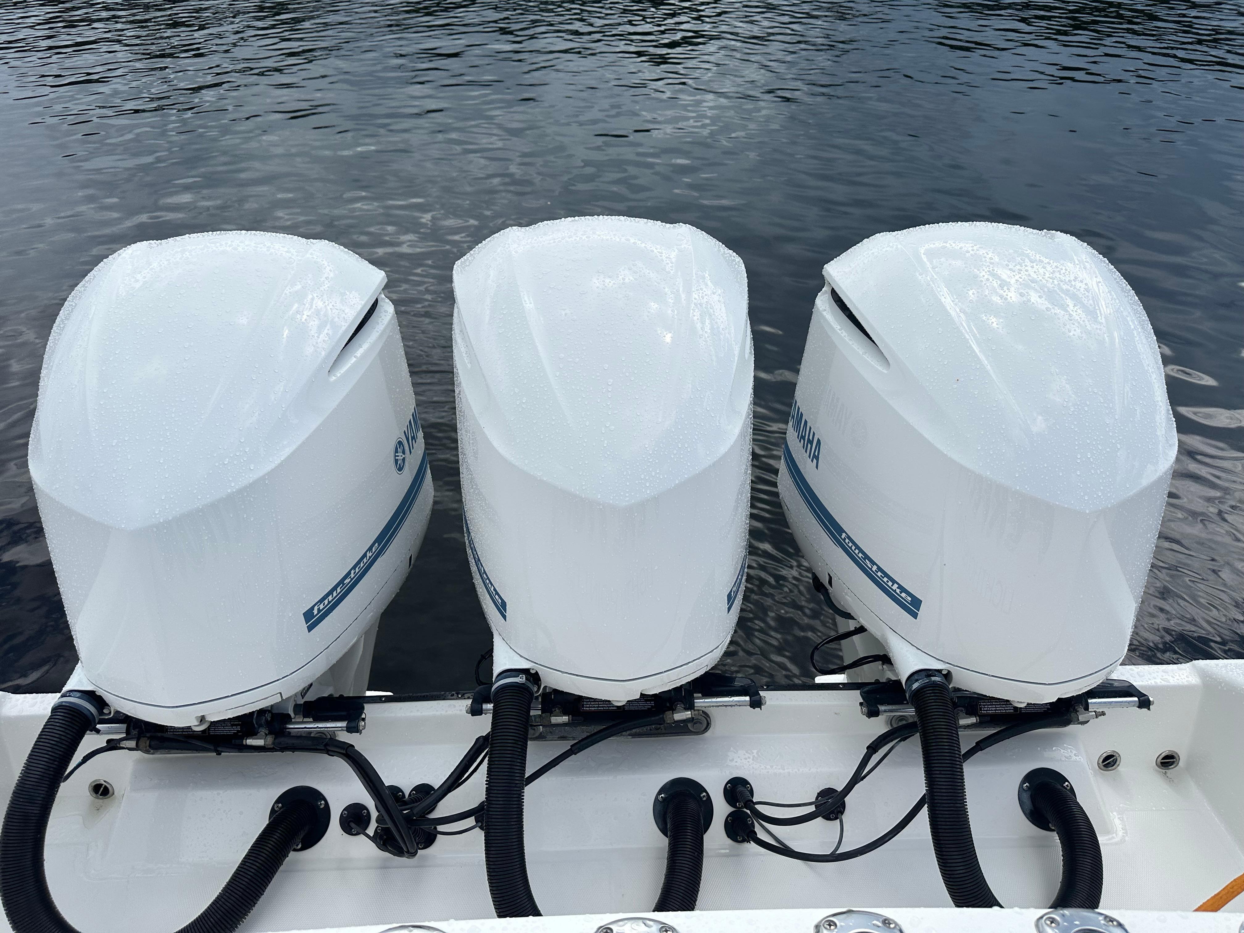 The Edgewater 370 CC is the spin off from the 368 CC which was first introduced in 2016! This big beam center console (11' 3") boasts a nice standup cabin with nice amenities. The walk in cabin provides plenty of room with a berth for two, a galley and an enclosed head. There is plenty of outdoor seating from the two fold out aft bench seats to the large lounge over the cabin. To add more seating, there is forward seating and has a hydraulic table that will recess in the floor. To satisfy the angler, there is a 45 gallon live well on the transom and two in deck fish boxes. Like many of today's center console there is a dive door to port. The Edgewater hull construction is built on a super light layup process and is unsinkable. The 2020 370 Edgewater, renowned for its robust build, pairs seamlessly with triple Yamaha 300 engines.