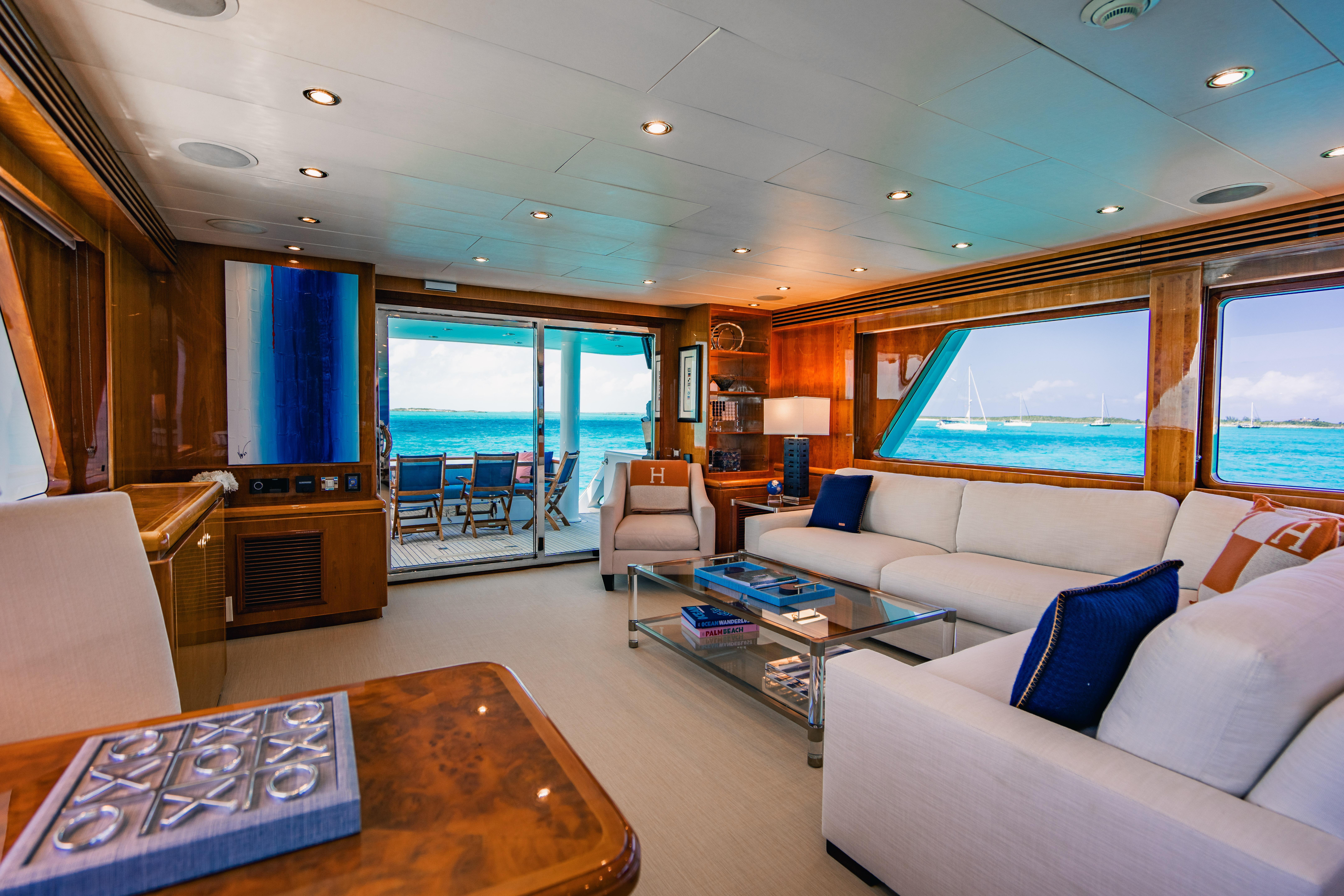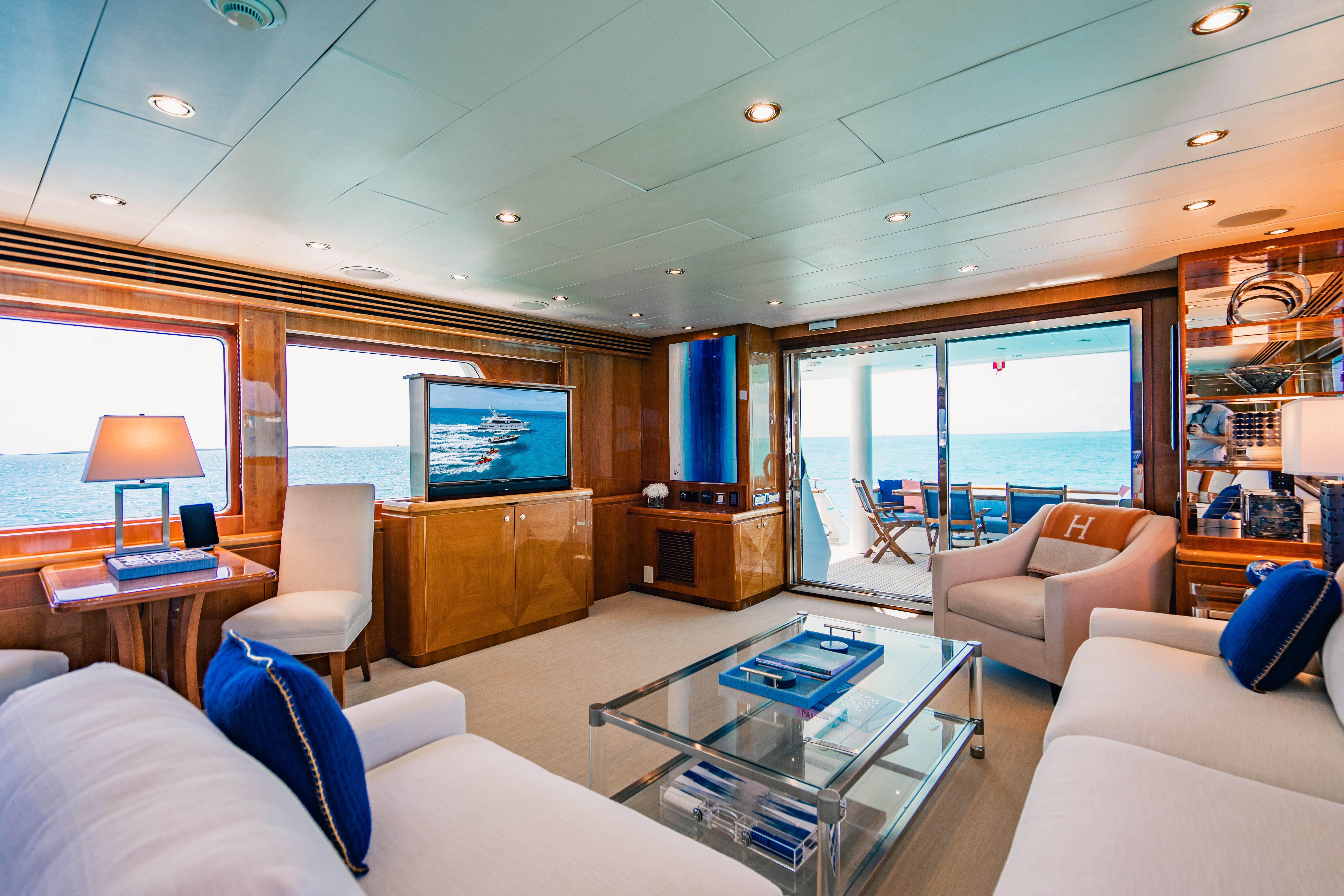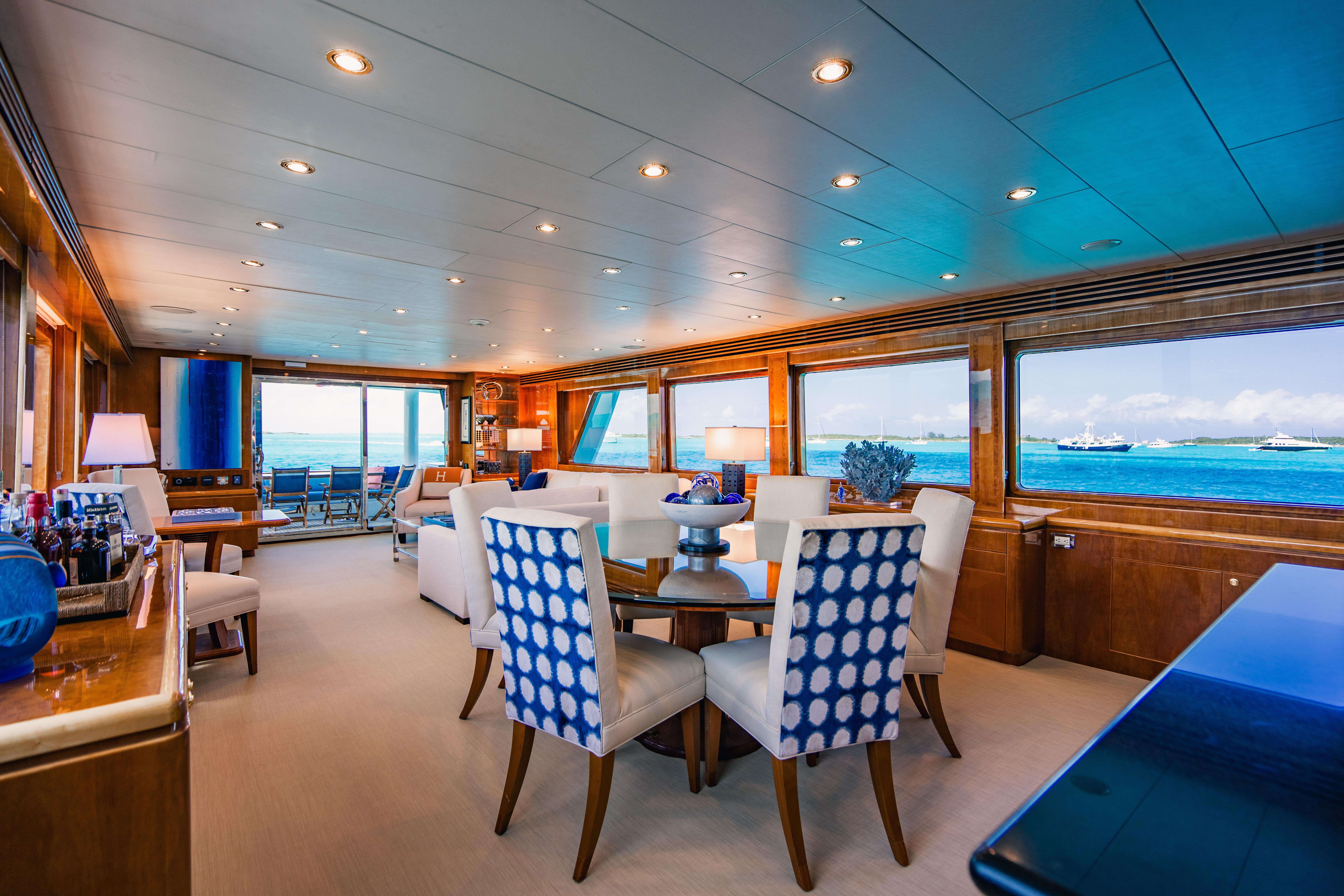 Entered from the centered aft salon air door, the salon stretches 27 feet forward and includes a formal dining area. There is a new custom floor that provides a bright, modern look.