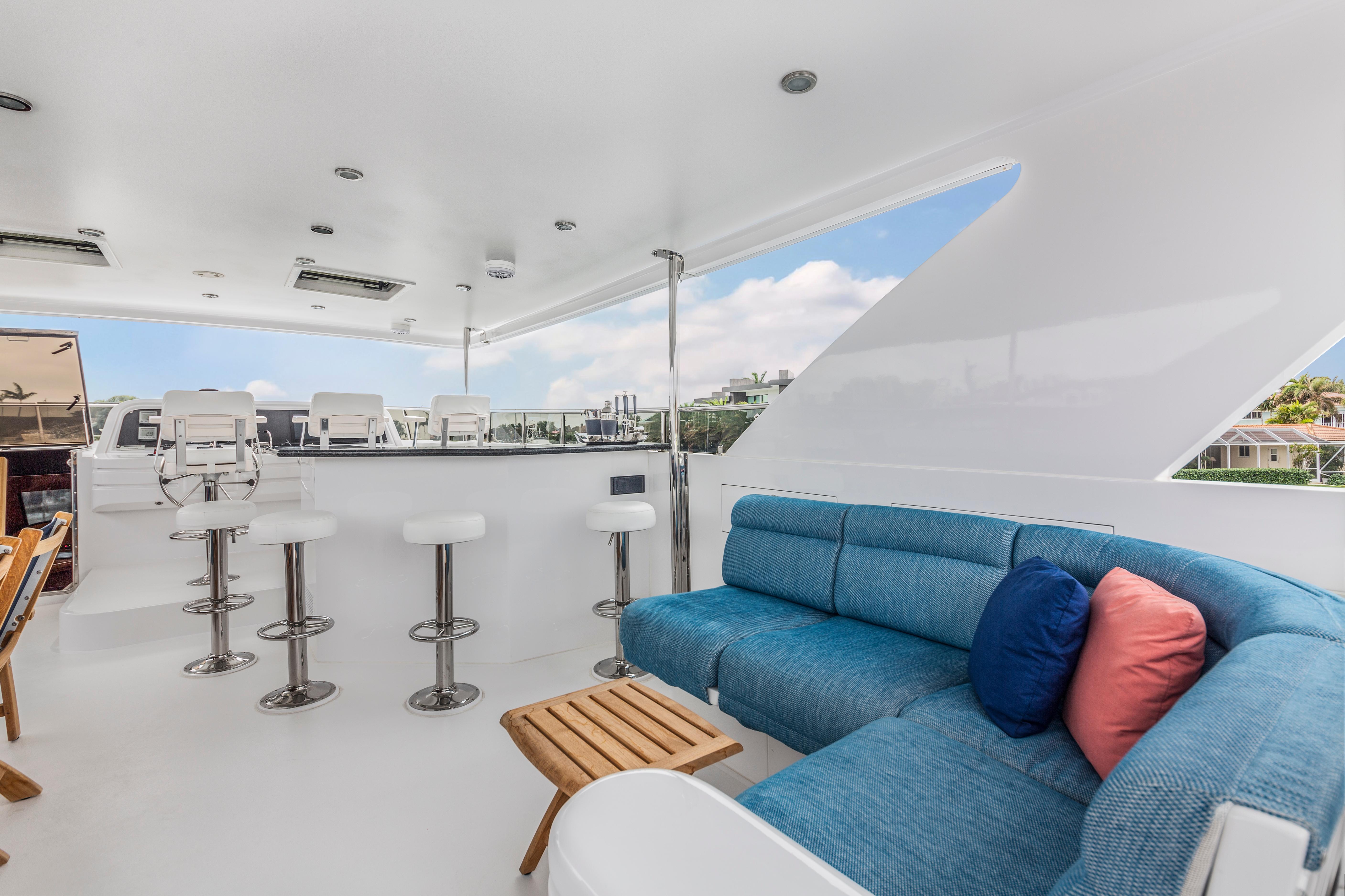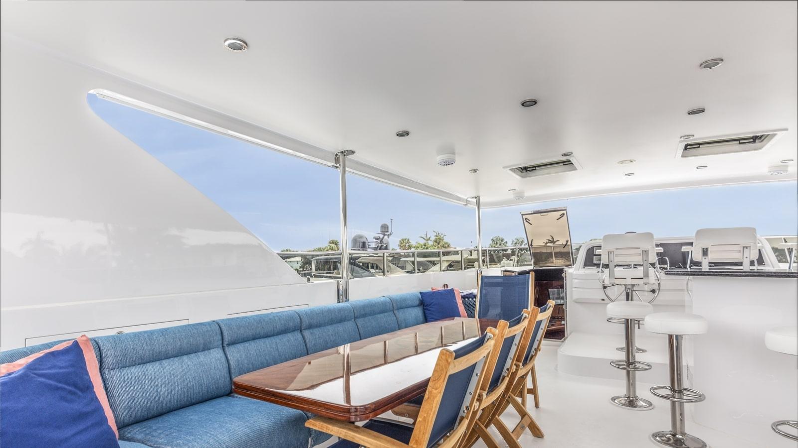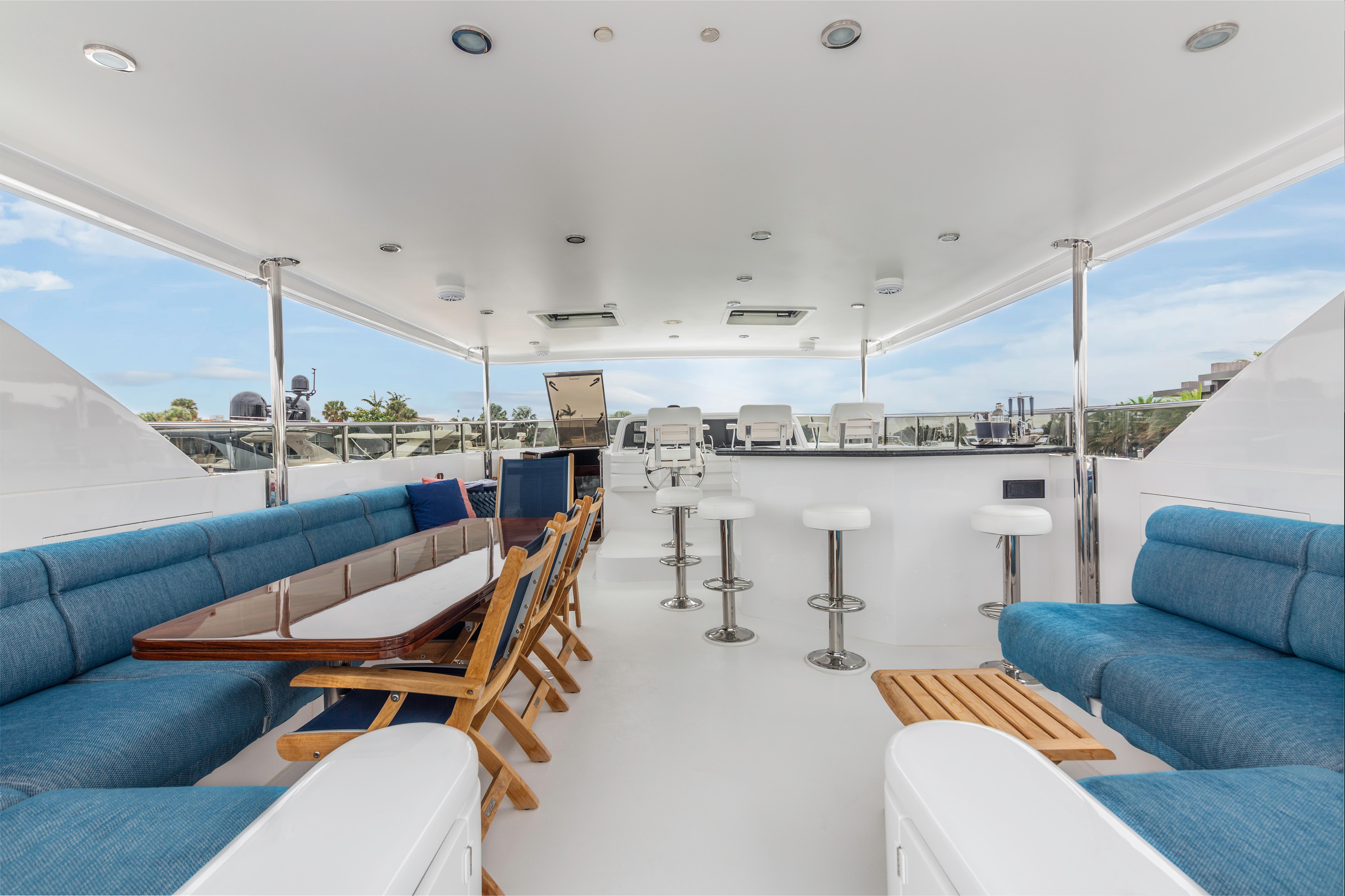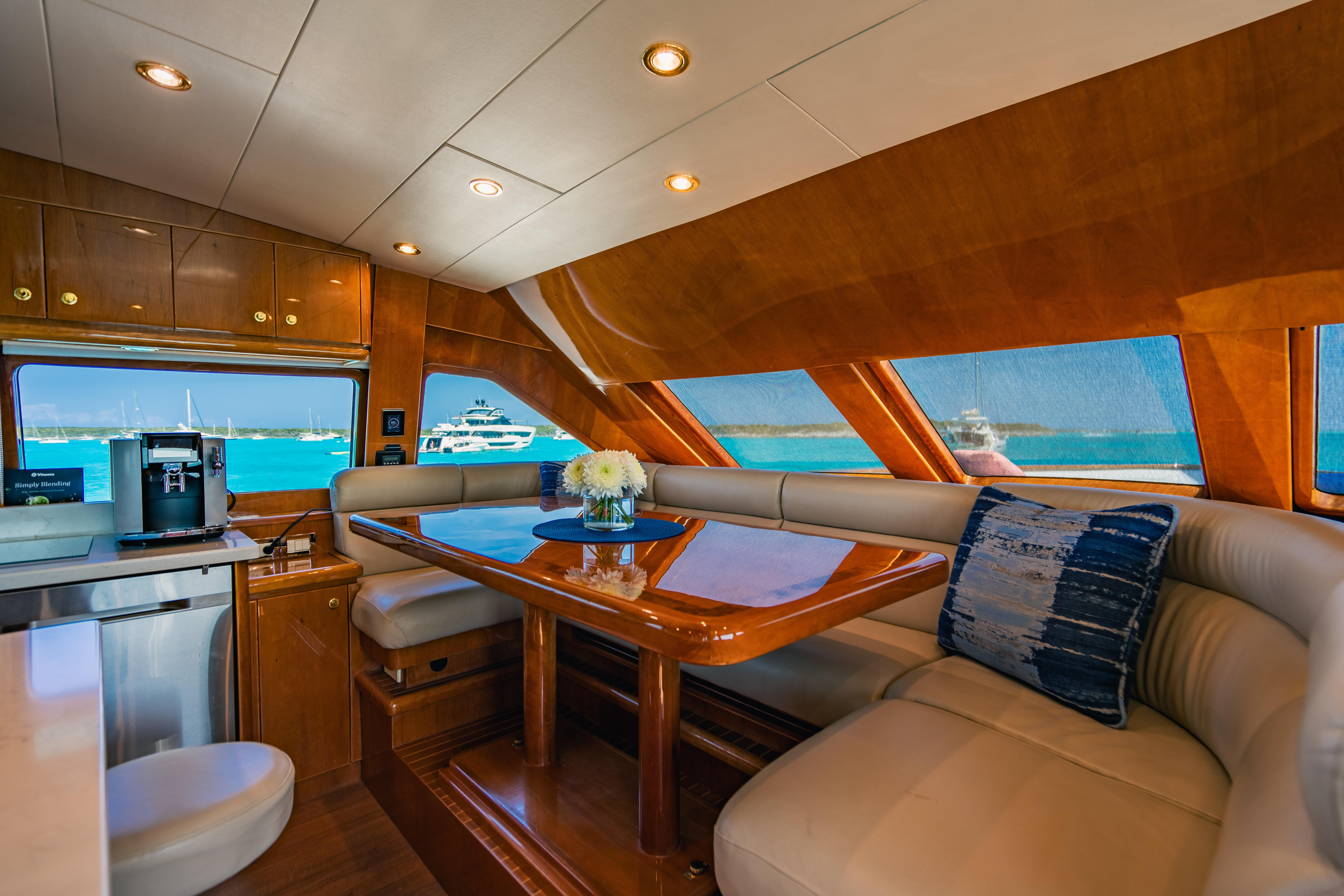 Entered from the centered aft salon air door, the salon stretches 27 feet forward and includes a formal dining area. There is a new custom floor that provides a bright, modern look.