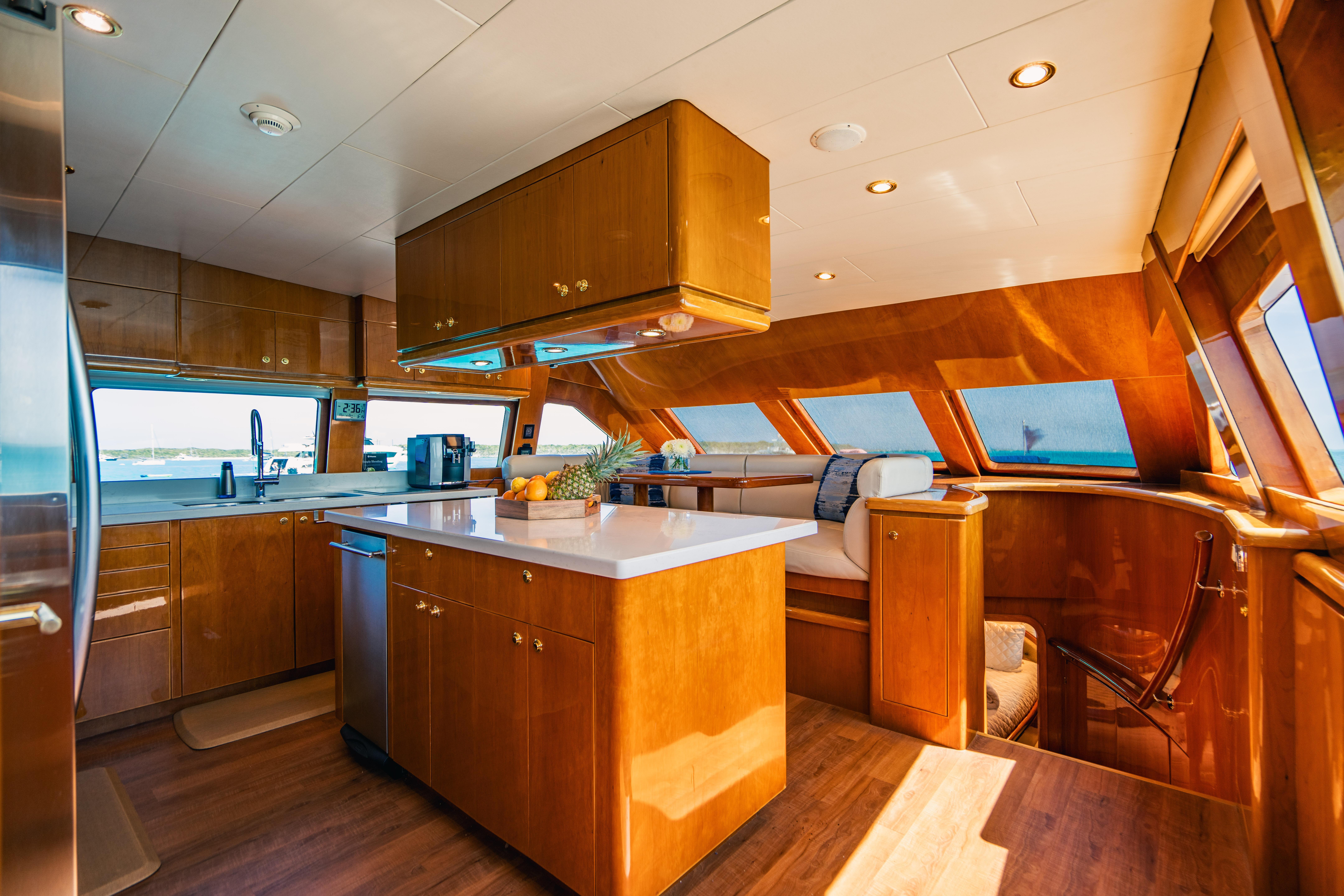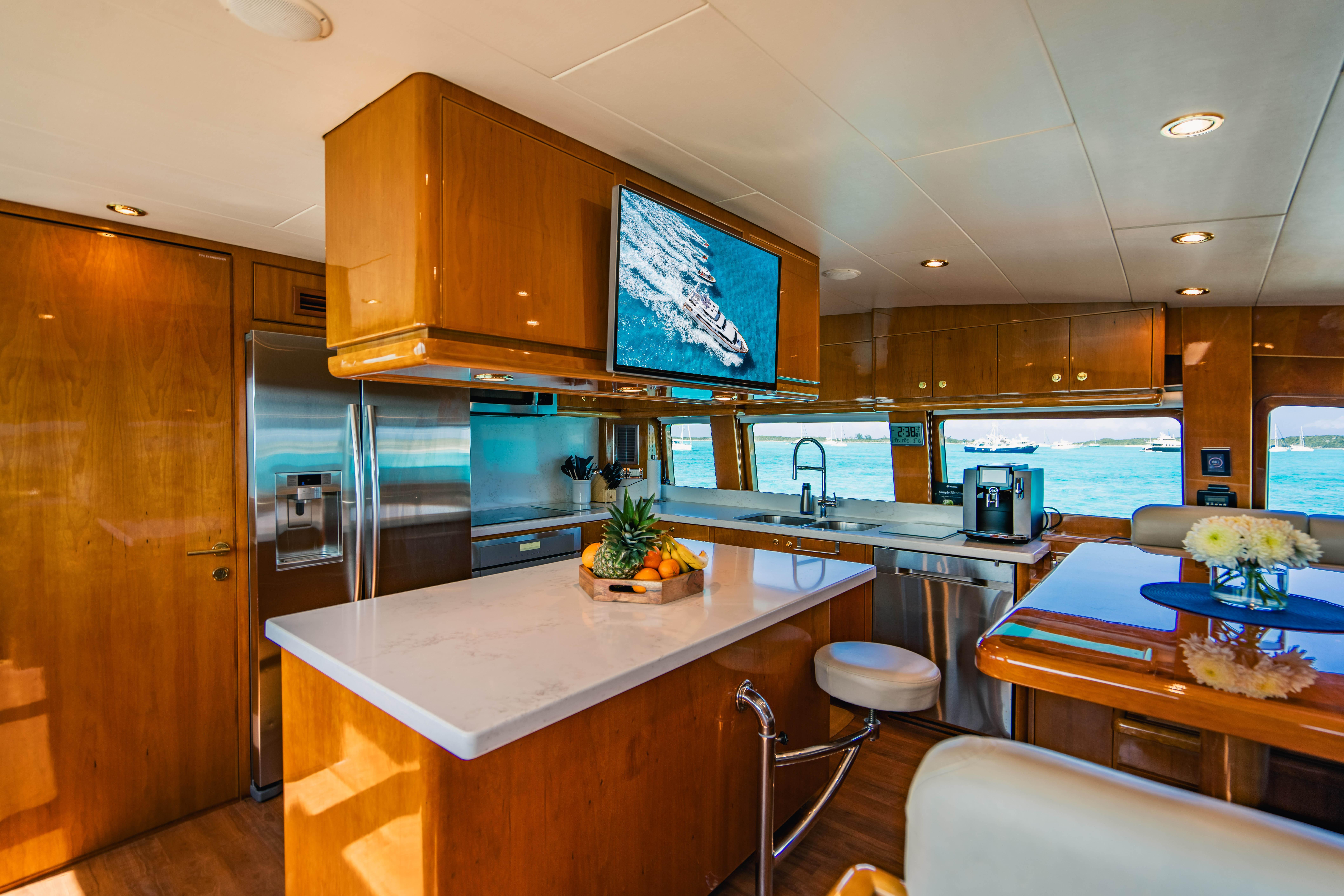 Immediately upon entering to starboard is a built-in cabinet with three doors to house storage and the salon’s home theater equipment. A new digital A/C controller, Fusion and Lumishore underwater light controls are in this area. Next forward is a cherry TV cabinet with a pop-up 50” Samsung TV.