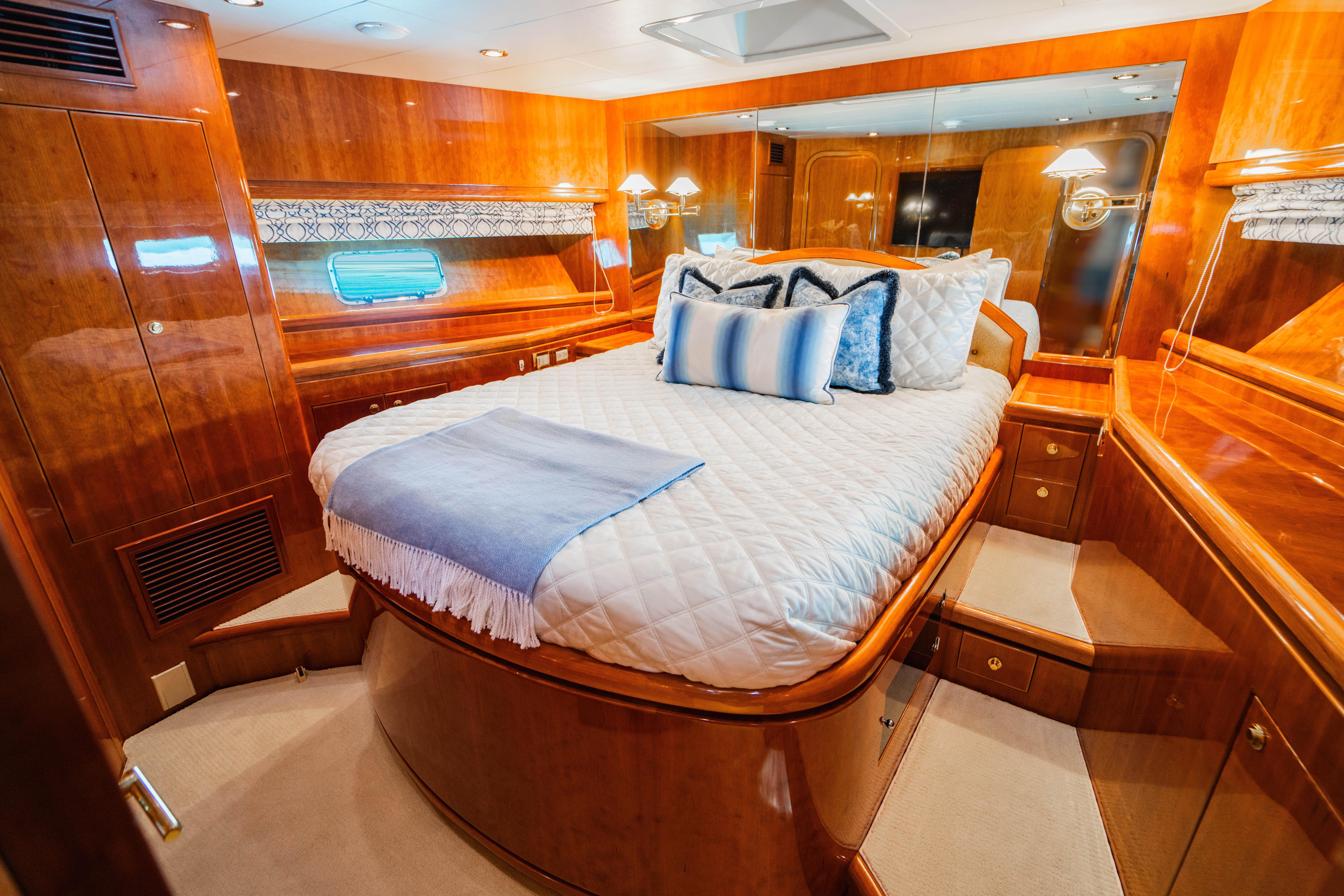Located in the widest and quietest part of the yacht is the Master Cabin. Entrance is from centerline forward with a king size bed aft on centerline. Each side has a burlwood topped nightstand with a cabinet door below. Above each nightstand is a cherry panel with a swing arm reading light affixed. Between these cherry panels is a newly upholstered headboard affixed to a large single pane mirror. Above the berth is a cherry soffit with four new directional LED down lights. The berth has two large drawers each side with additional storage under the new, custom mattress.