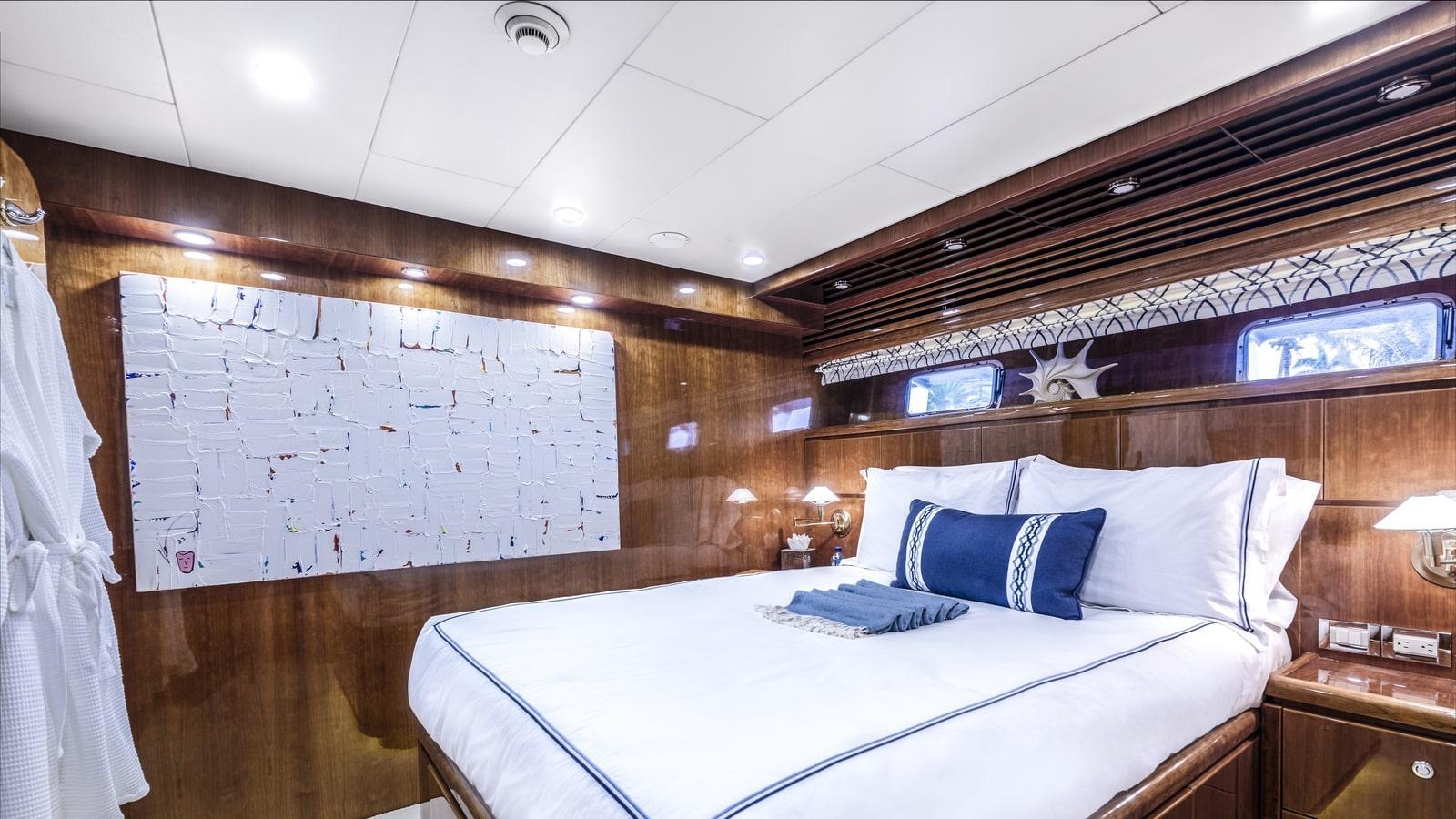 Located forward in the main accommodation area is the second VIP Guest Stateroom. A queen size berth is athwartships off the starboard hull side. There are six drawers and new rope lighting beneath the berth. Each side of the berth are two drawer nightstands with cherry tops. Above the nightstands are twin swing arm reading lights and six storage cabinets. Further above are two stainless steel opening portholes with new Roman shades covering as needed. A fluted valance delivers A/C over the berth. A mirrored soffit has four new LED lights above the head of the bed.