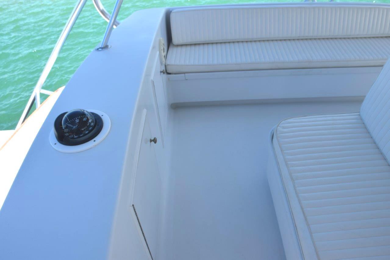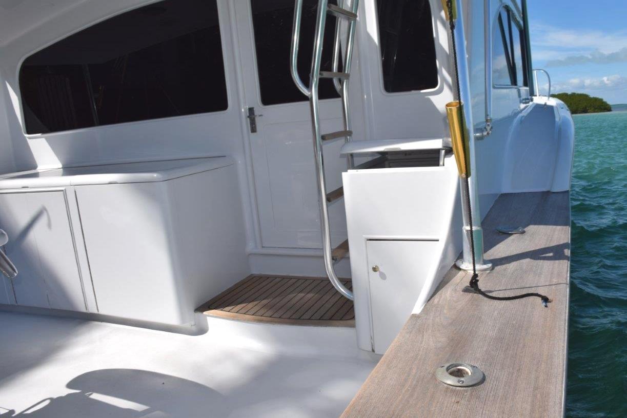 - Aluminum safety grabrails by top of flybridge ladder and to side of helm console
