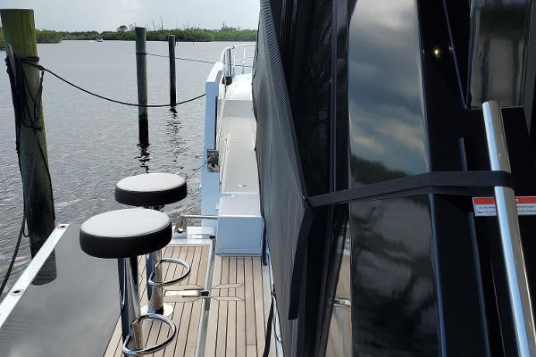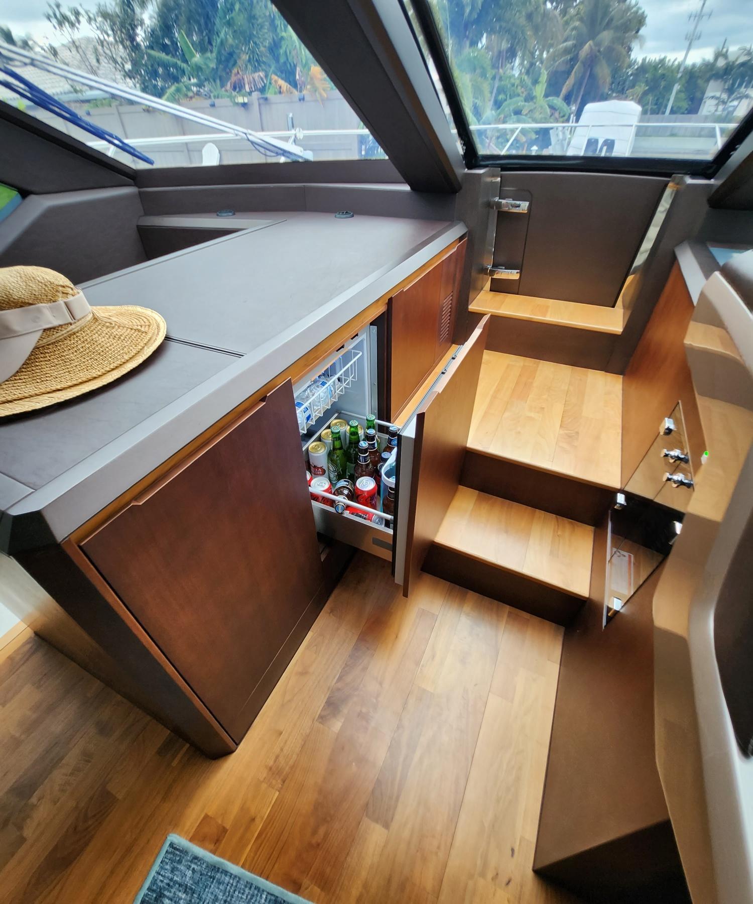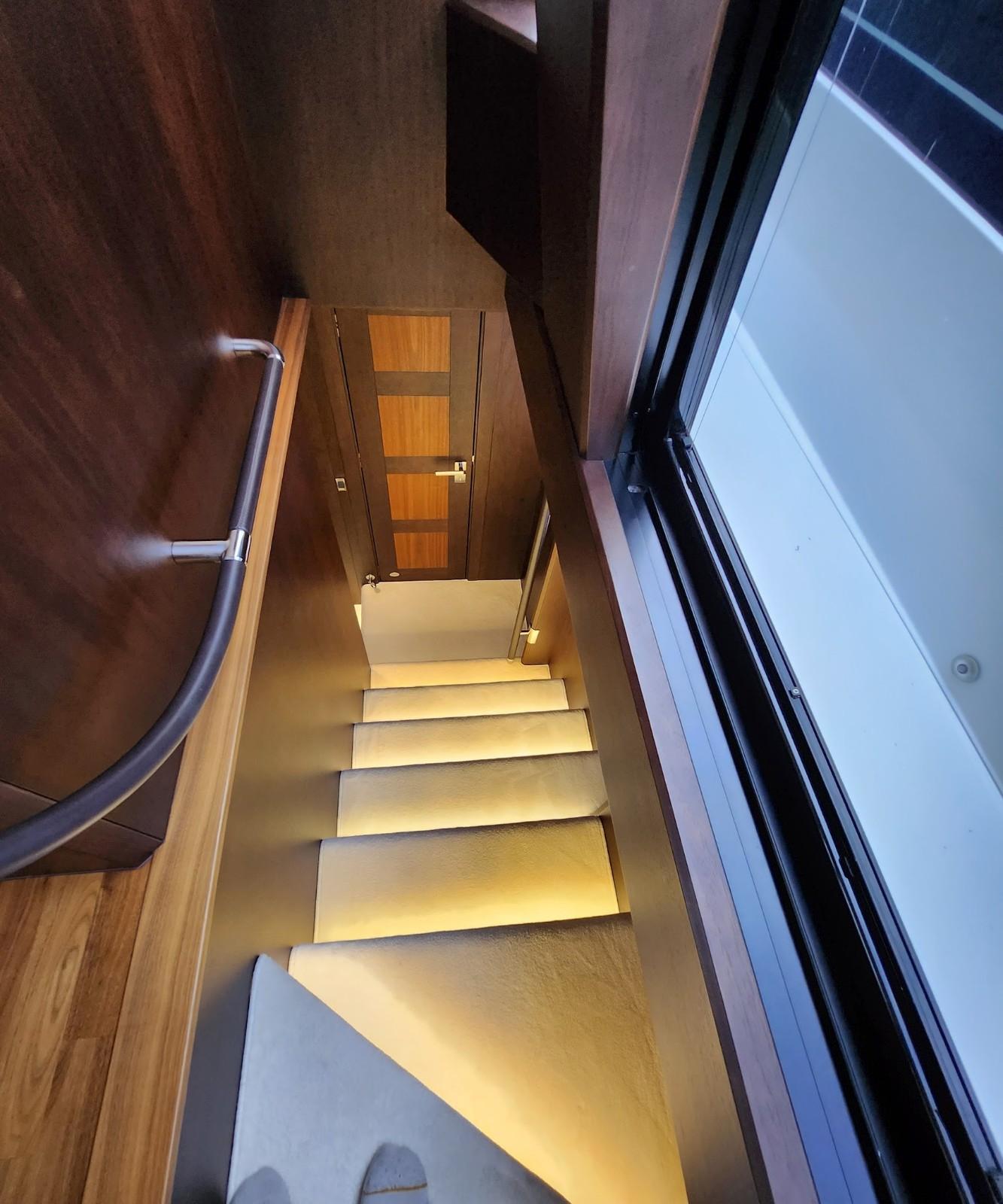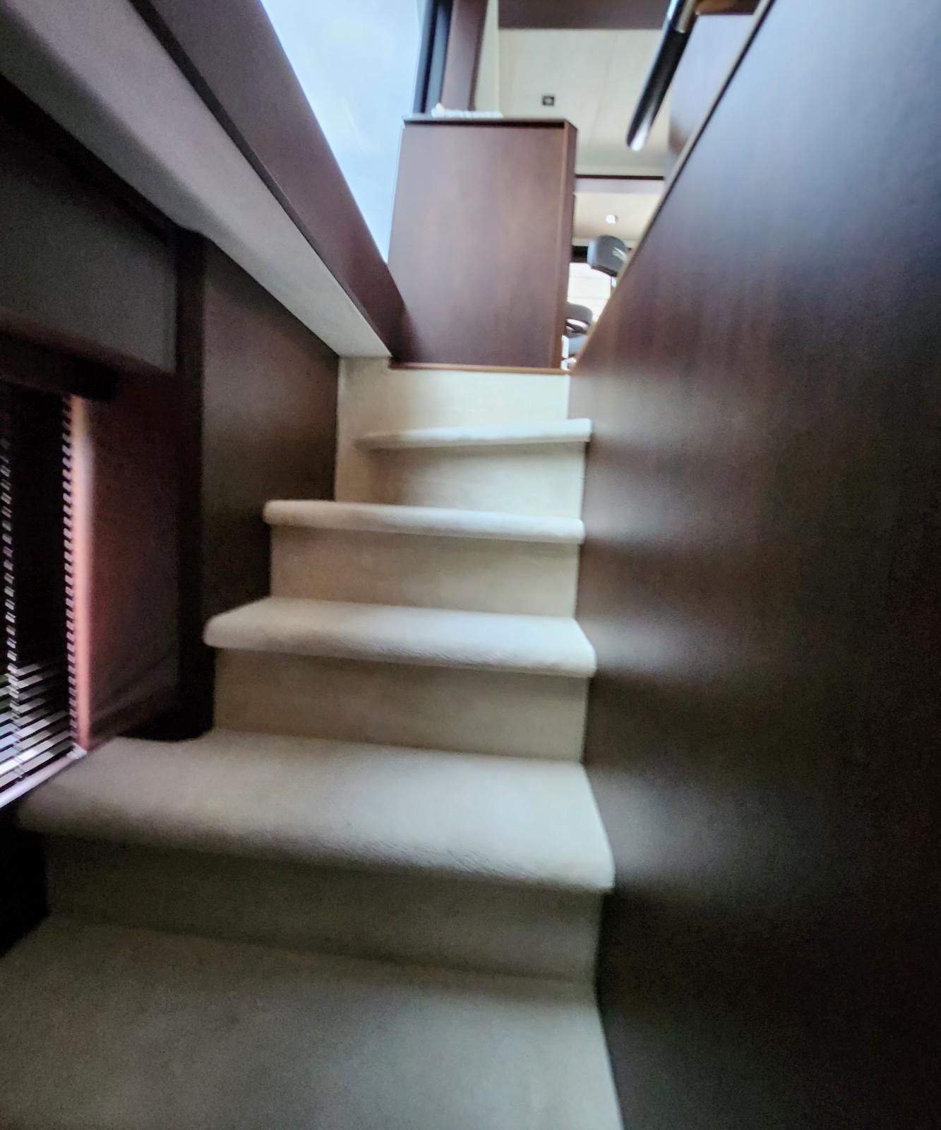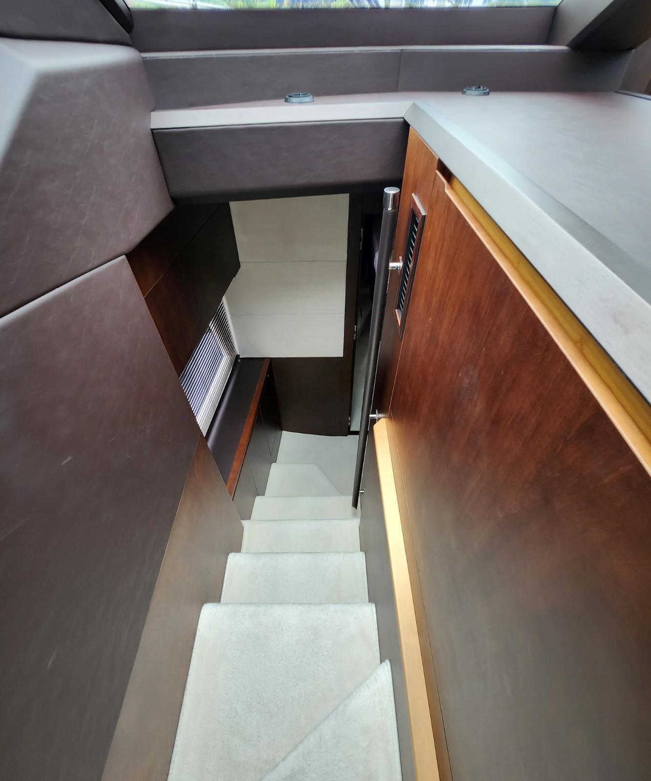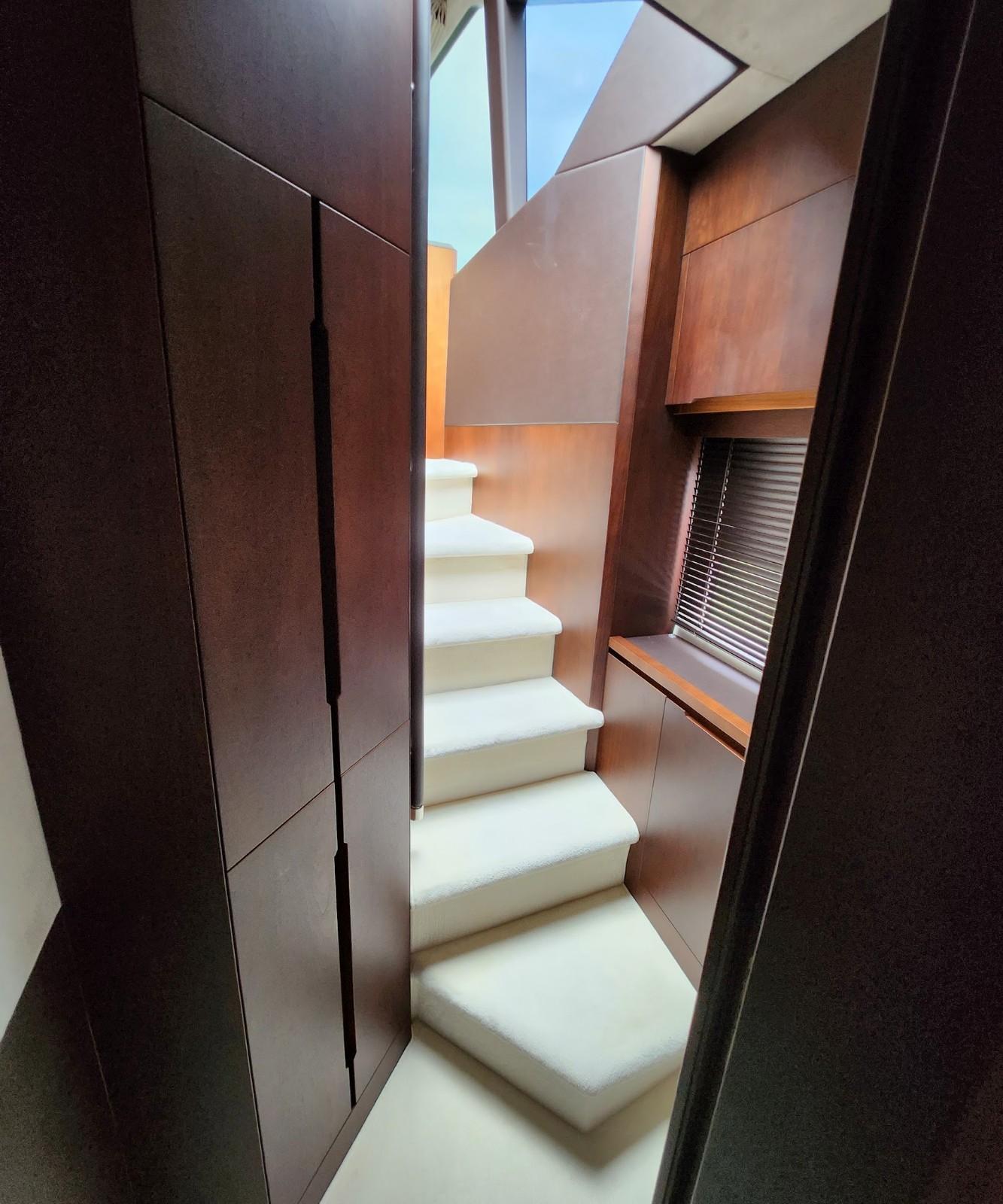 - Stairs, Access to the flybridge (molded fiberglass with teak treads and stainless steel handrails)
