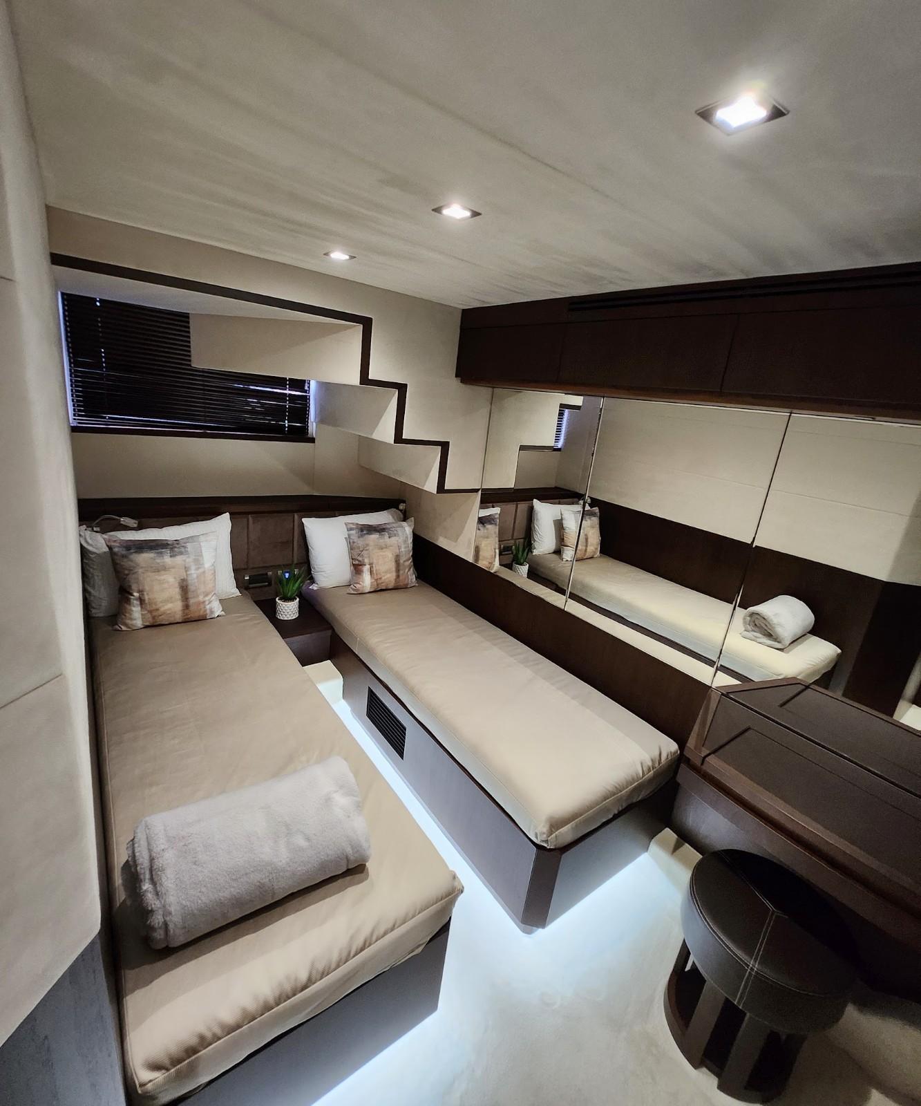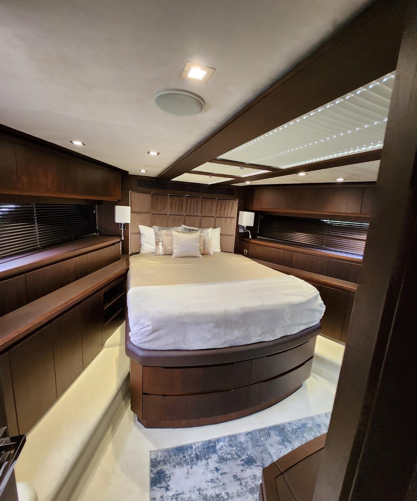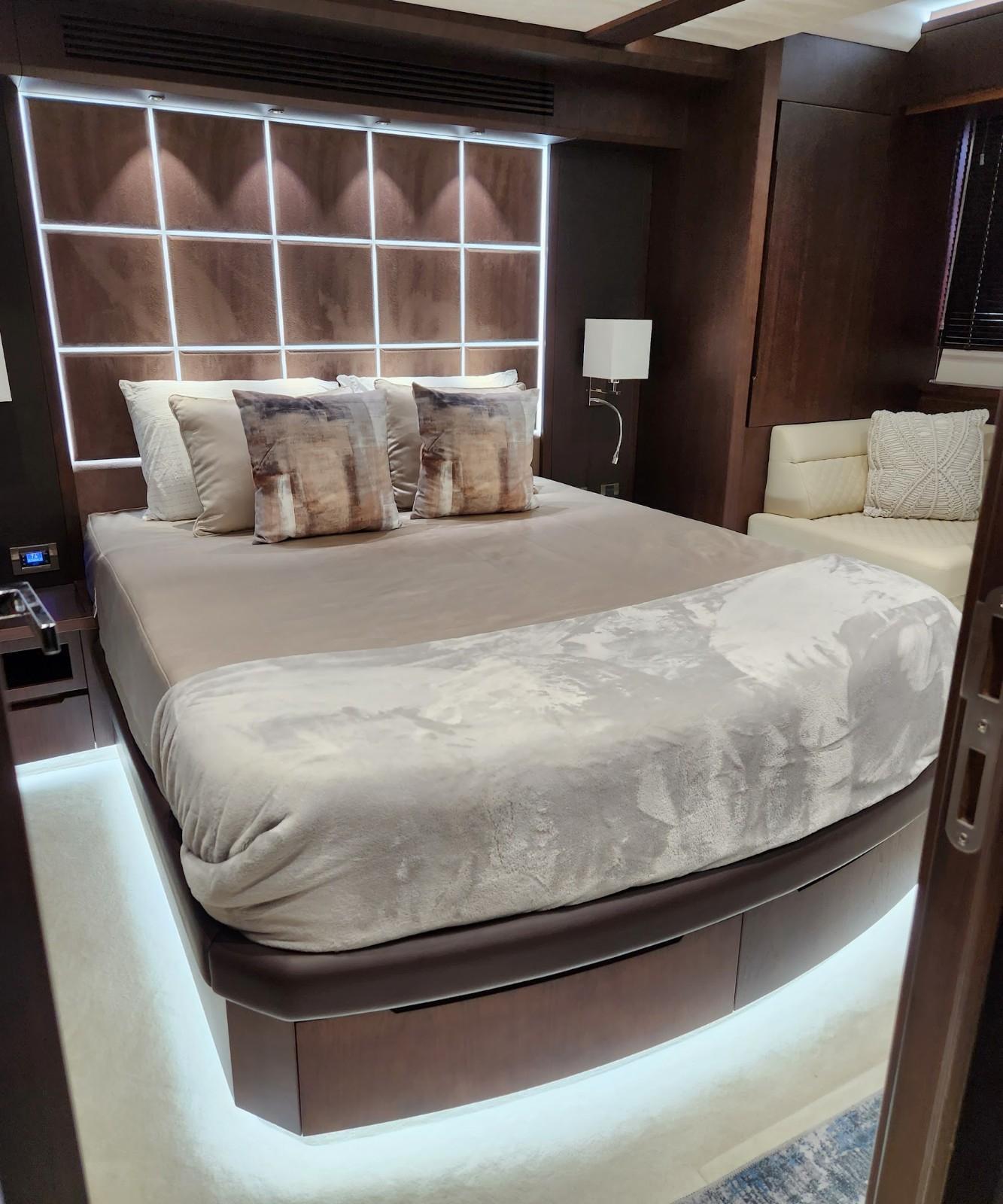 - Nightstands with storage, port, and starboard outlets, 120V
