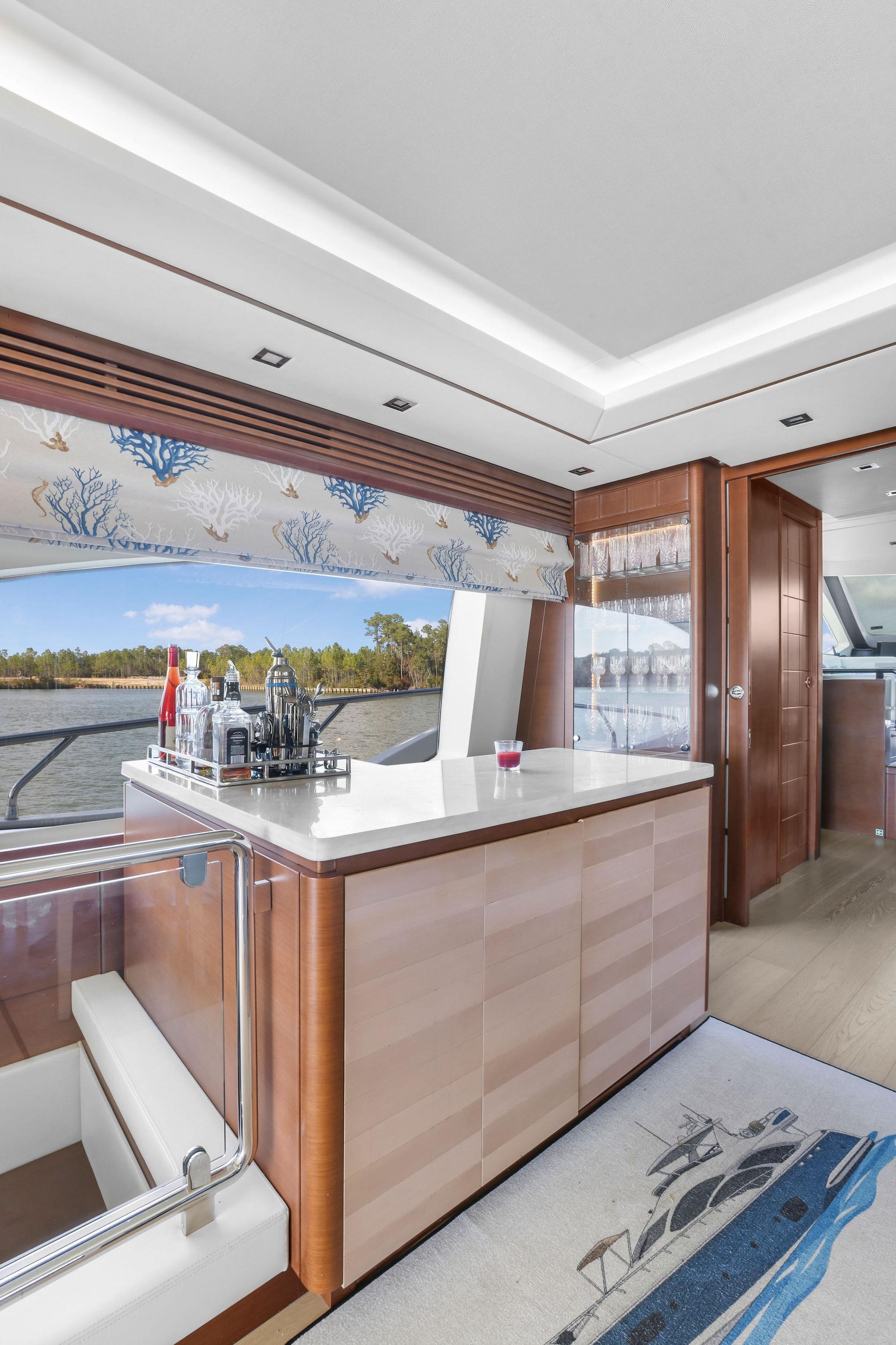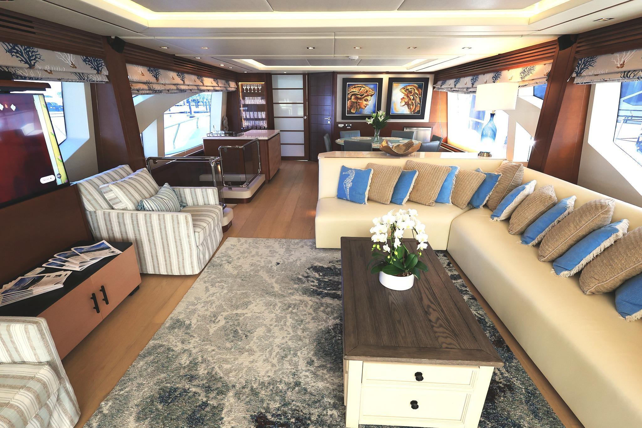 The main deck has a nautical décor with wide-planked, light colored wood laminate flooring and Sea-color themed area rug. A L-shape settee faces aft towards the sliding glass salon doors which have three tiers and can open to basically join the salon and aft deck to double the party space. Portside of the salon has two stylish stripe upholstered chairs and a pop-up 50-inch TV with Bose surround sound. Designer nautical theme electric blinds treat the window and a large sliding matching drapery can close off the aft doors. A center cocktail table is finished in a light wood texture giving the space the feeling of an Italian Beach Club.