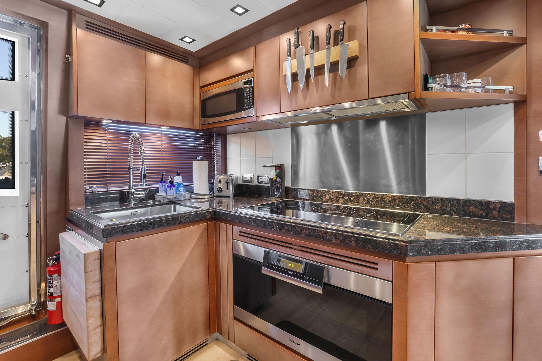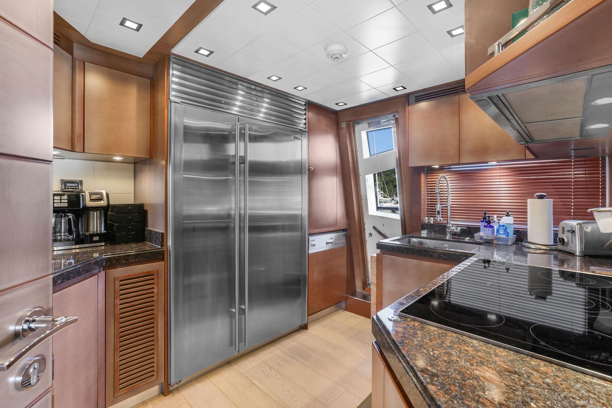 A step up forward and there is a day head to the portside followed just ahead by a Pantograph opening door to the side deck. Across to starboard is an octagonal shaped galley with granite countertops, Miele appliances, and large SubZero stainless front refrigerator. The galley has a unique opening window to the forward helm area and raised dinette. There is also a Pantograph door opening to the side deck. This is a good sized galley with generous counters and cabinets.