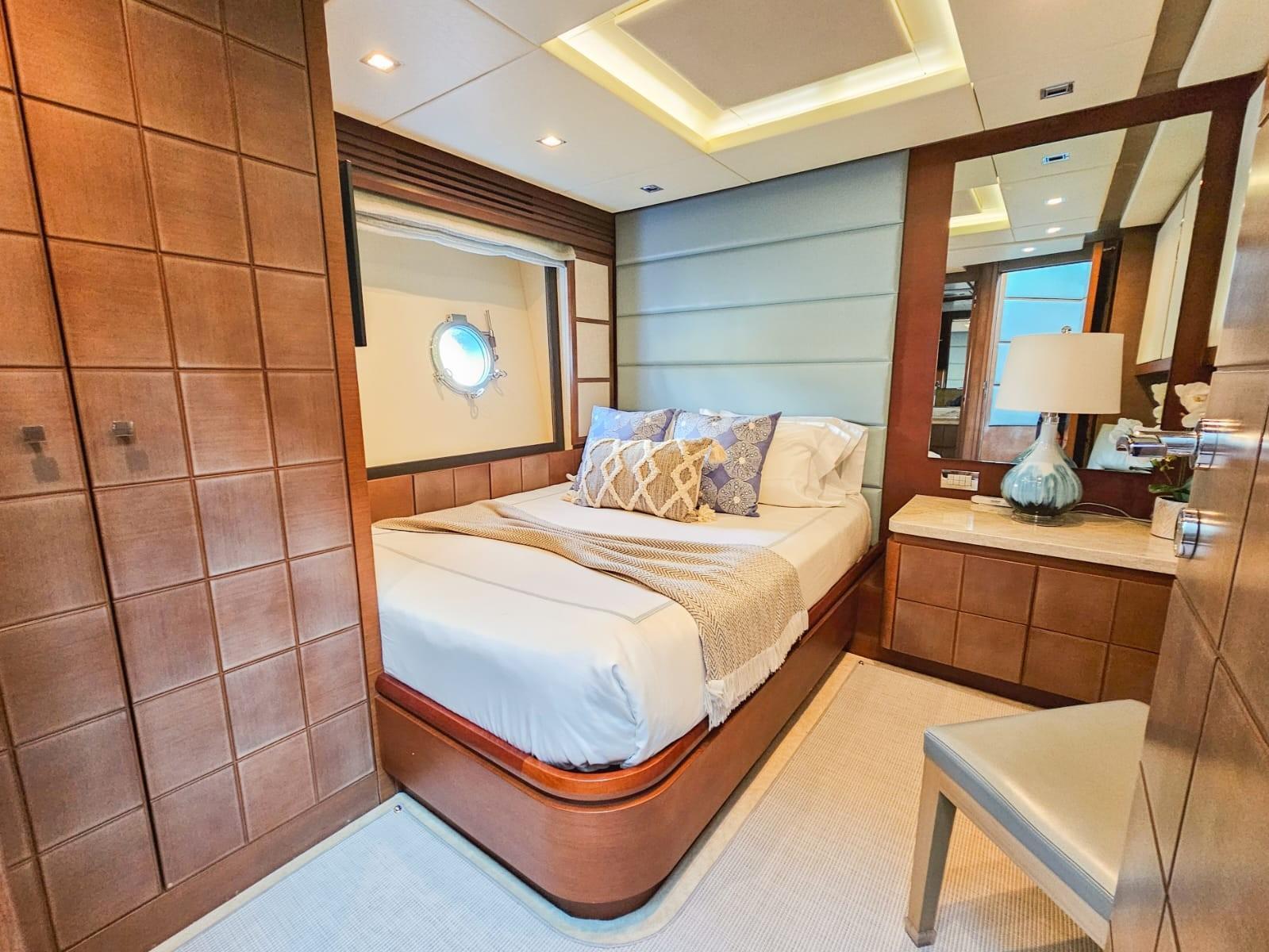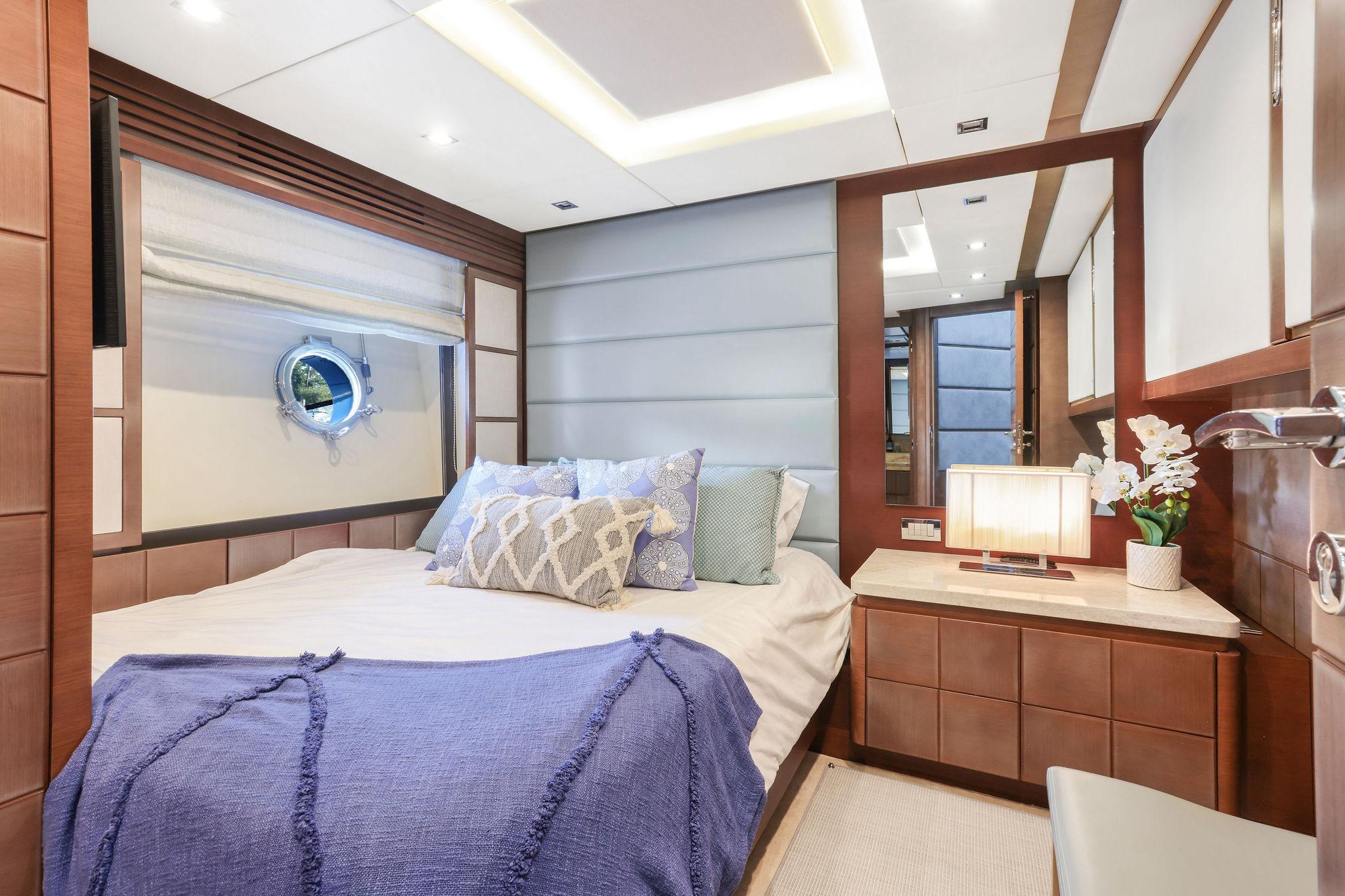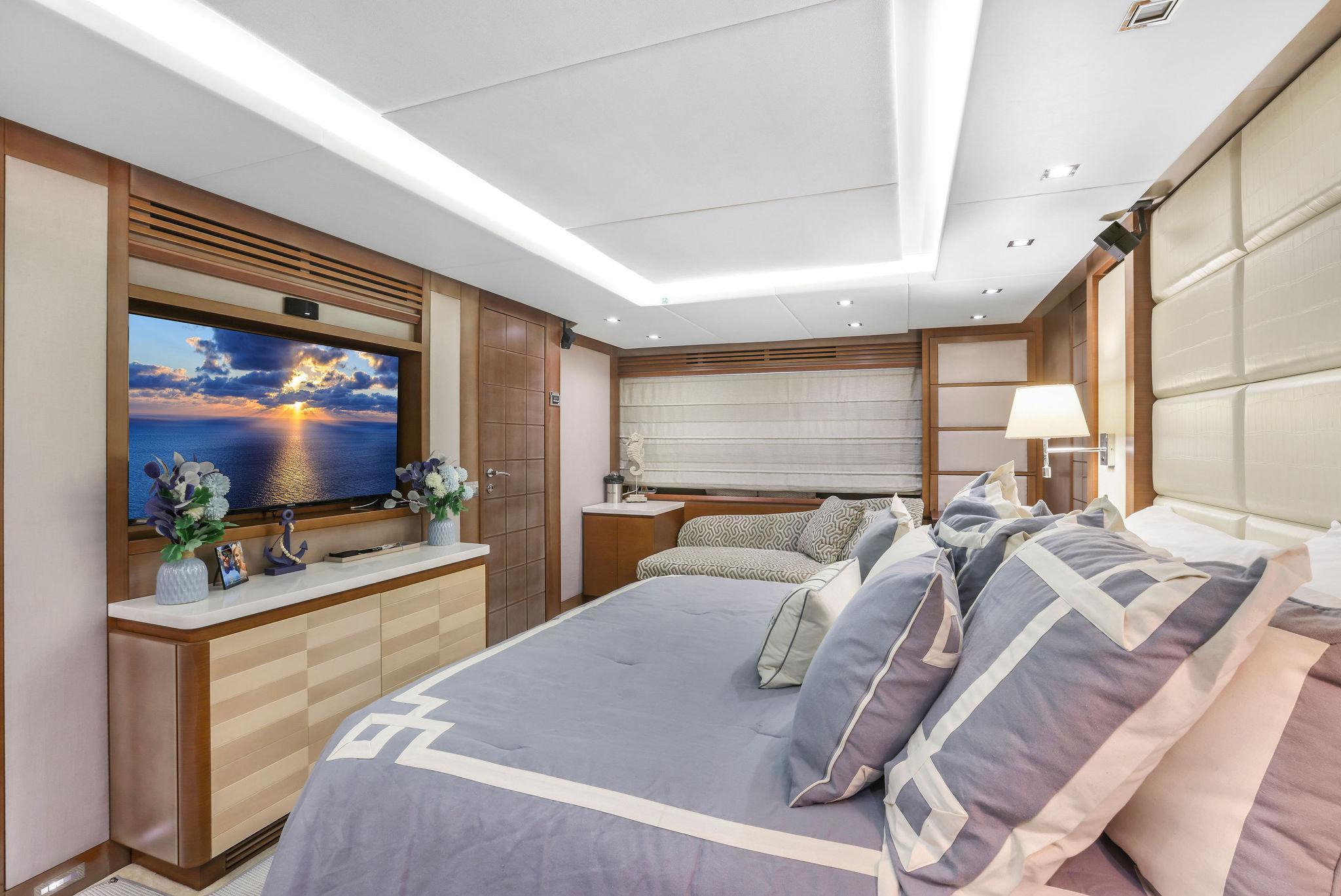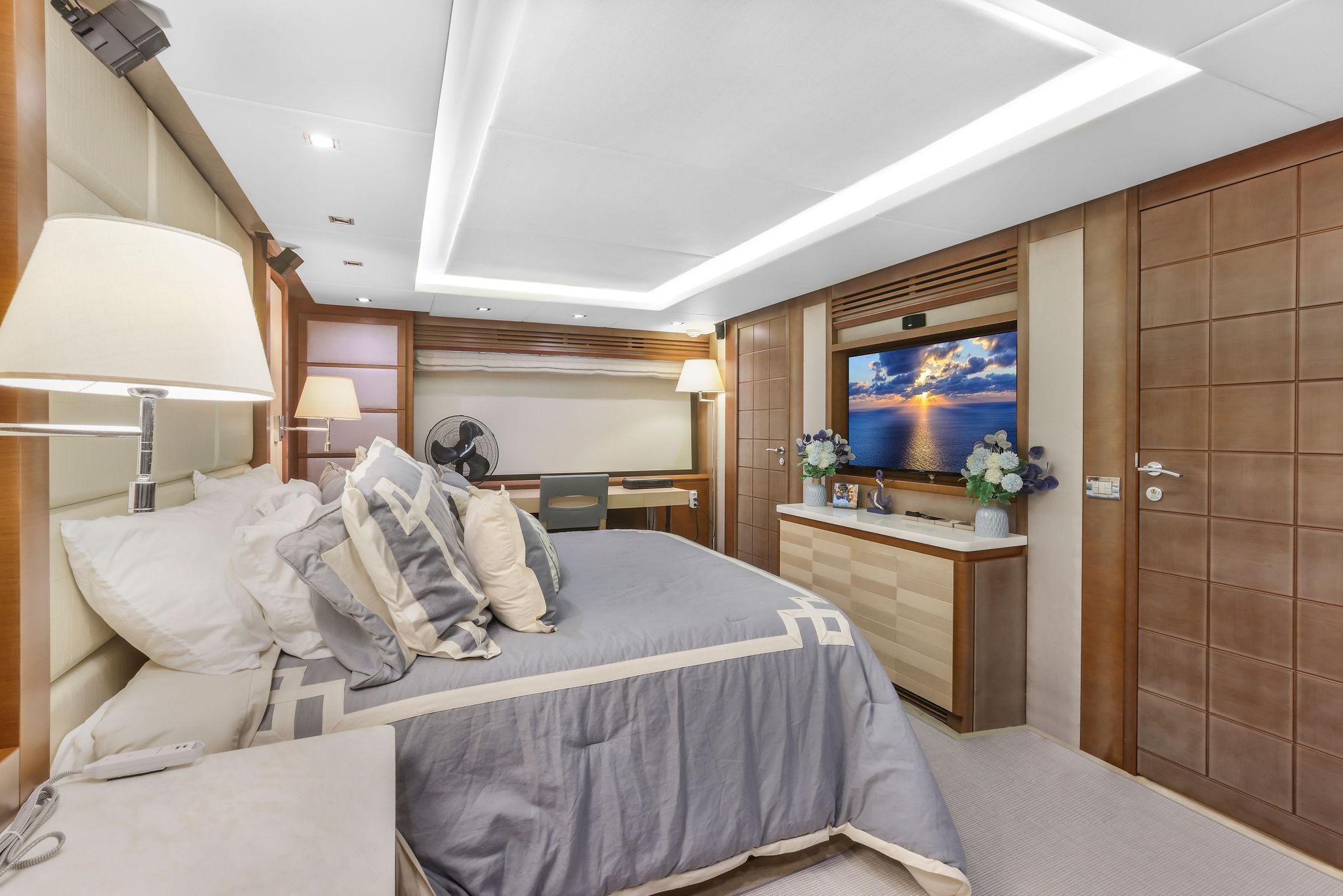 A great looking and stylish yacht with many practical updates and improvements which will be a benefit her next owner. There are two double staterooms plus a VIP suite accessed by a forward stairway by the lower helm. The full beam master stateroom is mid-ship with a private stairway off the portside of the salon. Some of its features are His and Her separate ensuite with a shower on one side and a jacuzzi tub on other side. A walk-in closet is to port forward and excellent hull side windows just above water level and treated with electric blinds, a chaise lounge, a desk, and a 50-inch TV.