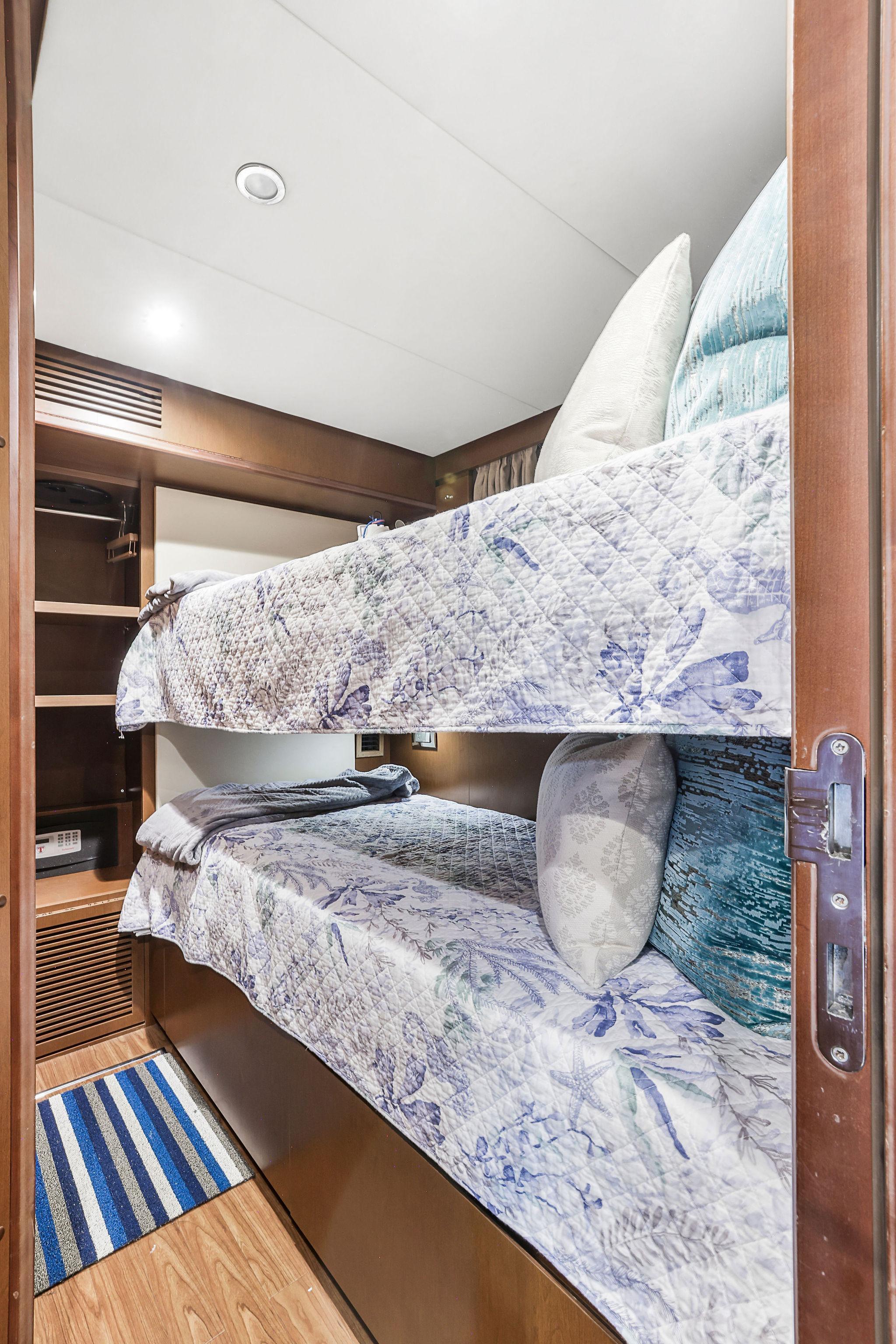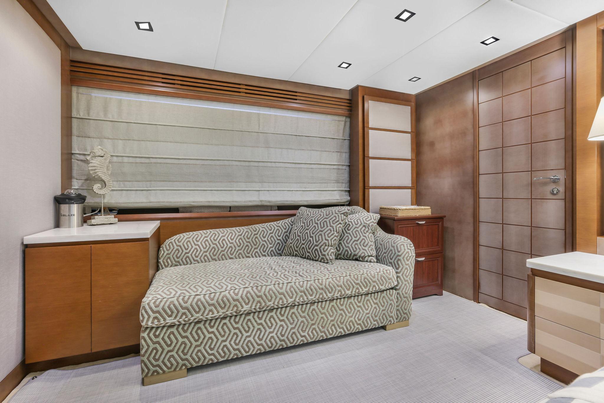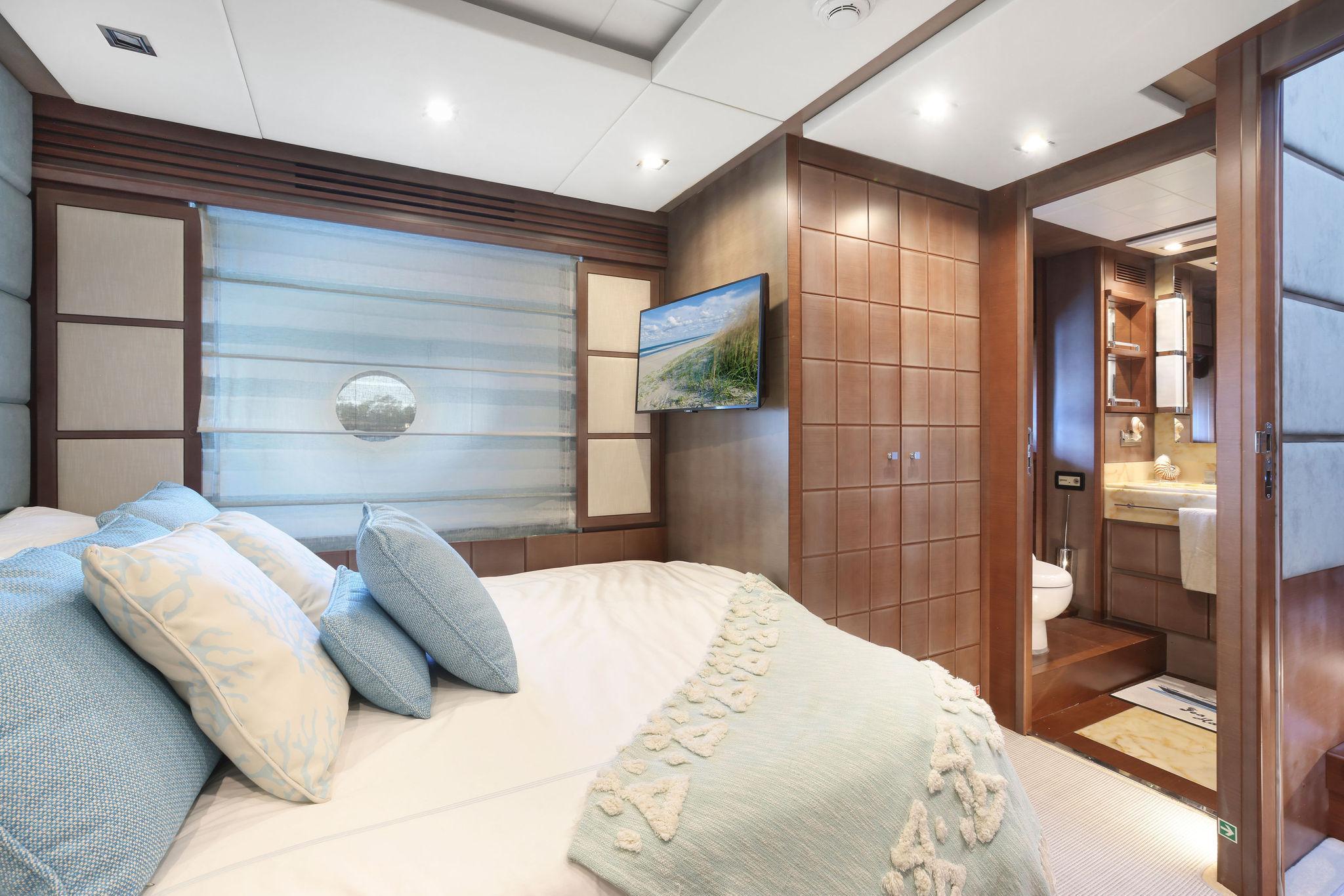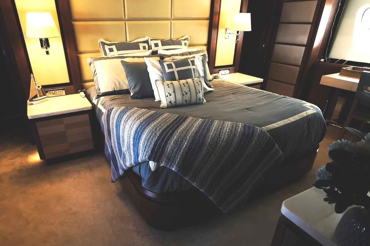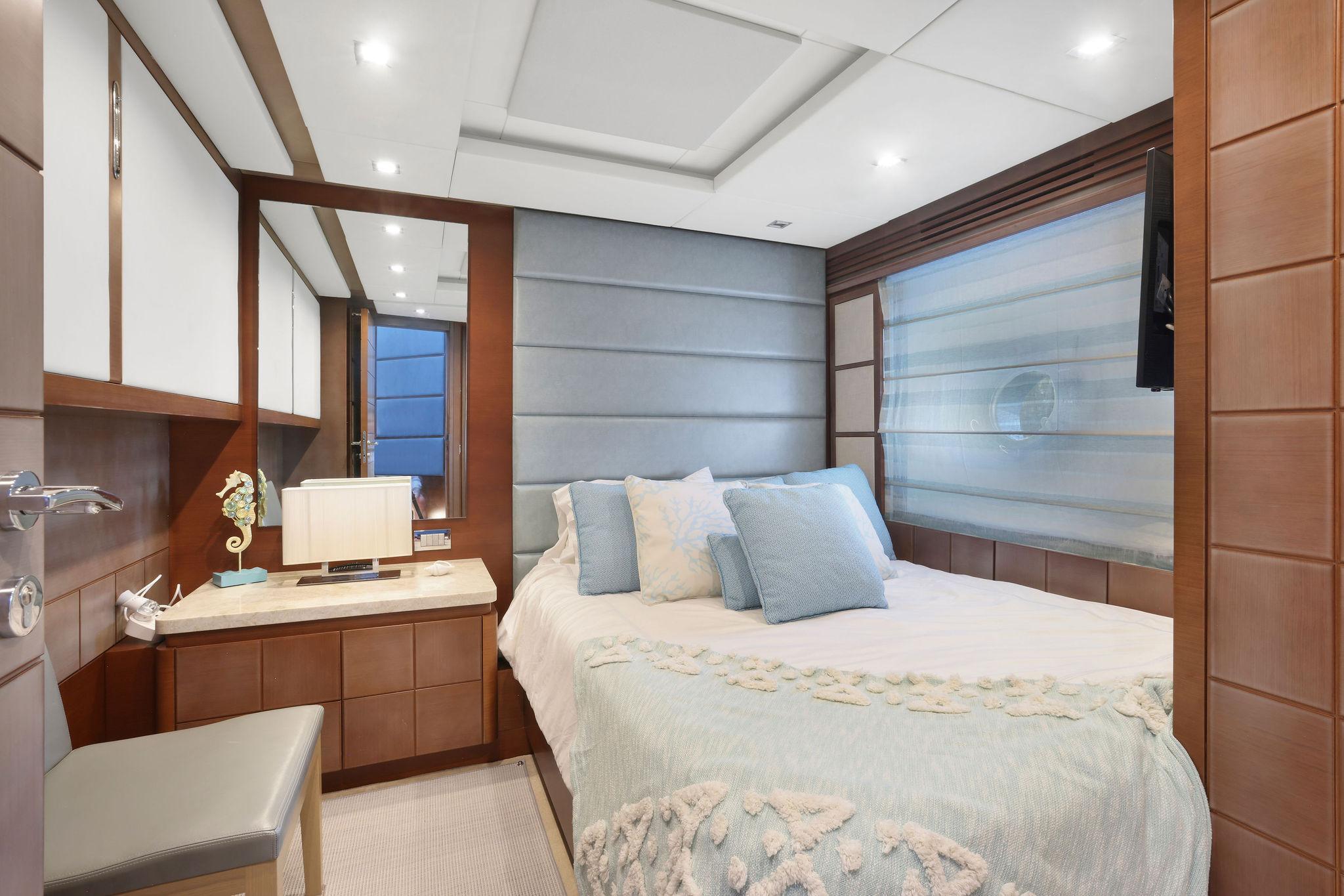 A great looking and stylish yacht with many practical updates and improvements which will be a benefit her next owner. There are two double staterooms plus a VIP suite accessed by a forward stairway by the lower helm. The full beam master stateroom is mid-ship with a private stairway off the portside of the salon. Some of its features are His and Her separate ensuite with a shower on one side and a jacuzzi tub on other side. A walk-in closet is to port forward and excellent hull side windows just above water level and treated with electric blinds, a chaise lounge, a desk, and a 50-inch TV.