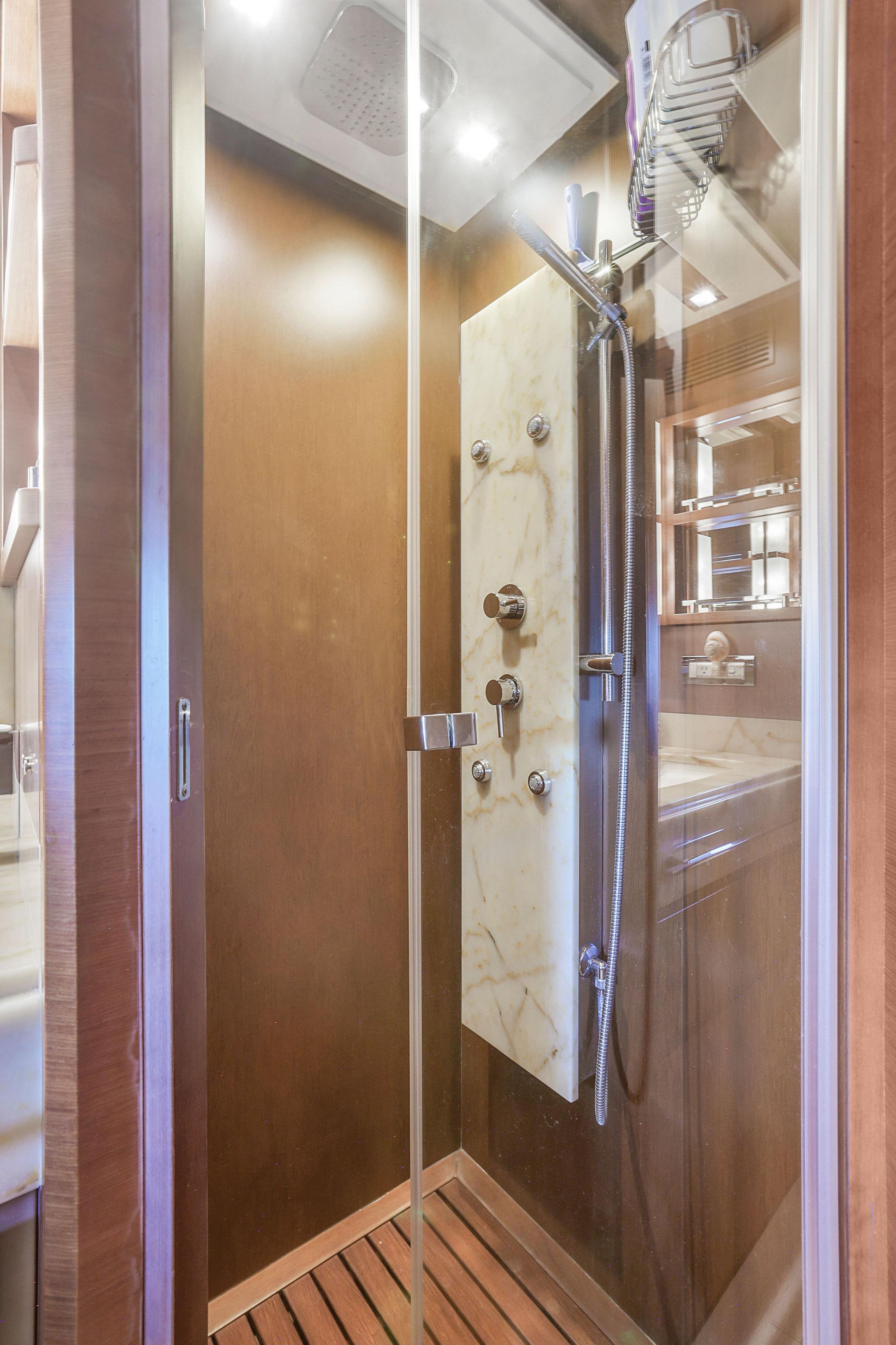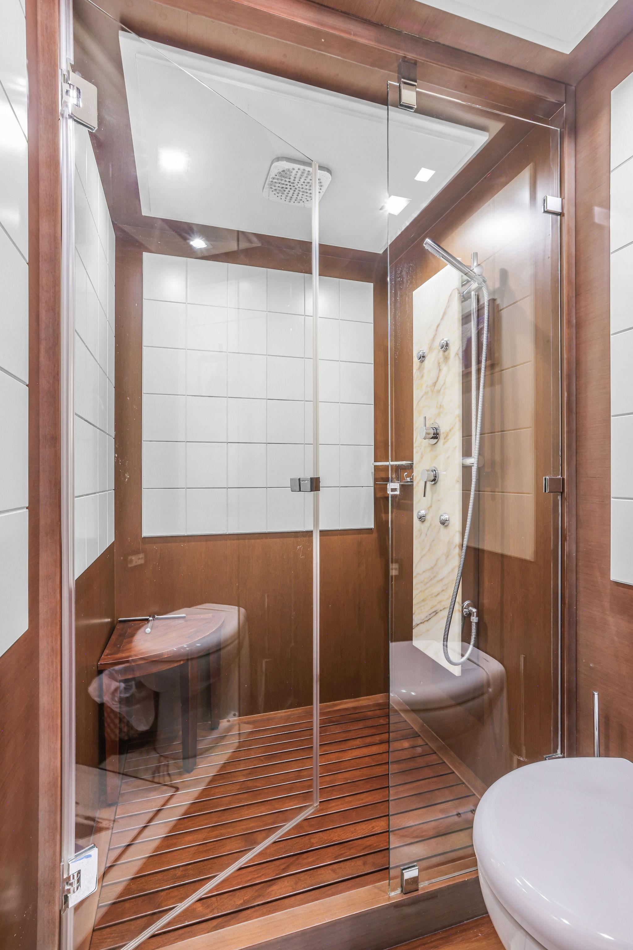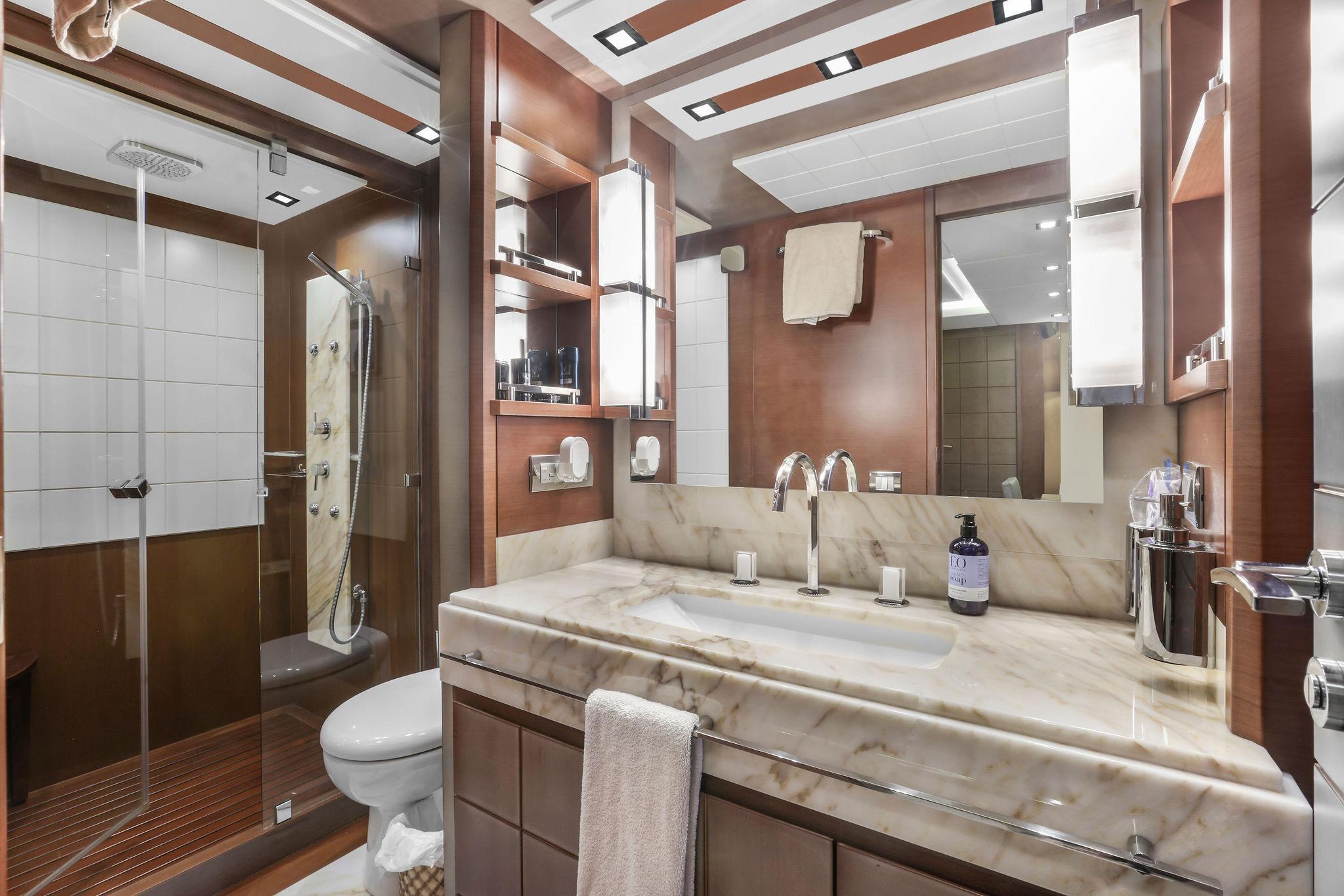 This stateroom features two separate “His and Hers” heads both to the starboard side, one with shower to the forward side of the stateroom (his?), the other with a jacuzzi tub to the aft side of the room (hers?). Both luxurious heads have marble vanities with white porcelain sinks, designer fixtures, mirrors with lighting bars to either side, Tecma marine toilets, plus marble and wood trimmed soles. The side with Jacuzzi tub also has a bidet. The shower compartment has a rainhead fixture with body spray jets, a marble fixture console, and wood strip planked floor with drainage below.