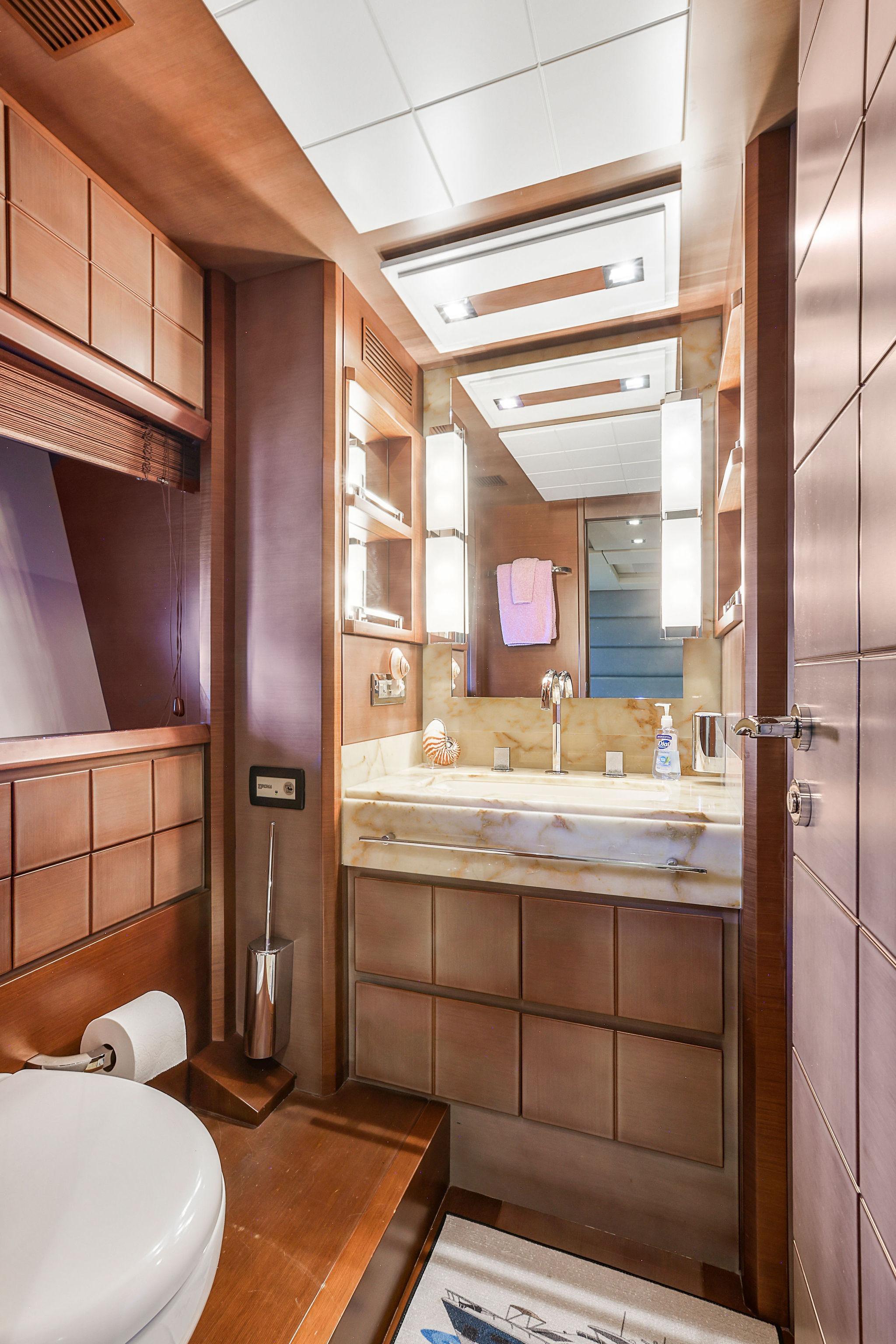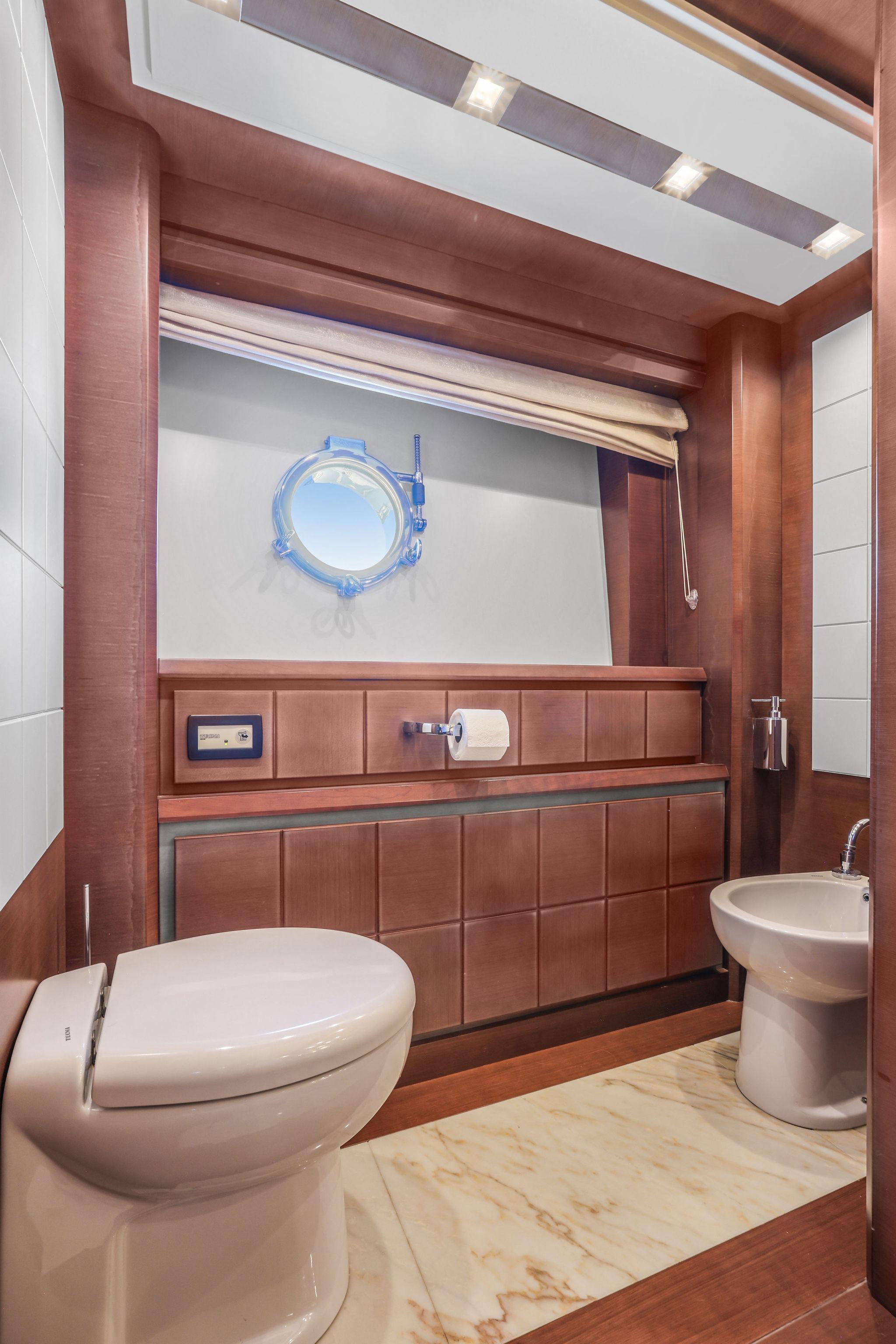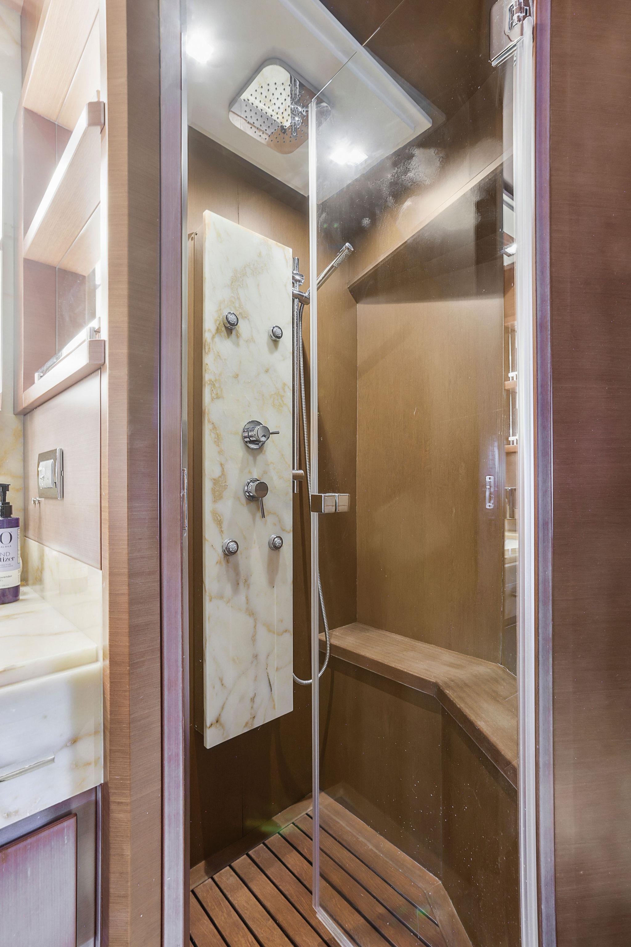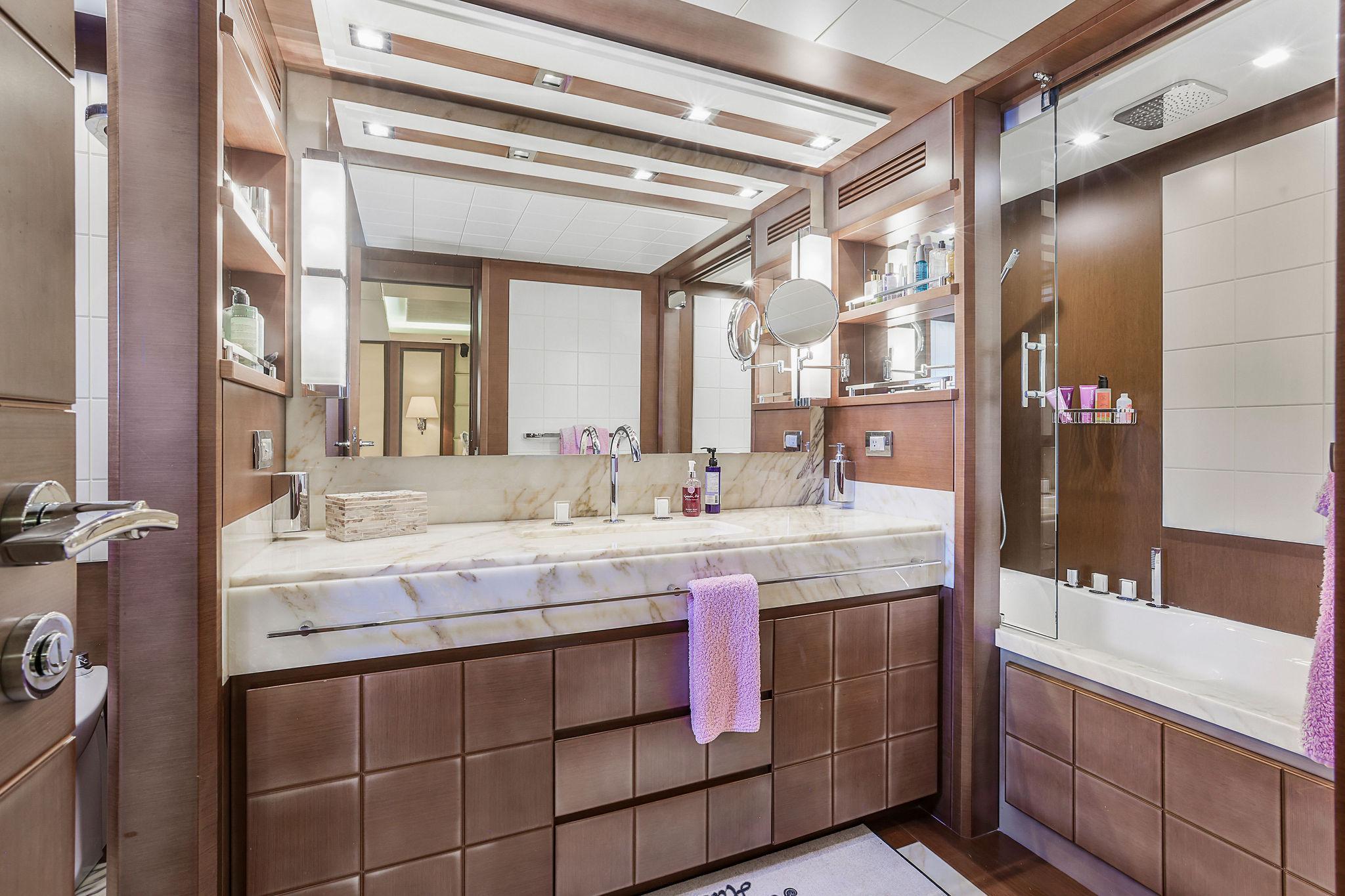 This stateroom features two separate “His and Hers” heads both to the starboard side, one with shower to the forward side of the stateroom (his?), the other with a jacuzzi tub to the aft side of the room (hers?). Both luxurious heads have marble vanities with white porcelain sinks, designer fixtures, mirrors with lighting bars to either side, Tecma marine toilets, plus marble and wood trimmed soles. The side with Jacuzzi tub also has a bidet. The shower compartment has a rainhead fixture with body spray jets, a marble fixture console, and wood strip planked floor with drainage below.