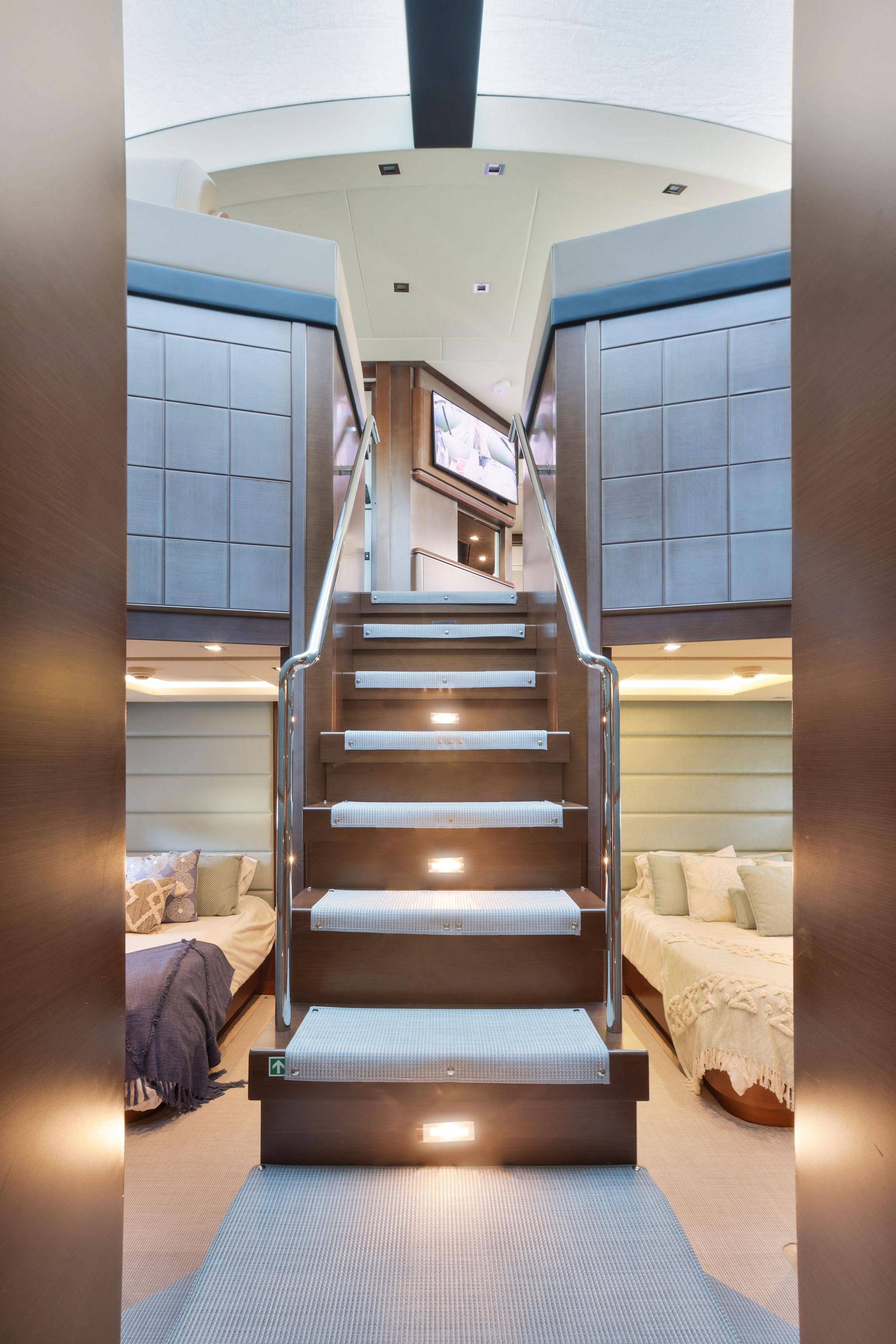 - Stairs from port and starboard side of settee down to the swim platform, with stainless swing gates at the top of the stairs