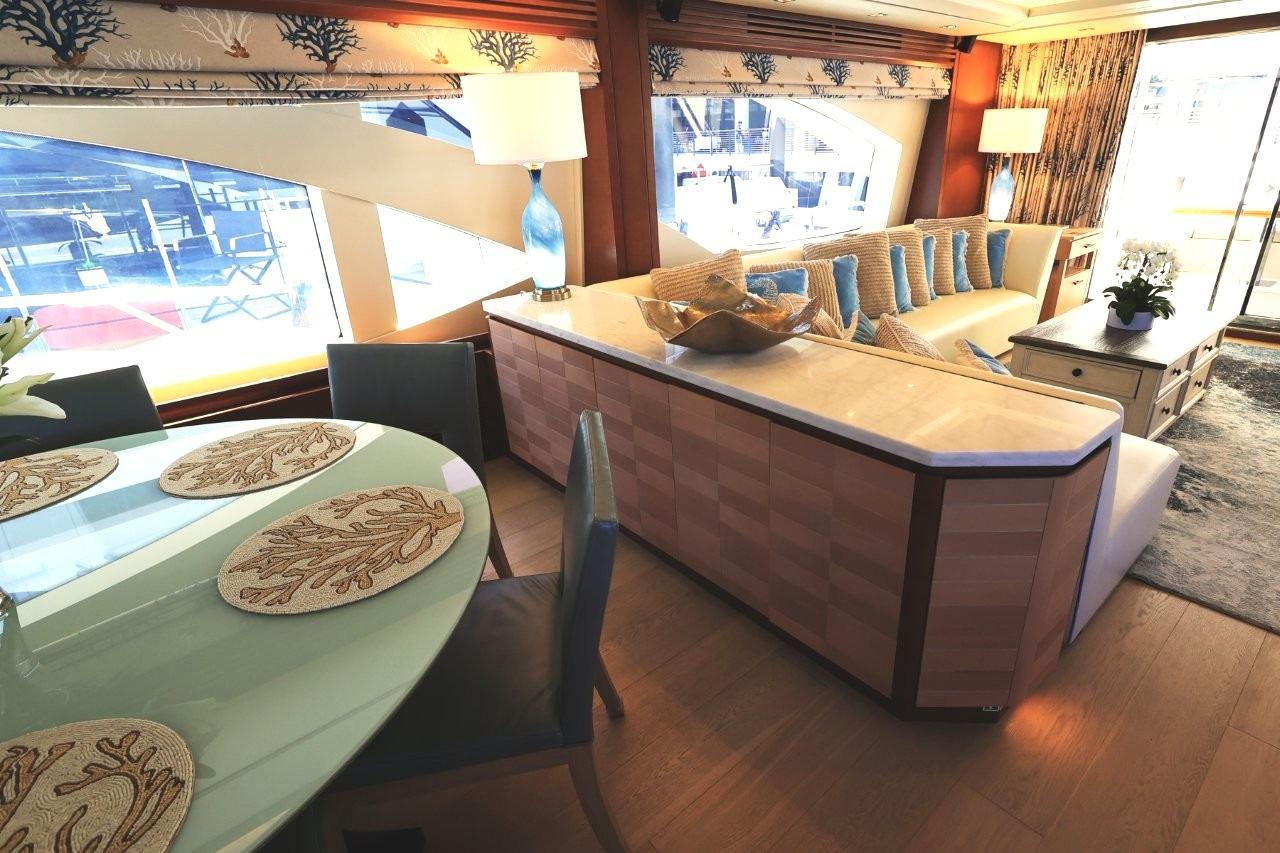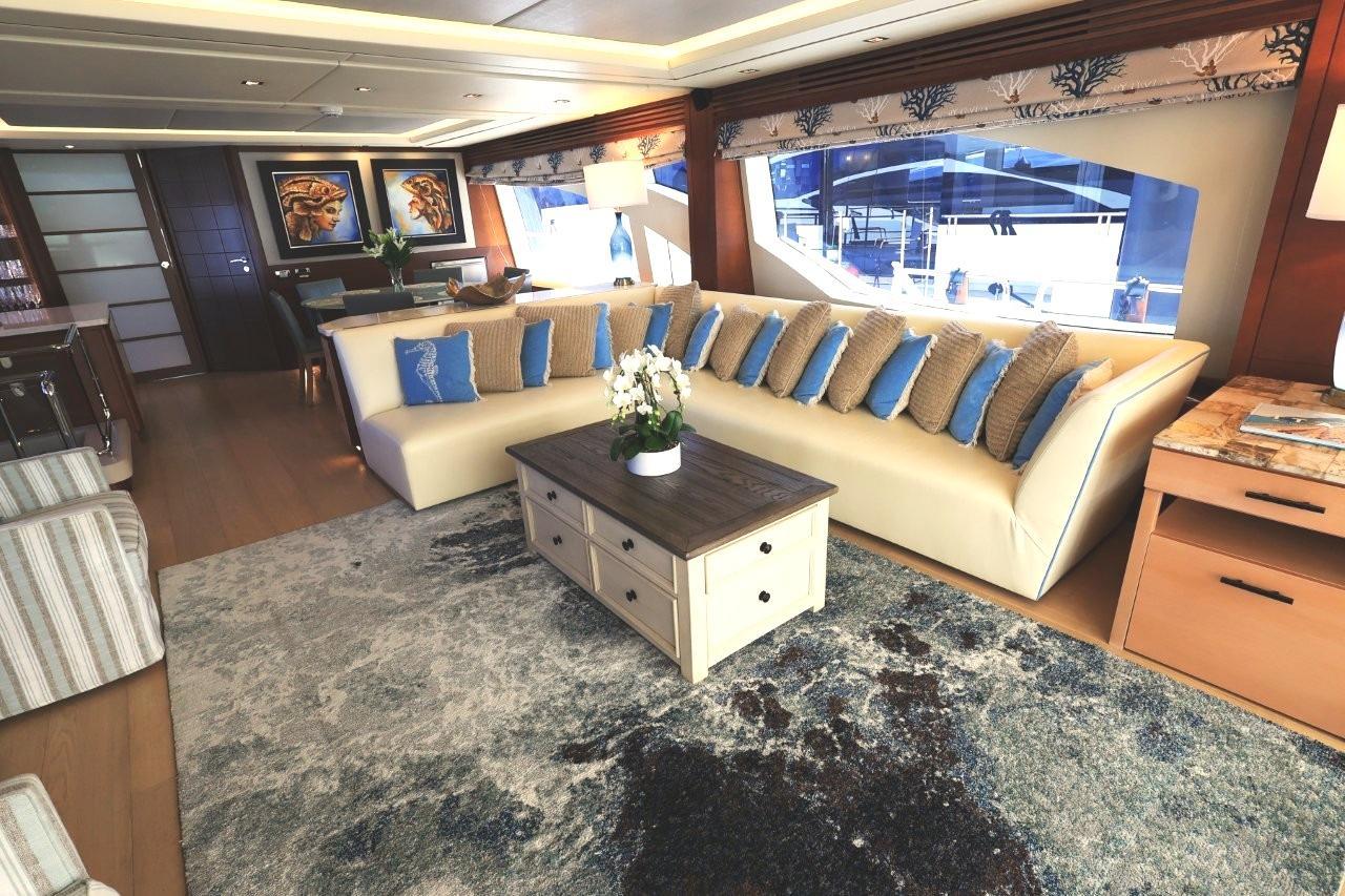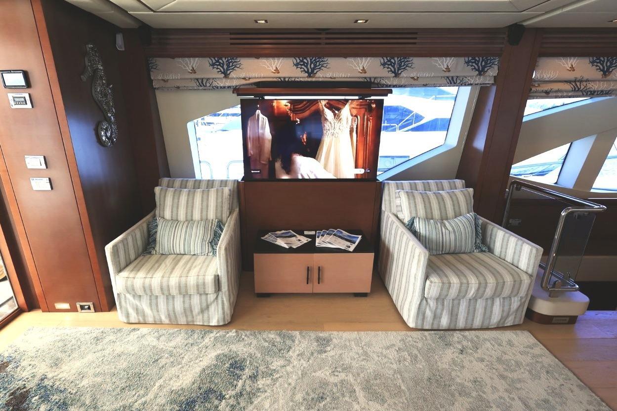 A great looking and stylish yacht with many practical updates and improvements which will be a benefit her next owner. There are two double staterooms plus a VIP suite accessed by a forward stairway by the lower helm. The full beam master stateroom is mid-ship with a private stairway off the portside of the salon. Some of its features are His and Her separate ensuite with a shower on one side and a jacuzzi tub on other side. A walk-in closet is to port forward and excellent hull side windows just above water level and treated with electric blinds, a chaise lounge, a desk, and a 50-inch TV. The main deck has a nautical décor with wide-planked, light colored wood laminate flooring and Sea-color themed area rug. A L-shape settee faces aft towards the sliding glass salon doors which have three tiers and can open to basically join the salon and aft deck to double the party space. Portside of the salon has two stylish stripe upholstered chairs and a pop-up 50-inch TV with Bose surround sound. Designer nautical theme electric blinds treat the window and a large sliding matching drapery can close off the aft doors. A center cocktail table is finished in a light wood texture giving the space the feeling of an Italian Beach Club.An Ivory granite topped banquet cabinet separates the dining area from the salon and has a circular light green glass table with 6 leather chairs. A set of refrigerated drawers are to the forward corner for easy beverage service. To the portside is a full bar with Ivory granite top and a glass display case with crystal glassware in fitted mounts. Air conditioning is diffused through wood fluted valances the border the salon area and there is attractive indirect lighting in the ceiling features.A step up forward and there is a day head to the portside followed just ahead by a Pantograph opening door to the side deck. Across to starboard is an octagonal shaped galley with granite countertops, Miele appliances, and large SubZero stainless front refrigerator. The galley has a unique opening window to the forward helm area and raised dinette. There is also a Pantograph door opening to the side deck. This is a good sized galley with generous counters and cabinets.Furthest forward on the main deck there is a raised platform dinette with Ivory granite tabletop and C-shaped settee to the portside. Great place to serve as daytime desk or for a casual lunch. To starboard is the helm with two large leather electric adjustable helm chairs and full console of electronics and monitors. Behind are sliding doors to hide a couple of ships systems electrical panels.The foredeck has a large U-shaped lounge seat with twin teak tables. There is a sturdy stainless frame which folds back into a pocket for a forward bimini shade. Ahead of the tables is a large sunlounge area.The aft deck has the benefit of a large overhang from the extended flybridge which covers the settee and large teak table. The sole has custom snap down Infinity Fabrics woven luxury vinyl which is comfortable, practical and good looking. Stairways lead down to the hydraulic swim platform from either side.An aft door opens to the crew quarters and machinery space or they can also be accessed from a portside door with stairway down from the side deck. Two staterooms, a dinette lounge, and separate shower and sink/head compartments along with a pair of Miele washer and dryer. Entry to the engine room is forward.