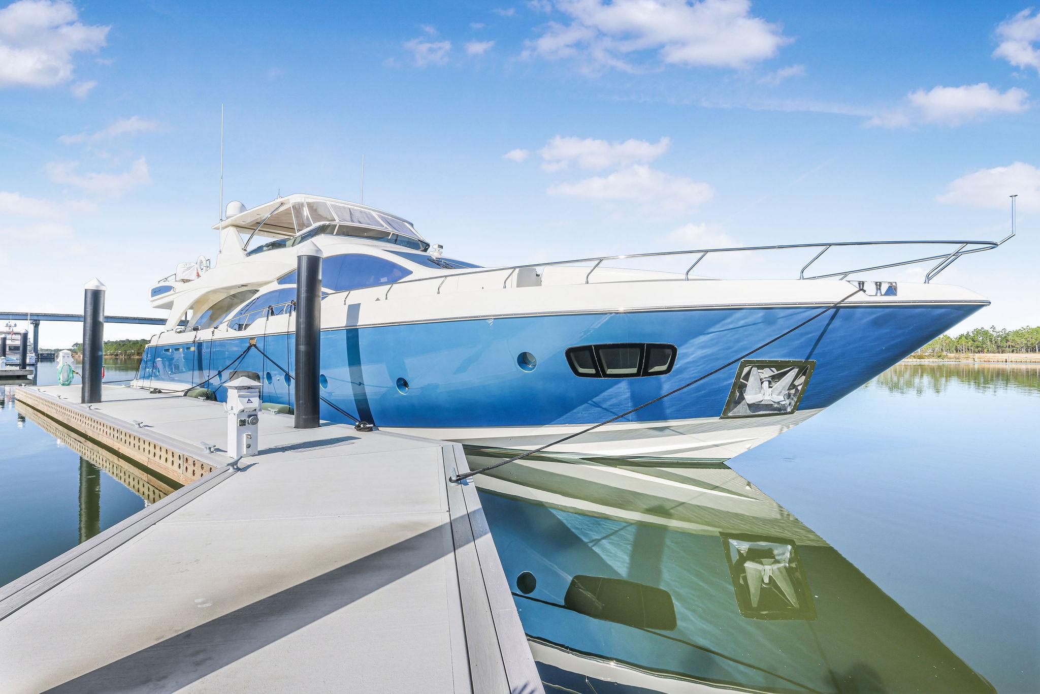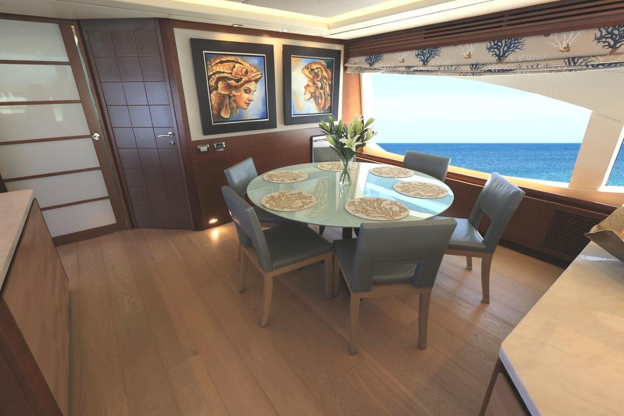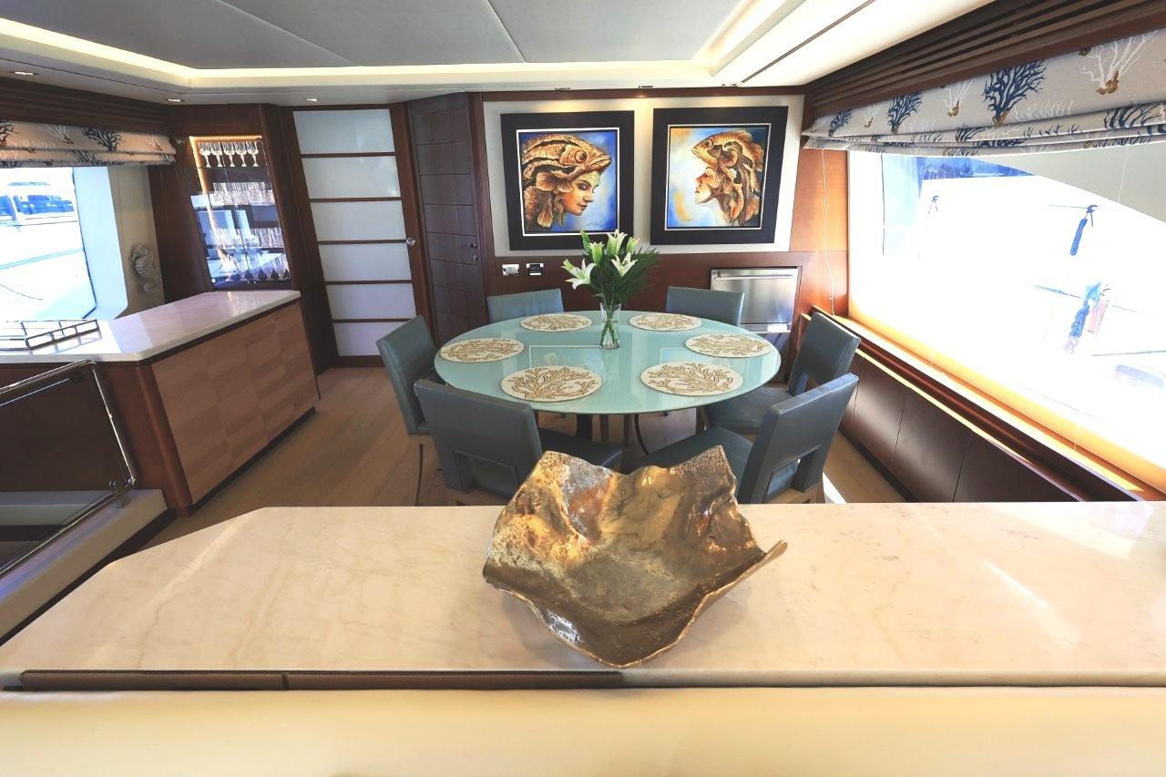 A great looking and stylish yacht with many practical updates and improvements which will be a benefit her next owner. There are two double staterooms plus a VIP suite accessed by a forward stairway by the lower helm. The full beam master stateroom is mid-ship with a private stairway off the portside of the salon. Some of its features are His and Her separate ensuite with a shower on one side and a jacuzzi tub on other side. A walk-in closet is to port forward and excellent hull side windows just above water level and treated with electric blinds, a chaise lounge, a desk, and a 50-inch TV. The main deck has a nautical décor with wide-planked, light colored wood laminate flooring and Sea-color themed area rug. A L-shape settee faces aft towards the sliding glass salon doors which have three tiers and can open to basically join the salon and aft deck to double the party space. Portside of the salon has two stylish stripe upholstered chairs and a pop-up 50-inch TV with Bose surround sound. Designer nautical theme electric blinds treat the window and a large sliding matching drapery can close off the aft doors. A center cocktail table is finished in a light wood texture giving the space the feeling of an Italian Beach Club.An Ivory granite topped banquet cabinet separates the dining area from the salon and has a circular light green glass table with 6 leather chairs. A set of refrigerated drawers are to the forward corner for easy beverage service. To the portside is a full bar with Ivory granite top and a glass display case with crystal glassware in fitted mounts. Air conditioning is diffused through wood fluted valances the border the salon area and there is attractive indirect lighting in the ceiling features.A step up forward and there is a day head to the portside followed just ahead by a Pantograph opening door to the side deck. Across to starboard is an octagonal shaped galley with granite countertops, Miele appliances, and large SubZero stainless front refrigerator. The galley has a unique opening window to the forward helm area and raised dinette. There is also a Pantograph door opening to the side deck. This is a good sized galley with generous counters and cabinets.Furthest forward on the main deck there is a raised platform dinette with Ivory granite tabletop and C-shaped settee to the portside. Great place to serve as daytime desk or for a casual lunch. To starboard is the helm with two large leather electric adjustable helm chairs and full console of electronics and monitors. Behind are sliding doors to hide a couple of ships systems electrical panels.The foredeck has a large U-shaped lounge seat with twin teak tables. There is a sturdy stainless frame which folds back into a pocket for a forward bimini shade. Ahead of the tables is a large sunlounge area.The aft deck has the benefit of a large overhang from the extended flybridge which covers the settee and large teak table. The sole has custom snap down Infinity Fabrics woven luxury vinyl which is comfortable, practical and good looking. Stairways lead down to the hydraulic swim platform from either side.An aft door opens to the crew quarters and machinery space or they can also be accessed from a portside door with stairway down from the side deck. Two staterooms, a dinette lounge, and separate shower and sink/head compartments along with a pair of Miele washer and dryer. Entry to the engine room is forward.