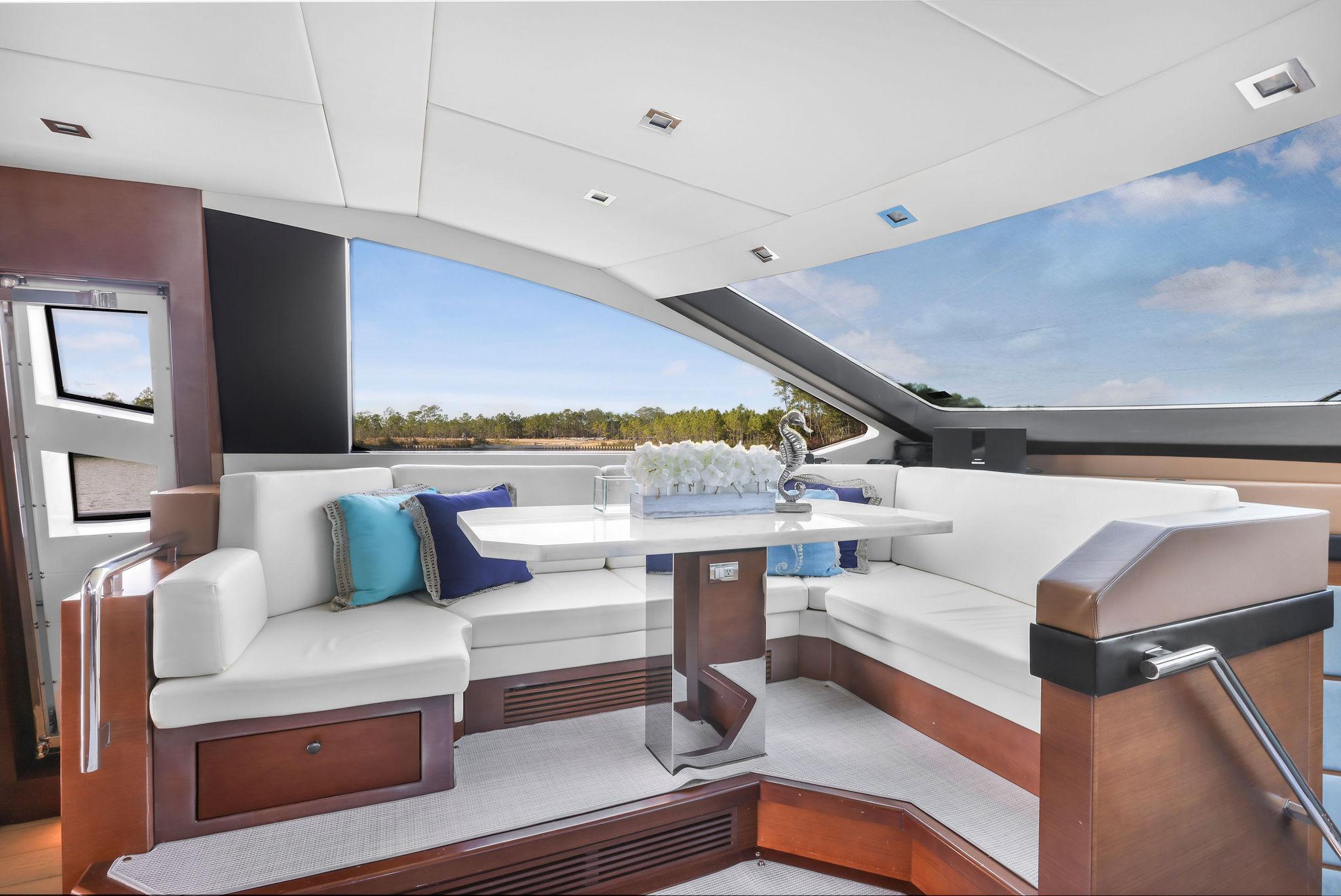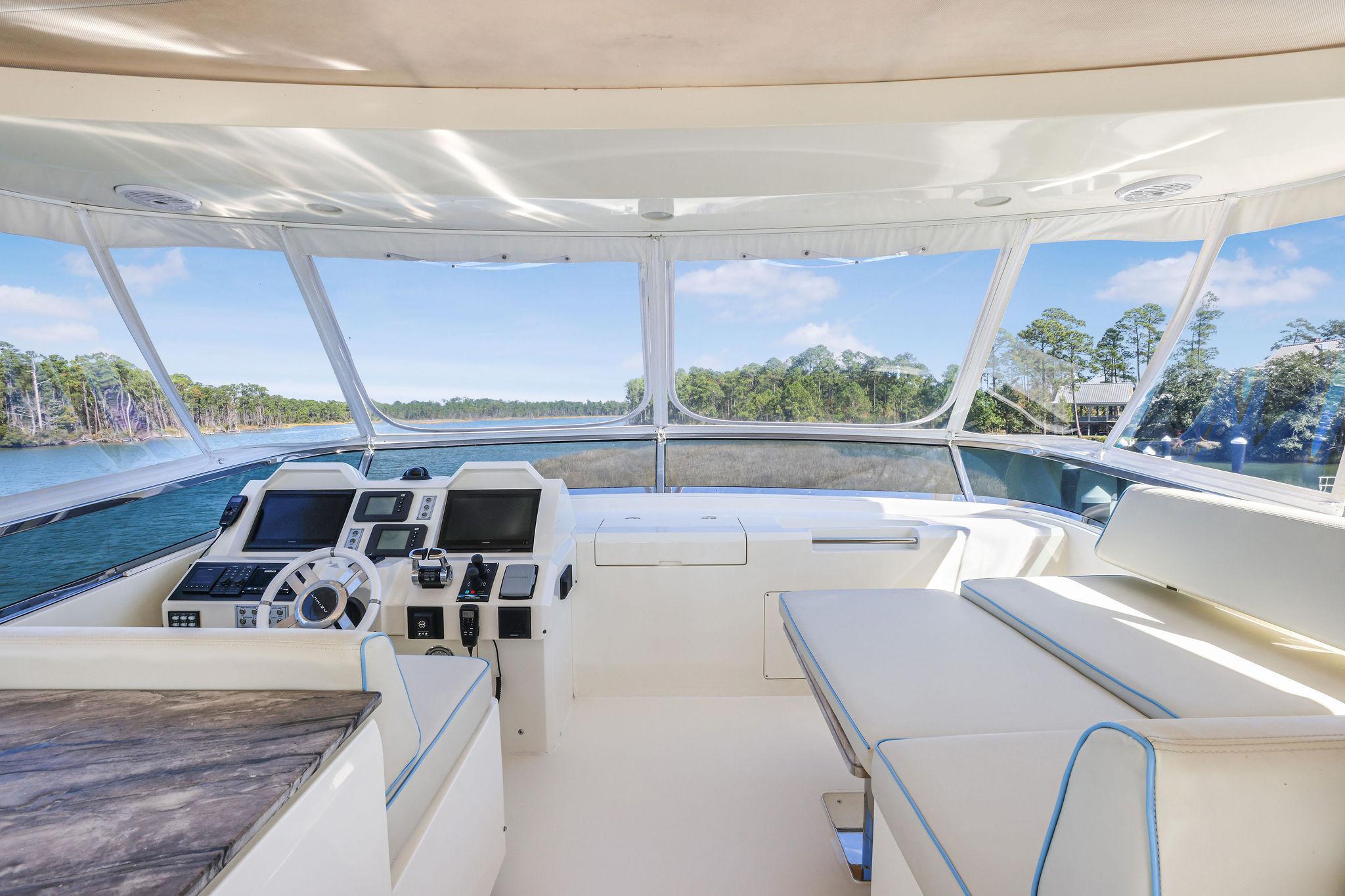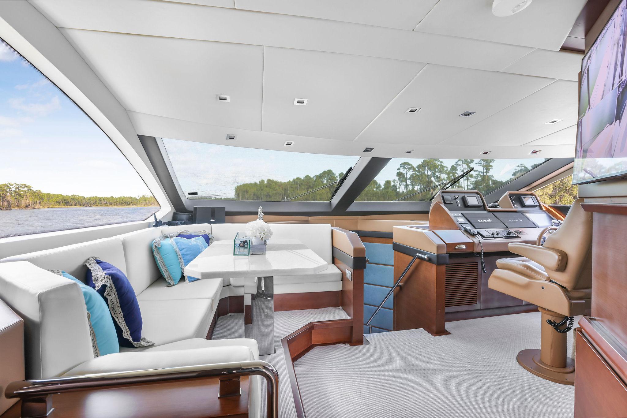 Furthest forward on the main deck there is a raised platform dinette with Ivory granite tabletop and C-shaped settee to the portside. Great place to serve as daytime desk or for a casual lunch. To starboard is the helm with two large leather electric adjustable helm chairs and full console of electronics and monitors. Behind are sliding doors to hide a couple of ships systems electrical panels.