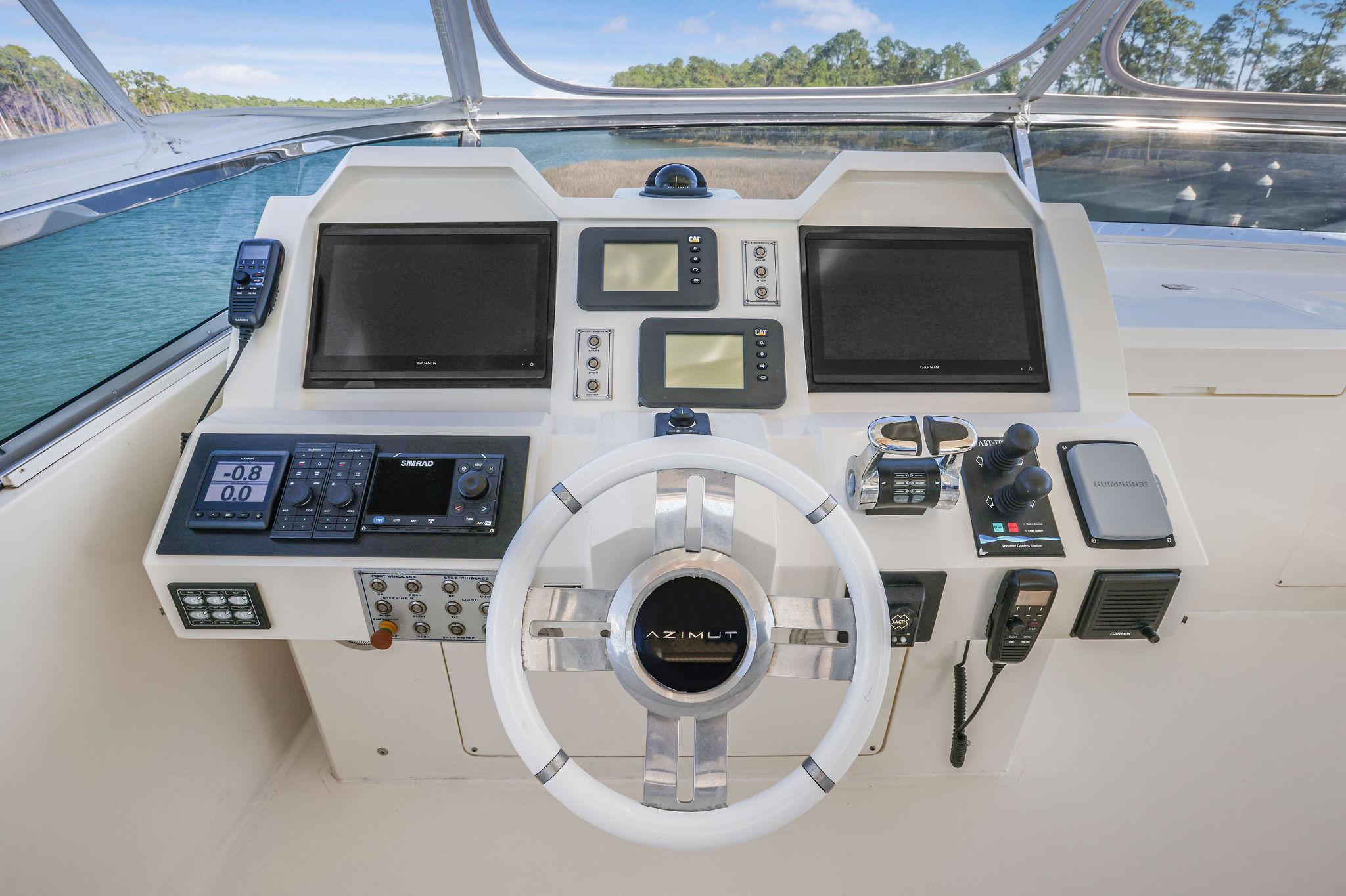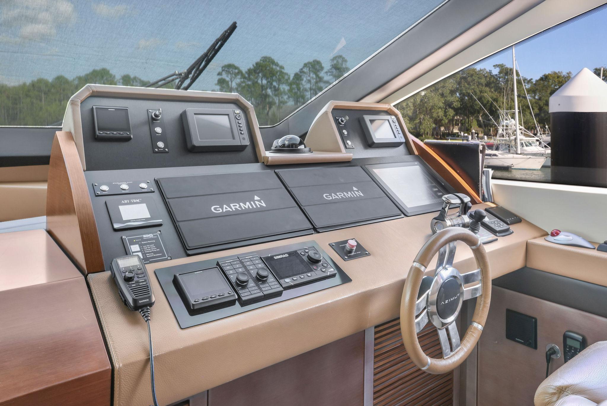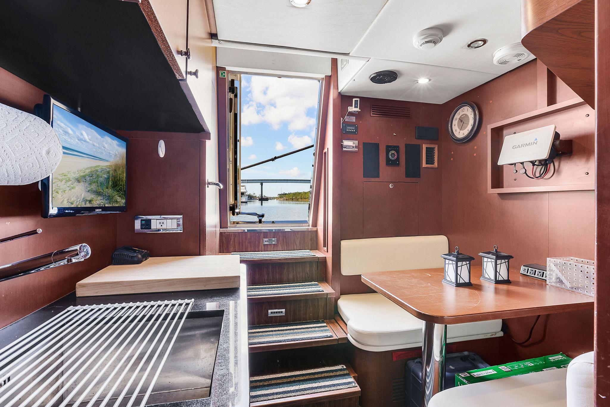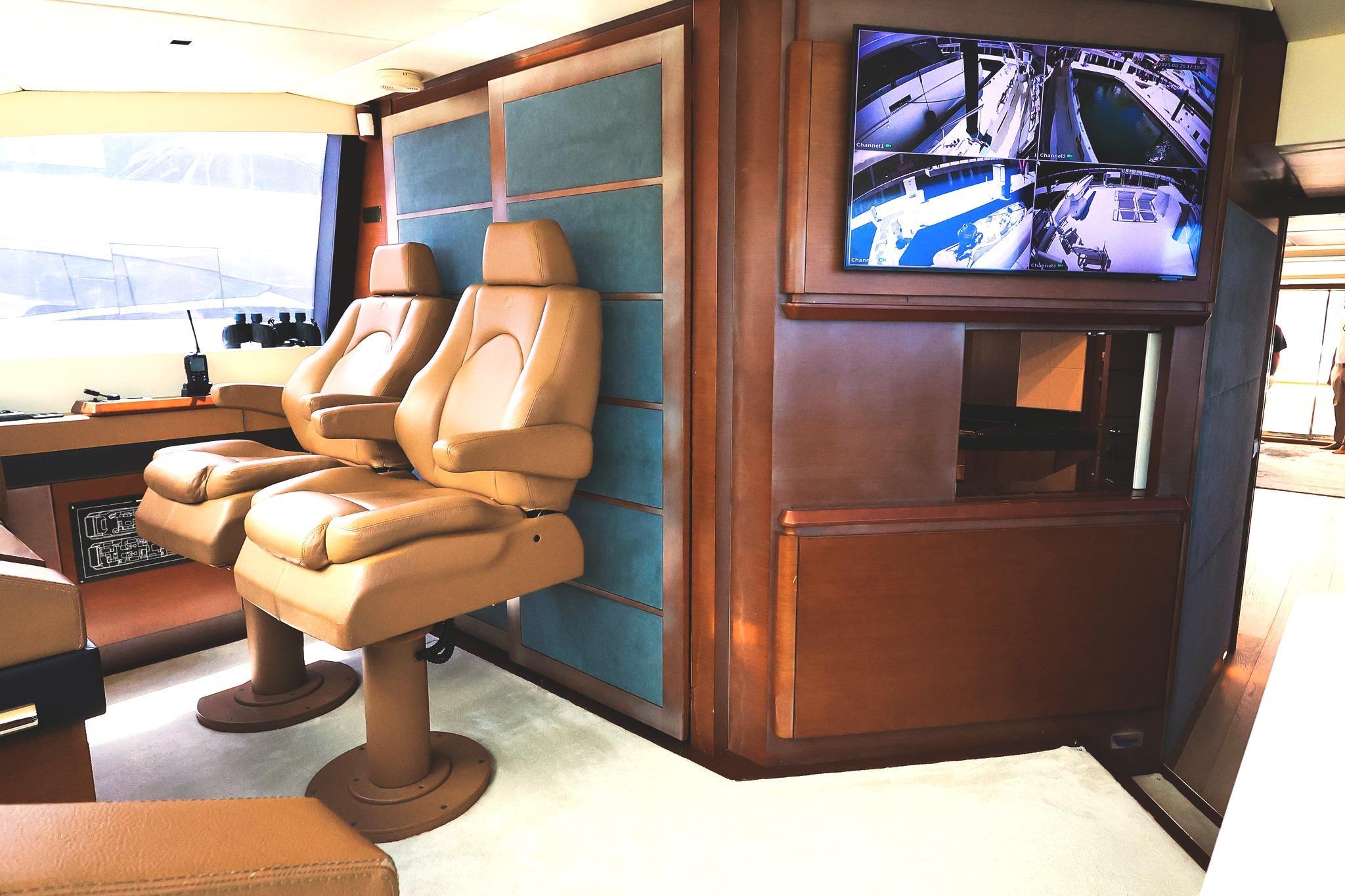 Furthest forward on the main deck there is a raised platform dinette with Ivory granite tabletop and C-shaped settee to the portside. Great place to serve as daytime desk or for a casual lunch. To starboard is the helm with two large leather electric adjustable helm chairs and full console of electronics and monitors. Behind are sliding doors to hide a couple of ships systems electrical panels.