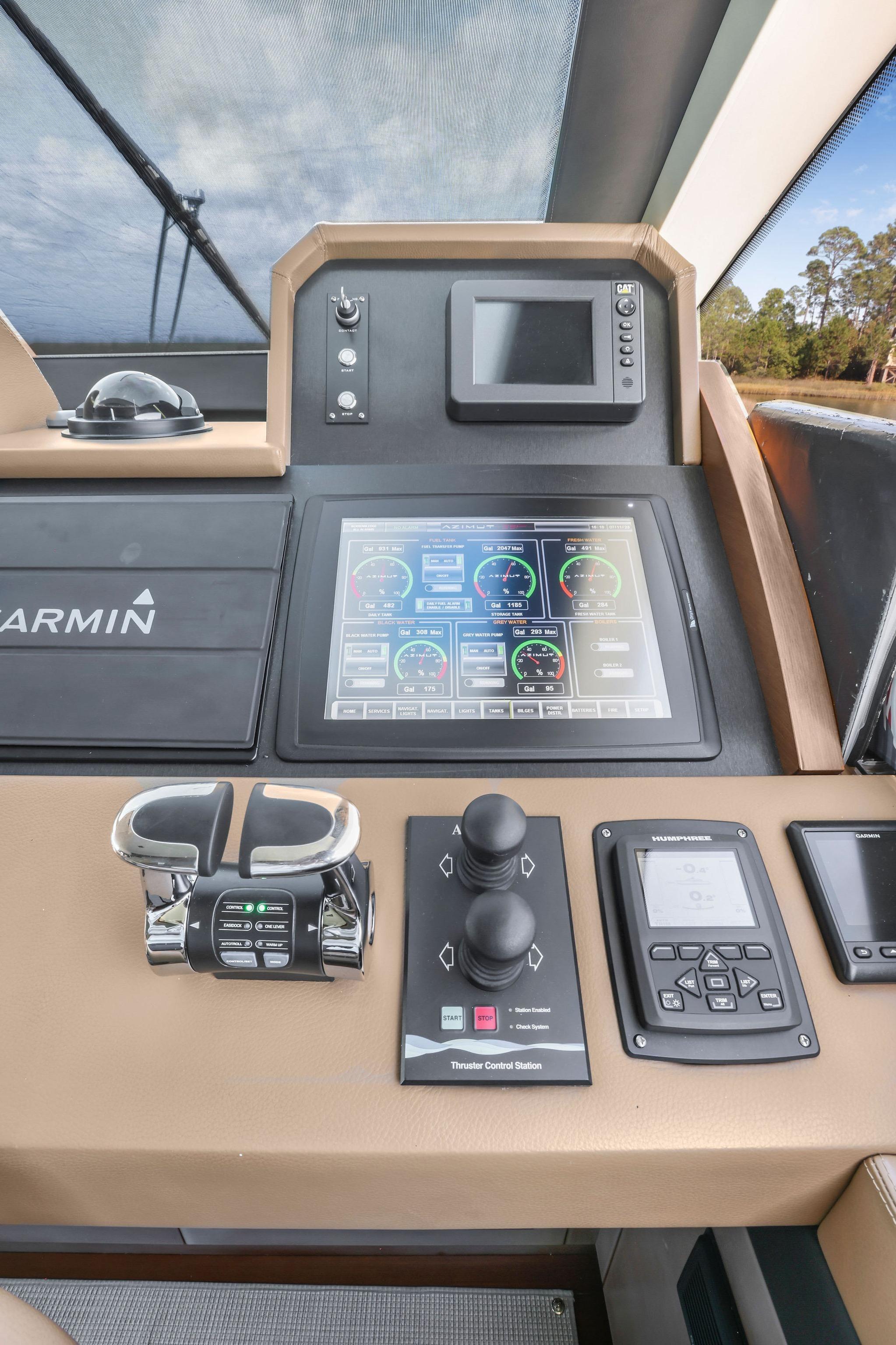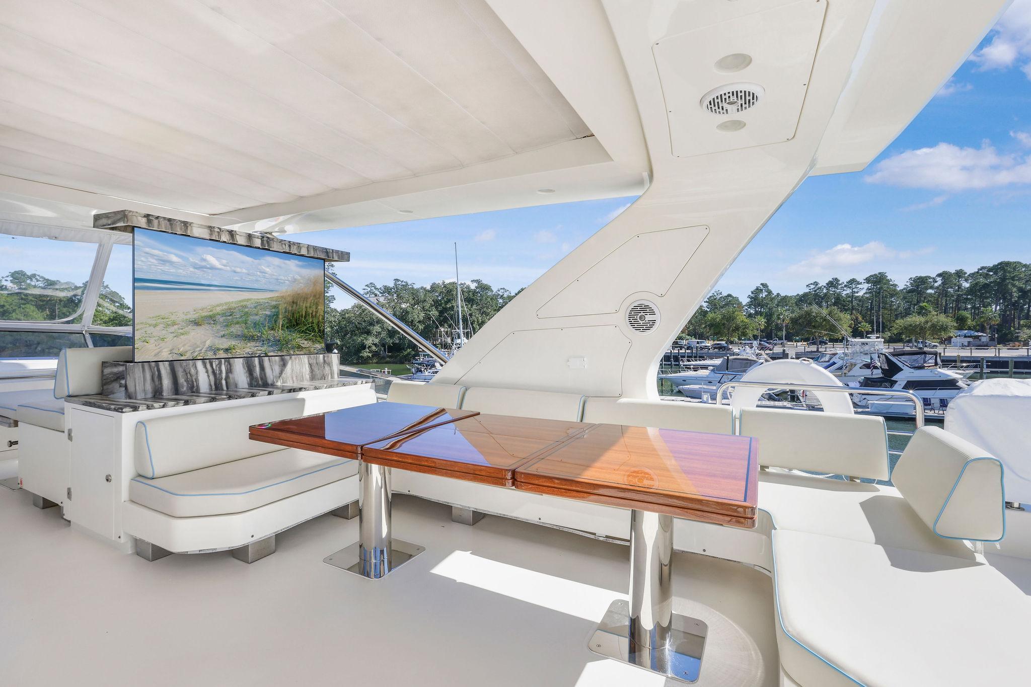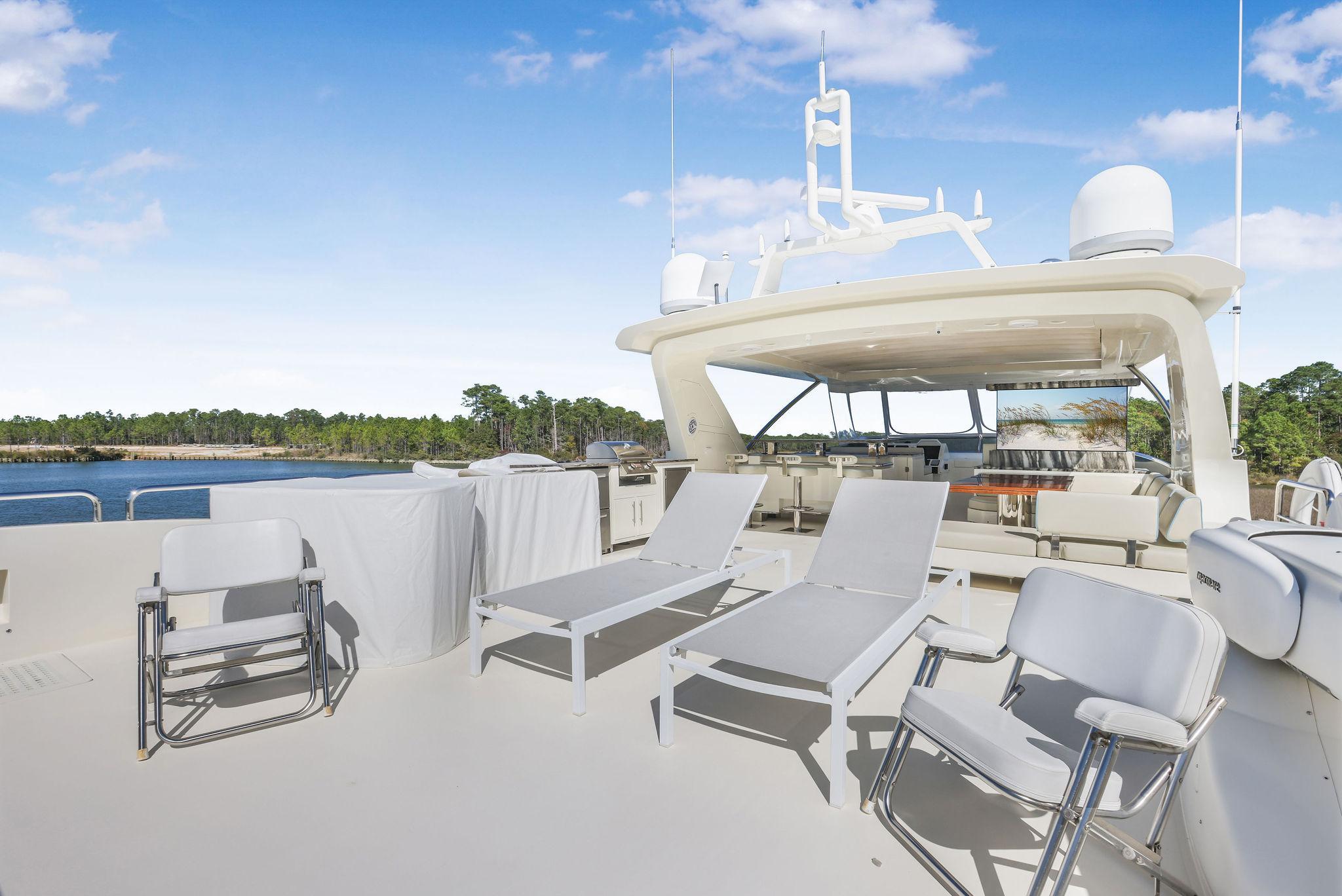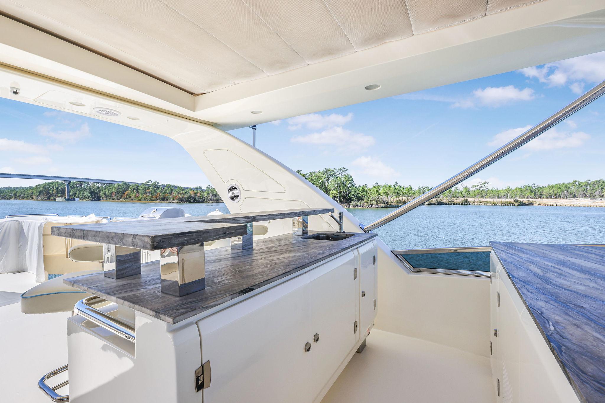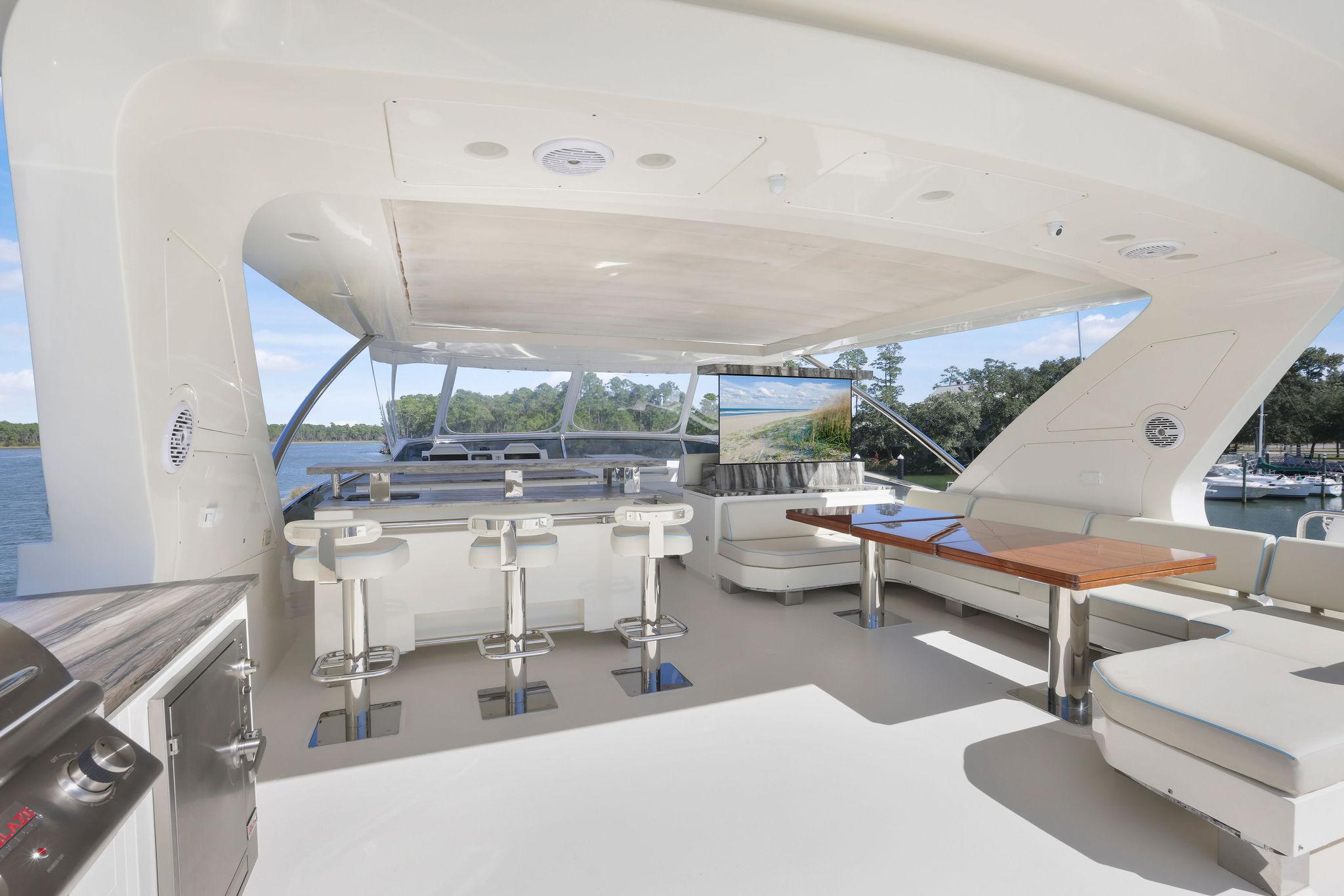 - Granite countertops on Flybridge with retractable pop-up 65” Smart TV, BLAZE outdoor kitchen with electric grill, BLAZE 2 drawer refrigerator, New icemaker, New BLAZE electric smoker
