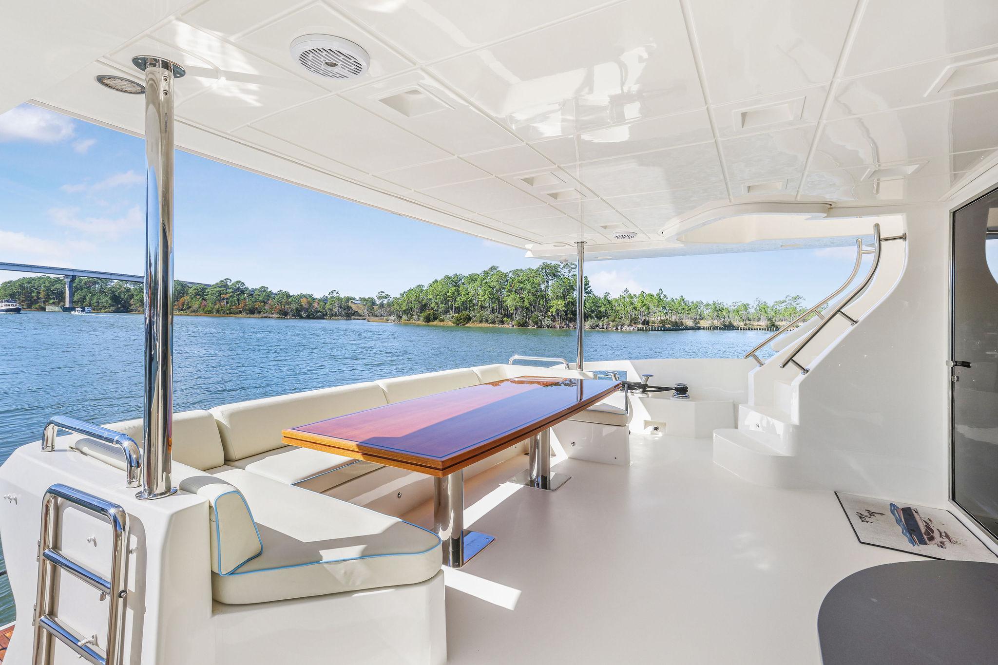 The aft deck has the benefit of a large overhang from the extended flybridge which covers the settee and large teak table. The sole has custom snap down Infinity Fabrics woven luxury vinyl which is comfortable, practical and good looking. Stairways lead down to the hydraulic swim platform from either side.
