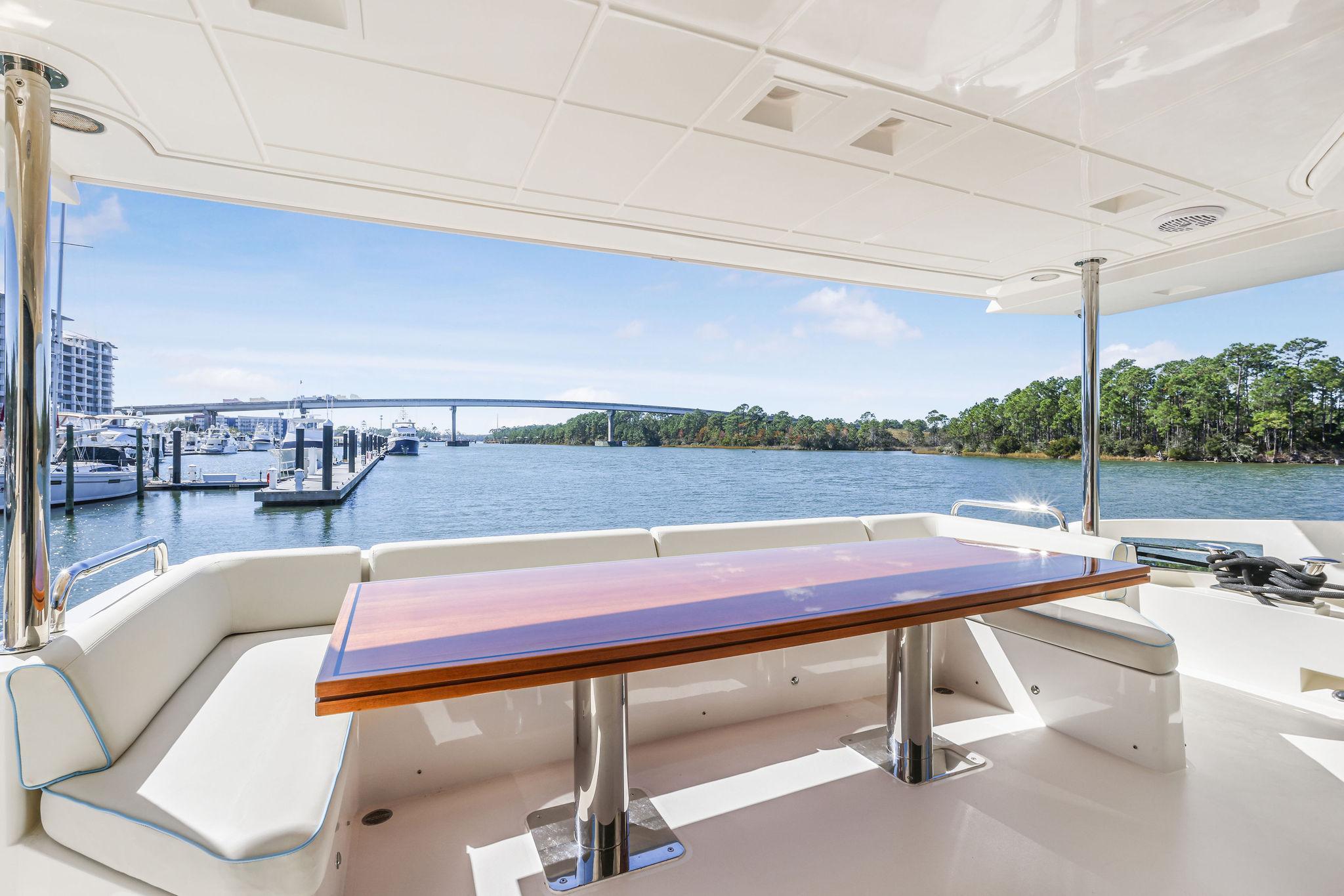 - All teak tables finished by Thomas Anthony’s Furniture, aft table, flybridge table, foredeck tables