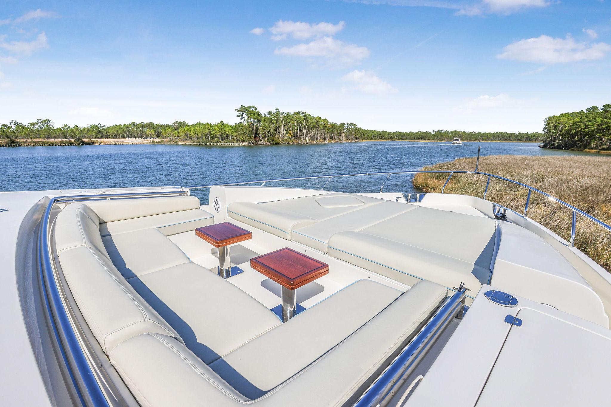 - Forward of the foredeck settee is a large sun pad. Beneath the bow sun pad is an emergency escape hatch from the forward stateroom.