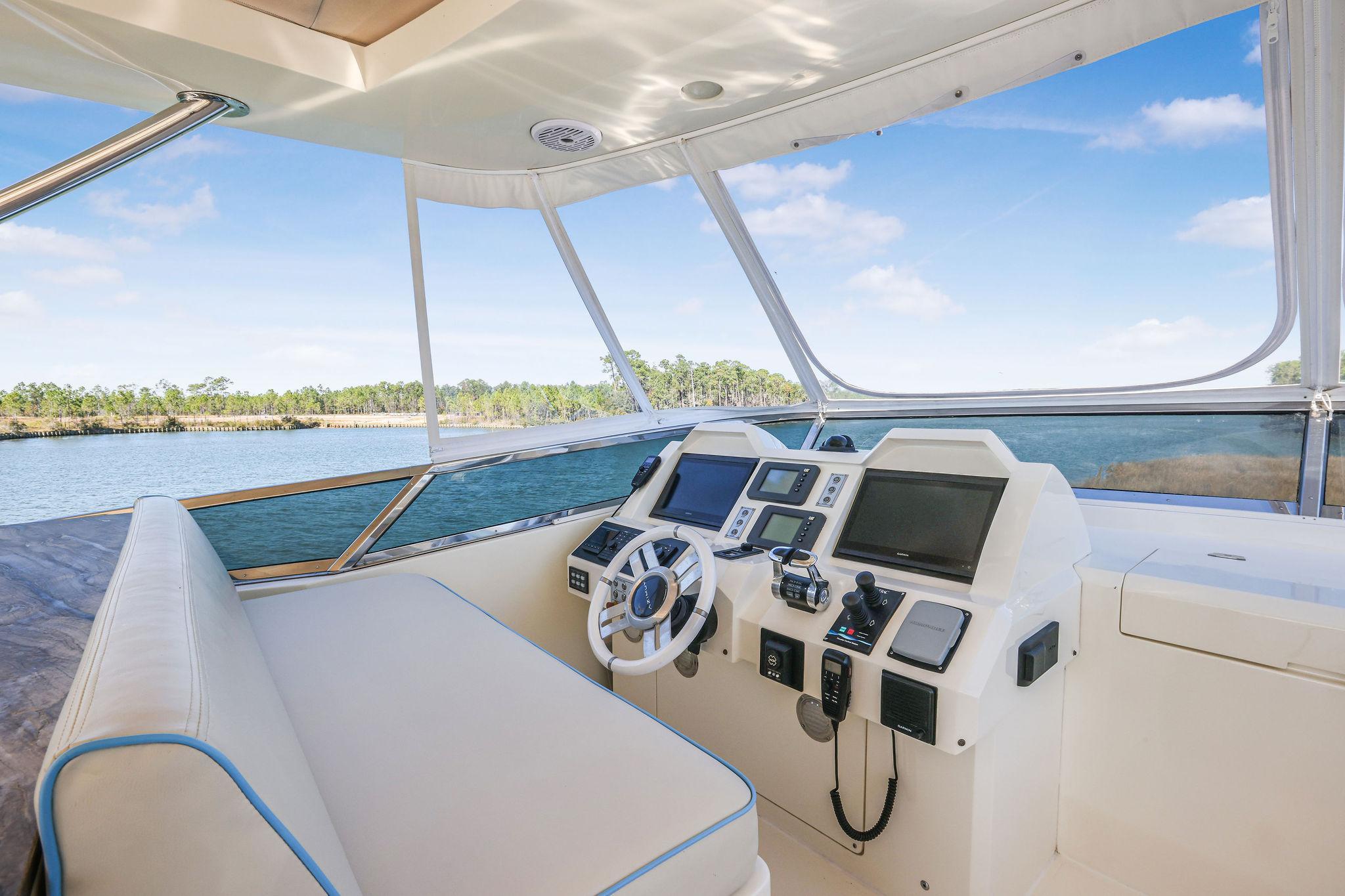 - Flybridge helm has a comfortable bench seat with Ivory cushions and light blue piping trim
