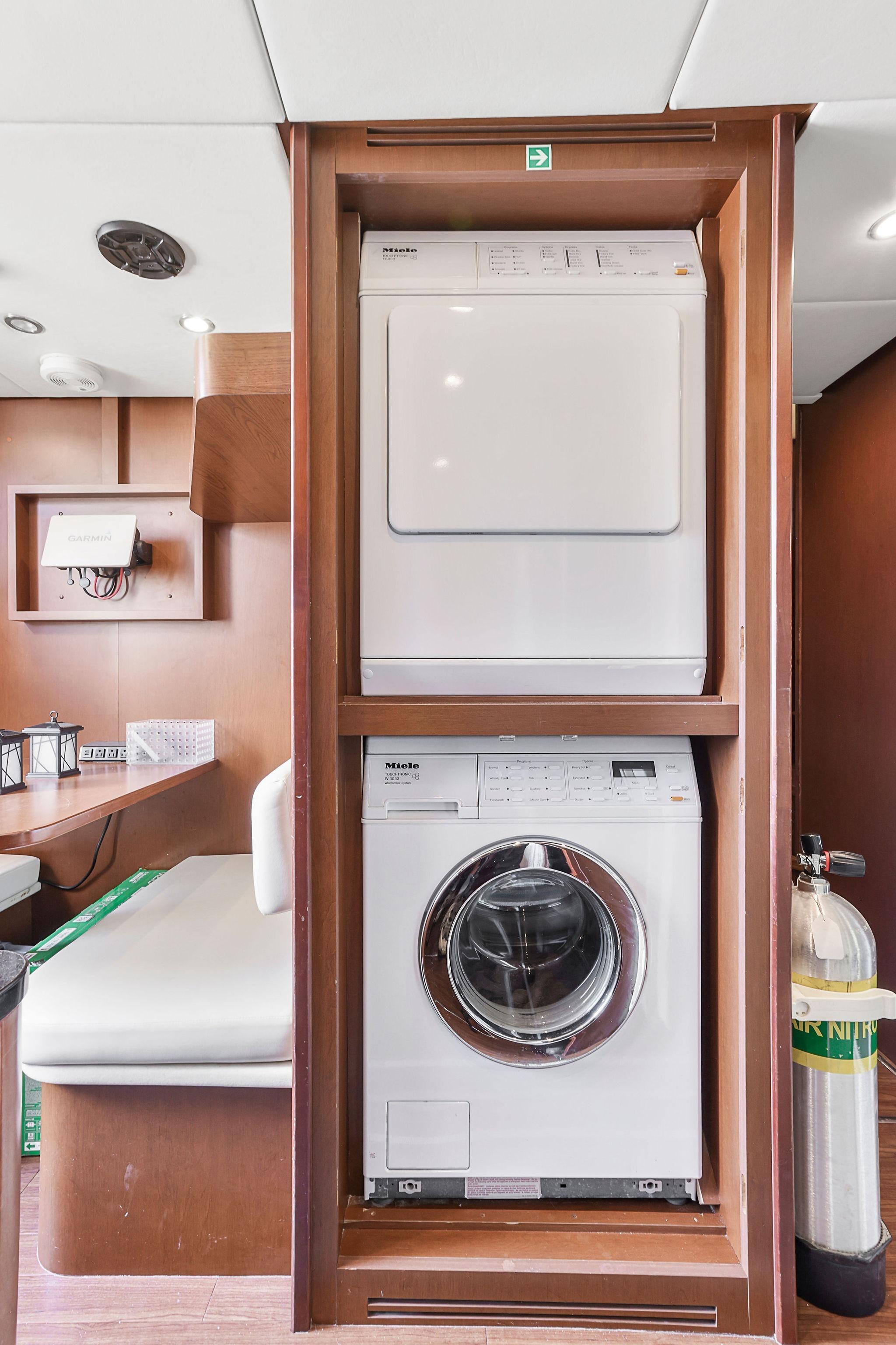 An aft door opens to the crew quarters and machinery space or they can also be accessed from a portside door with stairway down from the side deck. Two staterooms, a dinette lounge, and separate shower and sink/head compartments along with a pair of Miele washer and dryer. Entry to the engine room is forward.
