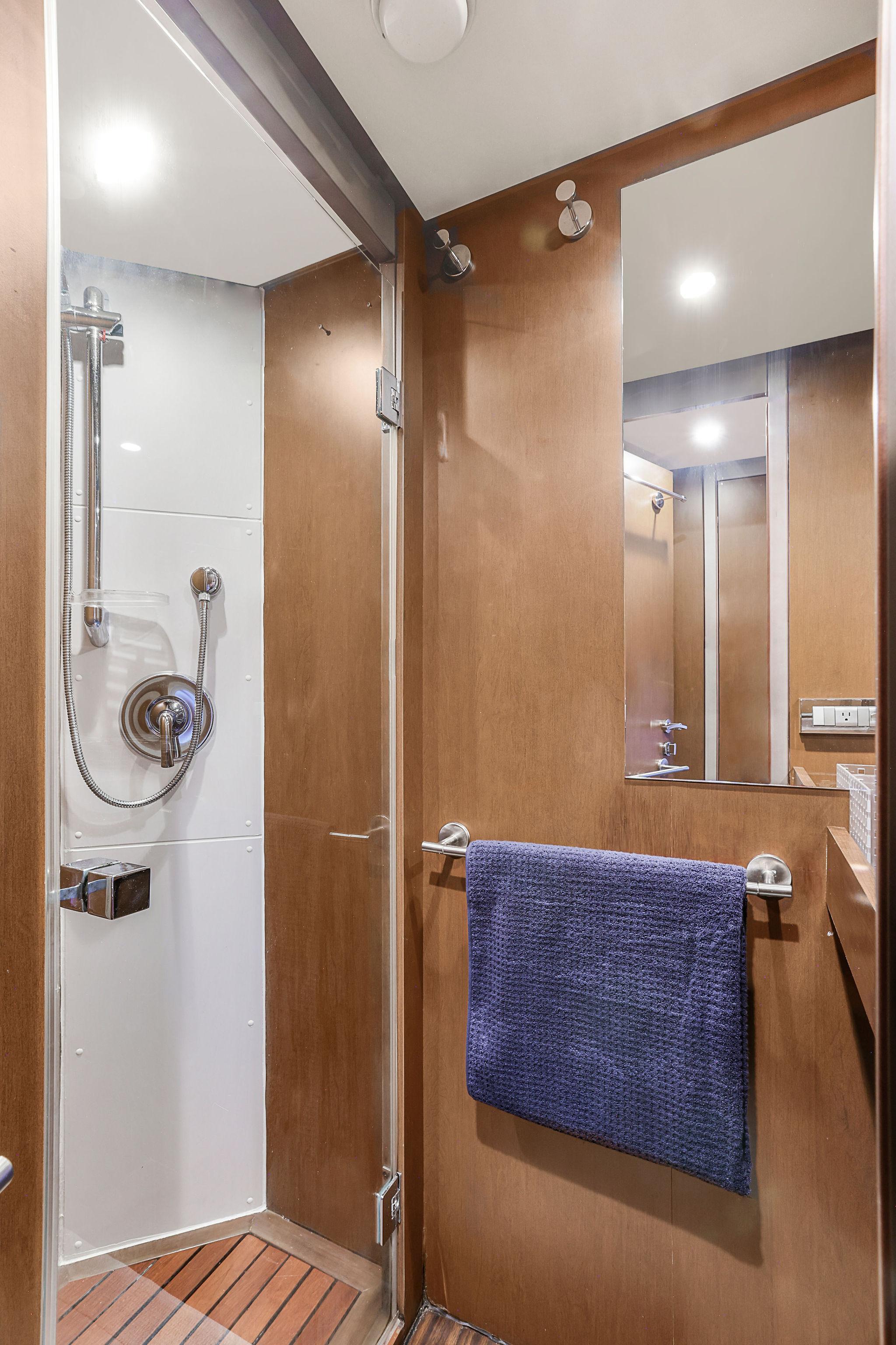 - Aft port corner of the flybridge is an outdoor shower with retractable wand sprayer and mesh drain