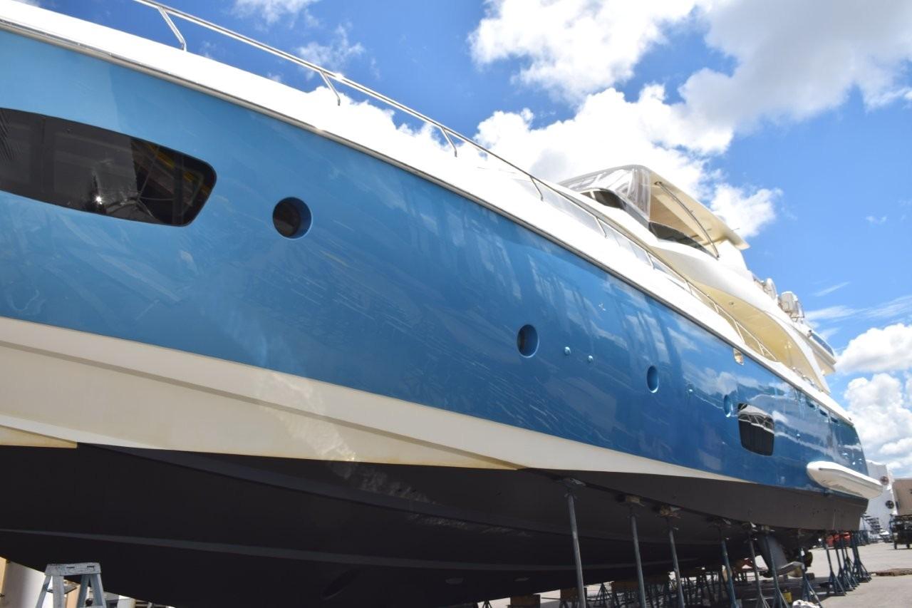 This 95’ Azimut has a great flybridge entertaining area which has been substantially upgraded including a deluxe outdoor kitchen, full bar area with stools, two beautifully finished teak wood dining tables which can be leaf joined into one with molded seating for 8 or more. There is a console on the starboard side which houses a pop-up 65” smart TV. All the cushions are the Ivory vinyl with light blue piping trim. There is a curved stairway from the aft deck which accesses the bridge. This stairway has a custom canvas enclosure which gives privacy as well as weather protection.