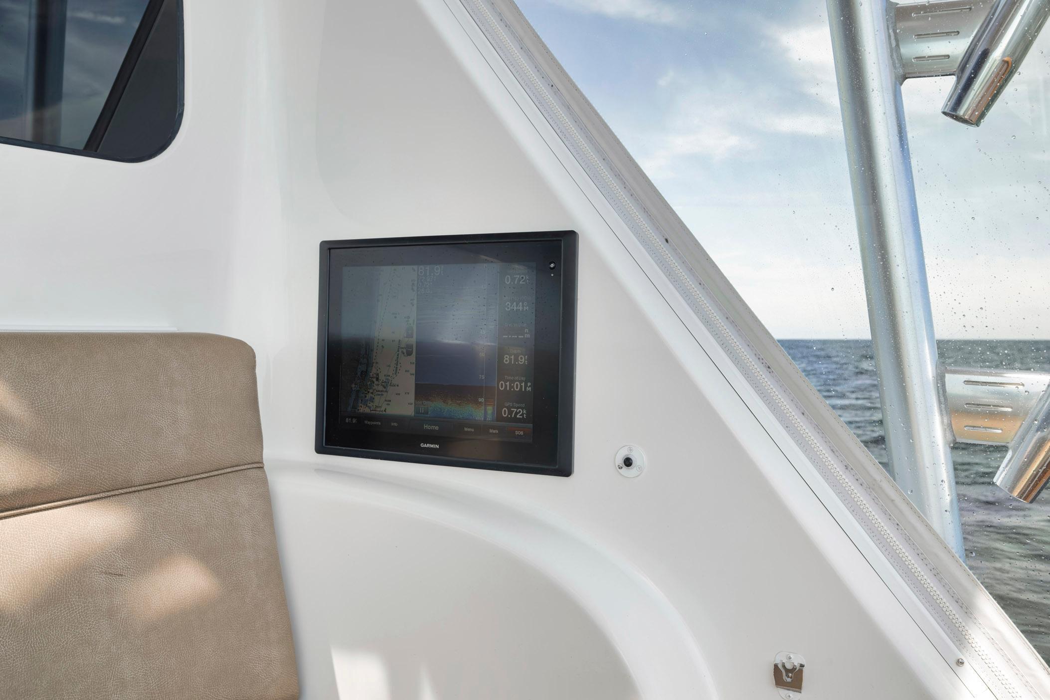 Curves also highlight and accentuate the 208 square-foot cockpit with its observation mezzanine that provides ample stowage, multiple freezers, an insulated refrigerated drink box in the salon entrance step, plenty of drawers, and engine room access. The lower cockpit provides a sizeable fish box, a stowage compartment and an available live well beneath the molded nonslip sole. A transom fish box/live well also is available.