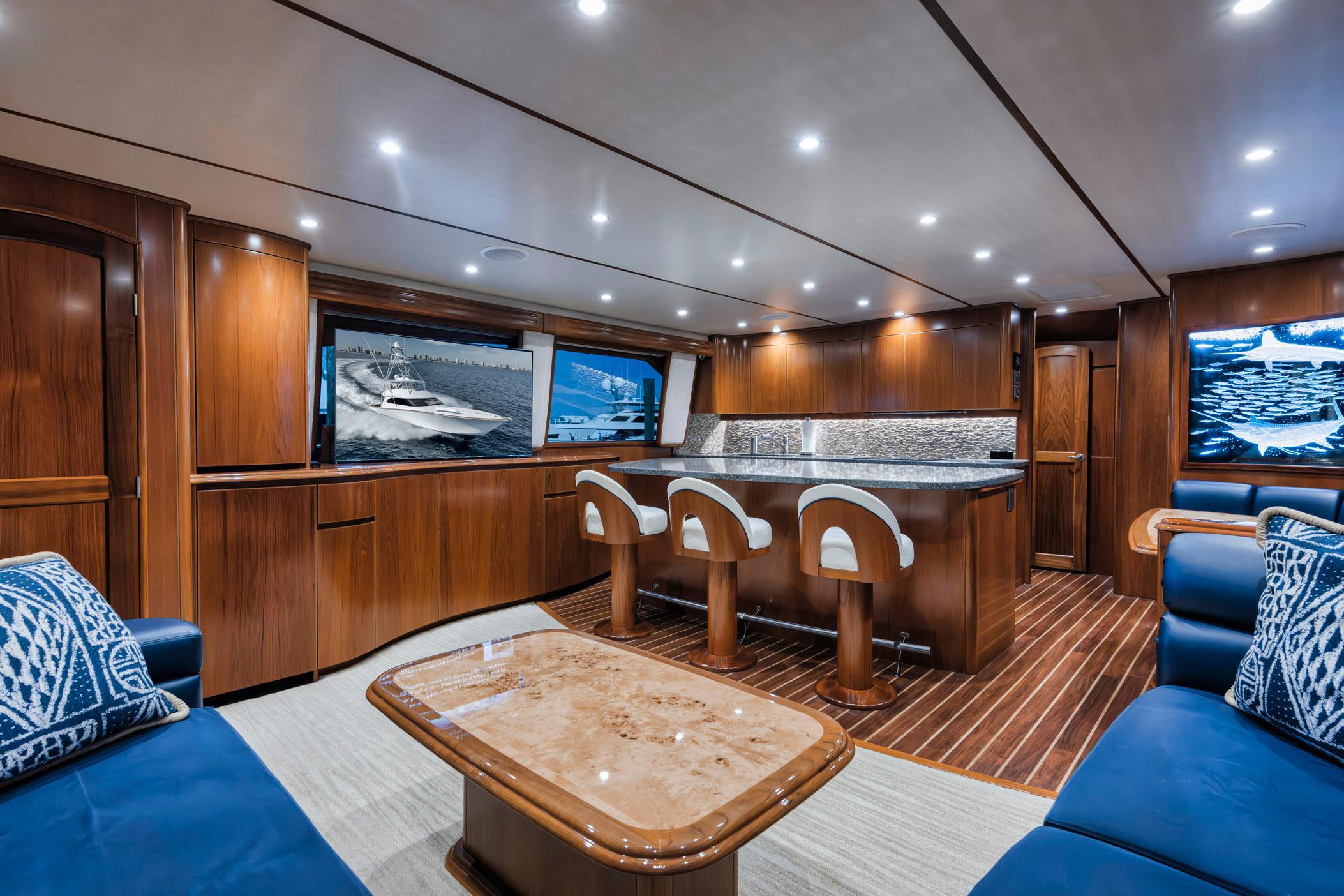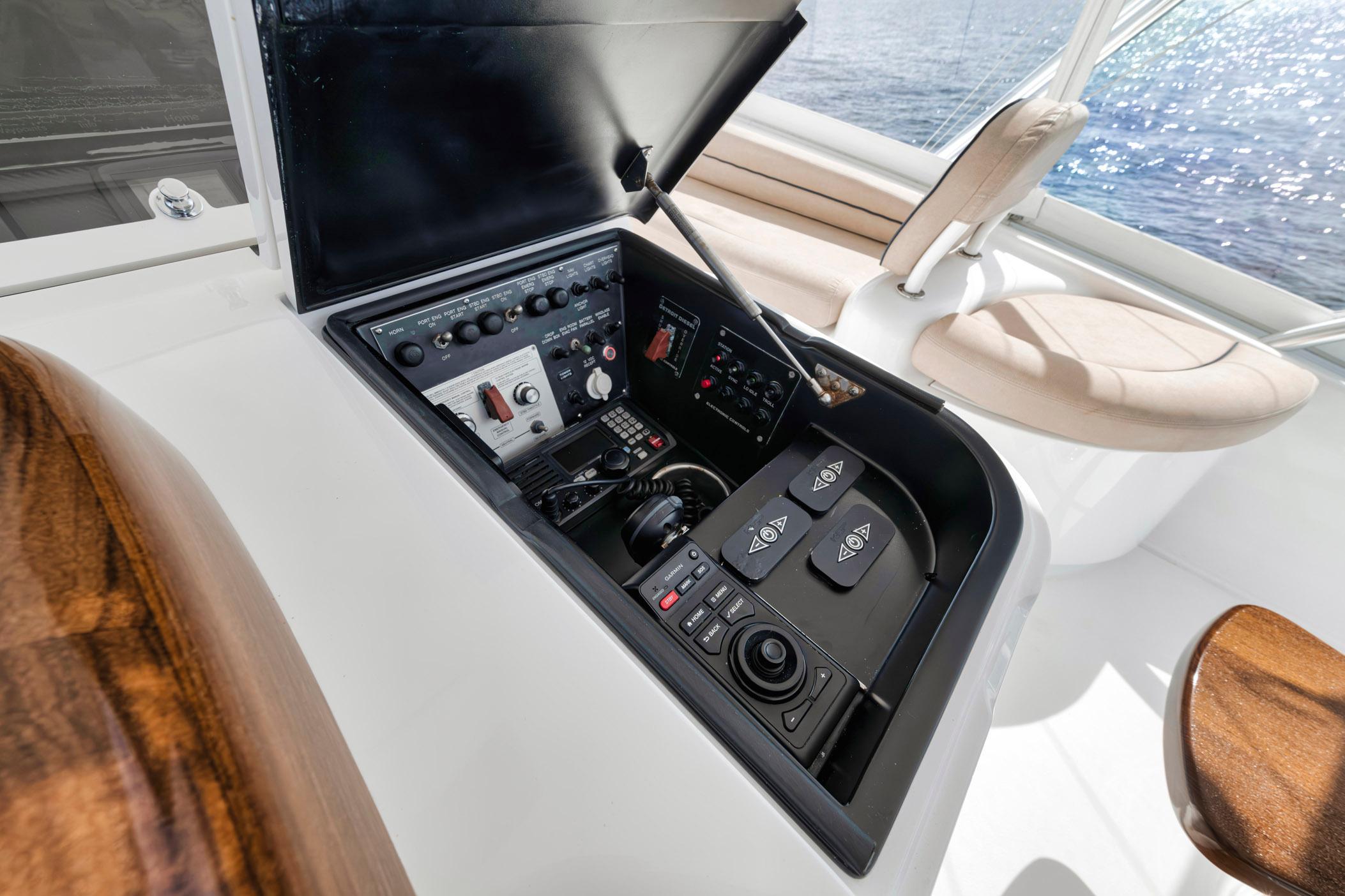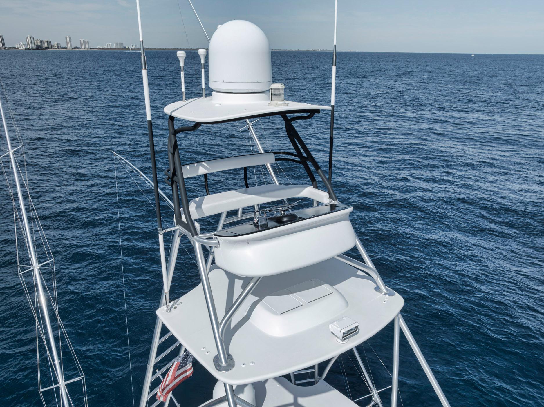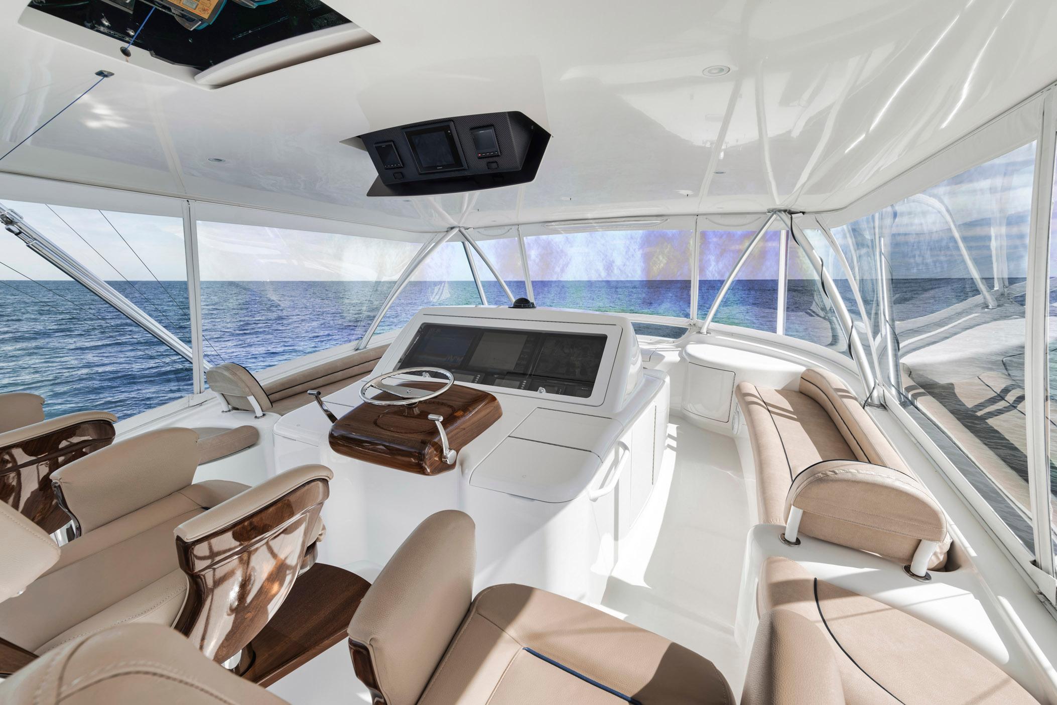 The tournament proven center console helm on the flying bridge delivers acute visibility to each point of the compass. Three adjustable Murray Products helm seats with teak ladder backs are standard. Additional seating is provided with port and starboard lounges each with rod stowage below and aft facing jump seats. Ahead of the command console is a third lounge, as well as a sink, freezer and drink box cooler.