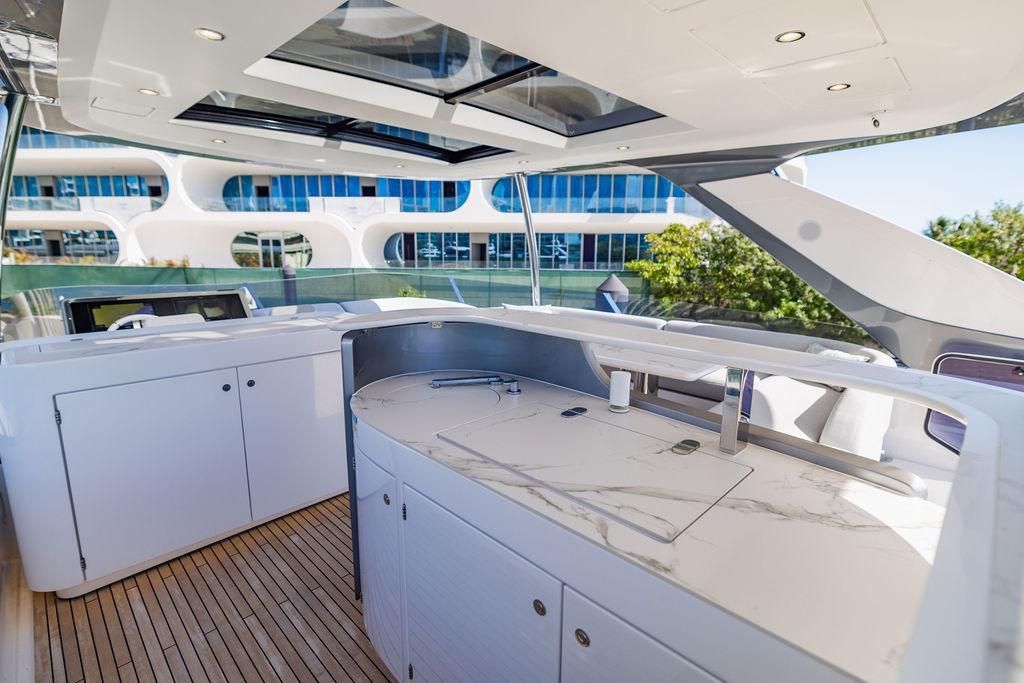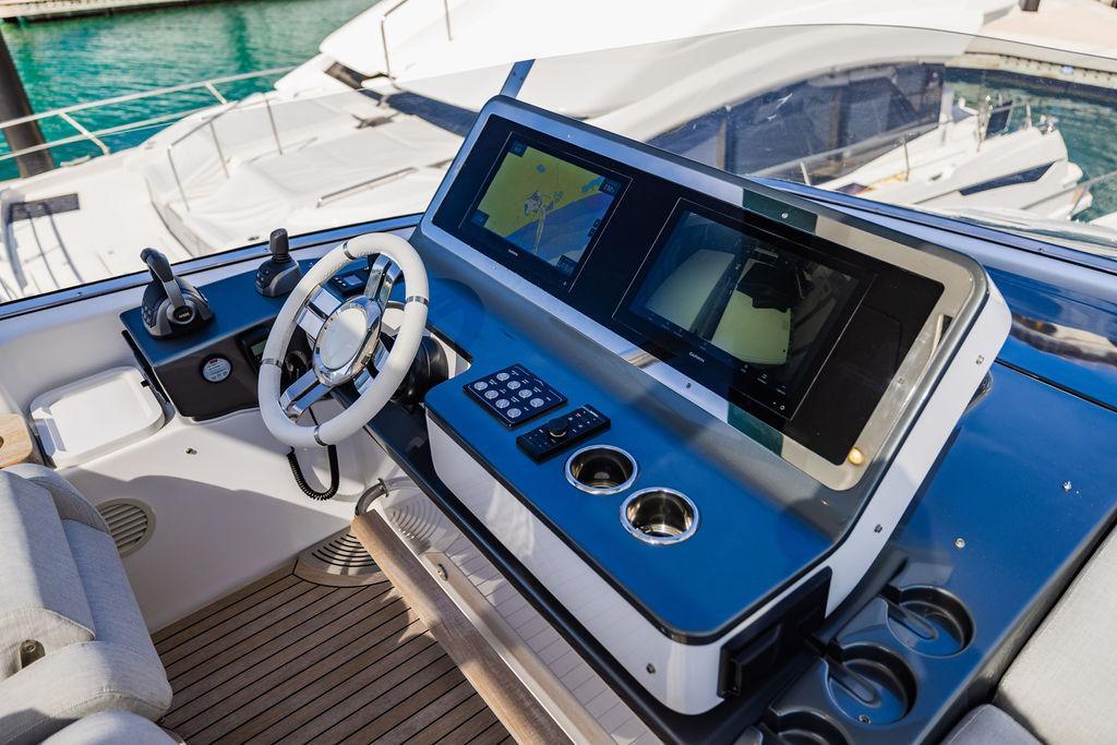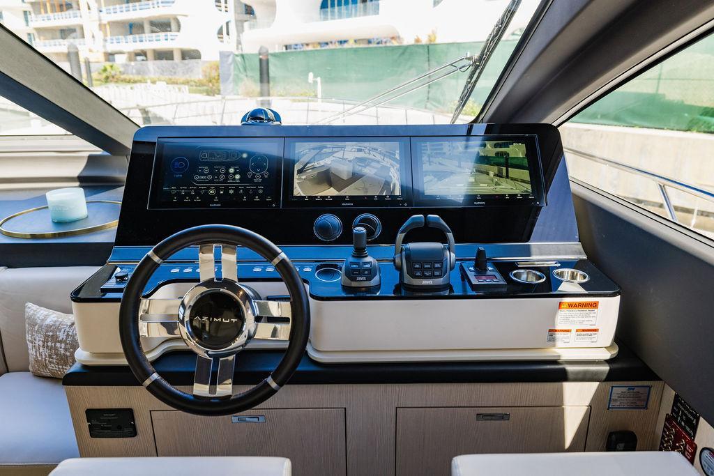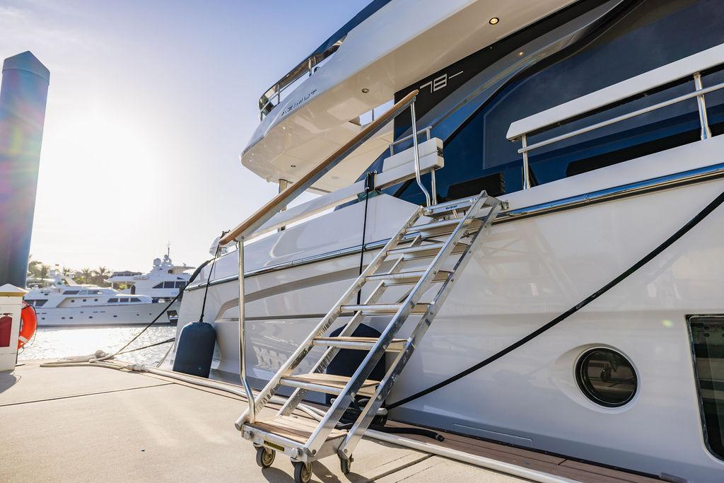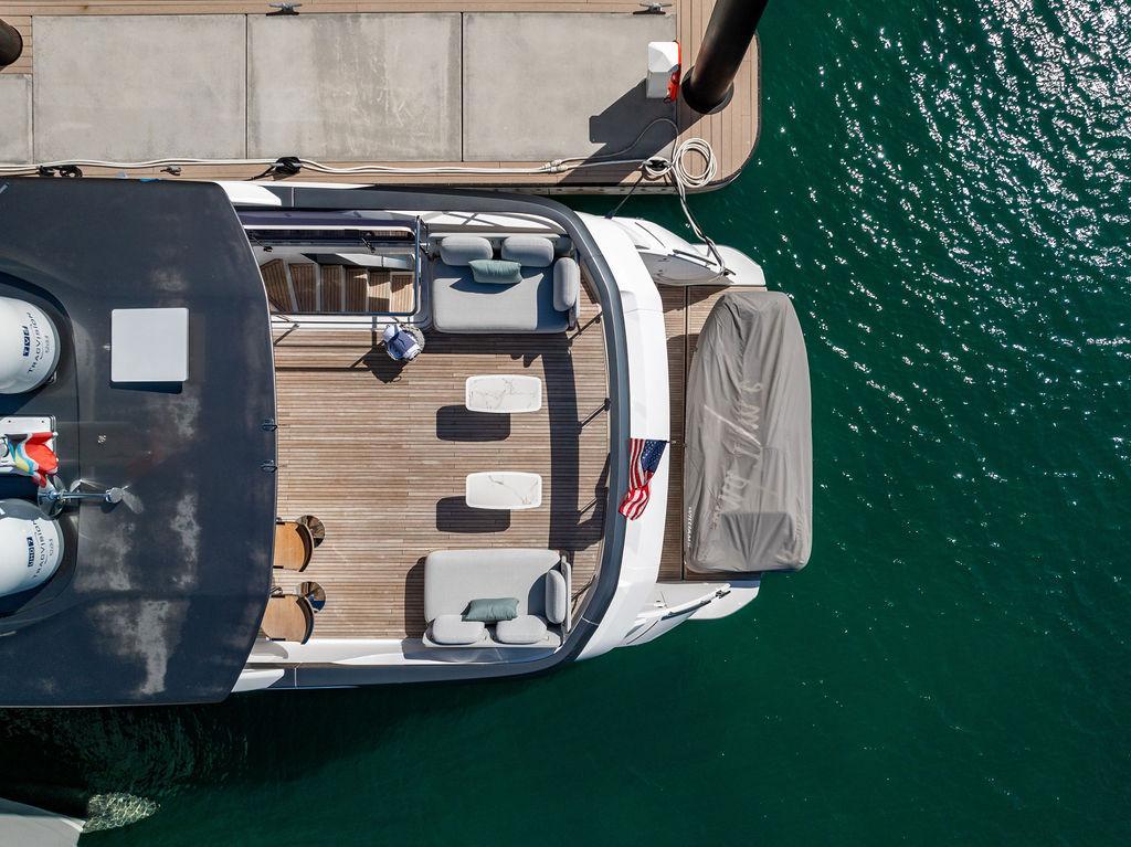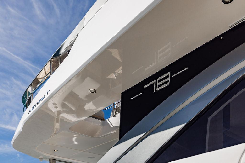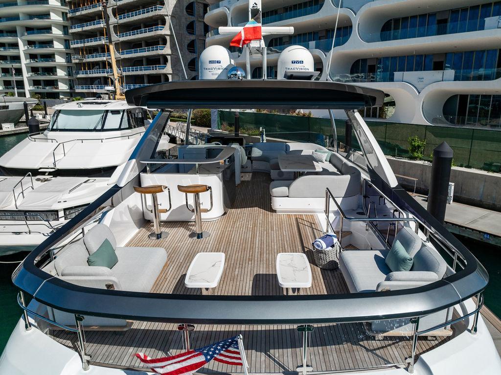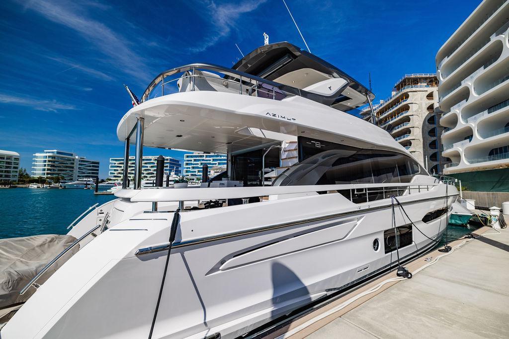 Through impeccable spatial solutions, the Fly 78 mimics the ambience of a larger yacht without compromising the sportive agility of smaller vessels. Secluded quarters eclipse behind-the-scenes service happenings, in the first ever boat in its category to organize completely partitioned areas for the galley and crew. A fluid and original onboard culture for the guests, elated by space blissand sheer sophistication.Revel in the atmosphere of the Fly 78, without compromise.Advance package :Black Water Tank Washing System, Dècor Upgrade Extra conduits,Grey Water Tank Washing System,,Miele appliances (upgrade for oven and cooktop), Watermaker predisposition (salt water - fresh water - electrical) OPTIONALS MAIN SYSTEM: 3 x VOLVO IPS 1350 (1000 hp) upgrade, Air Purification System Clearline, air conditioning raw water purification system, Cockpit docking station and bow thruster, (including engines control joystick and thruster control), Dynamic positioning system - Skyhook, Seakeeper Stabilizer 26 EXTERIOR: Bow sun shade with removable carbon fiber poles for sunbathing area and sitting area, Bow table with corian frame and synthetic marble insert, Cockpit awning (automatic), Cockpit Chair (mod. Oskar), Cockpit furniture with corian frame and synthetic marble insert top, Co-pilot seat on fly, Dimmer lights on fly, Electric awning for aft flybridge (requires hard top), Electric searchlight upgrade to ACR Flagpole, Flybridge hatch, Hard top (painted in Etna Grey), Lounge furniture on aft fly with two love seats in Batyline fabric (A000127336) and two coffee tables with corian frame and synthetic marble insert, Luxury lighting package for exteriors, Painted boot stripe, Painted flybridge furniture (frontal panel) in Grigio Savoia, Manouvering lights on bow (nr.2), Teak on flybridge deck, Telescopic gangway, Nr. 2 exterior teak stools for flybridge bar, Spreader lights on aft fly, Synthetic marble insert for the lower part of the flybridge bar furniture top, Underwater lights under sponsons (2X2) and transom (3) Oceanled S3124S, Upgraded standard exterior cushions in Batyline fabric (A000127336), Upgraded standard exterior teak tables and tops in corian frame with syntetic marble insert tops, Watertight hand control for anchor winch.INTERIOR: Co-pilot seat in main helm, Forward salon sofa (lounge version), Additional storage cabinet in vip cabin designed by Achille Salvagni, Black-out system for master cabin curtains, Carpet Besana Royal 43 Divina Icelandic in lower deck, Dividing wall with door in crew cabin, Domotic lighting system in salon, Dresser in master cabin with settee in lieu of standard sofa on port side, Electric roman blinds with integrated blackout system in salon (in lieu of standard manual roman blinds), Gentas Cement floor for galley and main helm, Heads floor in Gentash Cement 26 (in lieu of standard teak floors), Lacquered bronze color inserts on forward salon bulkhead (in lieu of standard white lacquered inserts), Master head shower wall in Quartzite Statuario (in lieu of standard laminate with slate finishing), Mosquito net for portholes Roman blinds in master cabin (in lieu of standard venetian blinds), Roman blinds with integrated blackout system in vip and guest cabins (in lieu of standard venetian blinds), Safe in crew cabin Safe in master cabin Scenic lights for interior, Set of linens for cabins (crew cabin not included), Set of linens for crew cabin (standard configuration), Set of linens for third bed in crew cabin, Set of towels for one person with Azimut logo, Third bed in crew cabin, Toilet with bidet faucet feature in master head Wooden floor in main deckAPPLIANCES: Barbecue for flybridge furniture, Dishwasher Icemaker on fly Refrigerator and icemaker for cockpit furniture, Washer and dryer in crew cabin (2 units), Winecooler in galleyELECTRONICS: Garmin AIS 800 Garmin videocameras (nr.3), Raymarine Flir M364-C thermal camera, Volvo Glass Platinum packageVIDEO - TV - HI-FI Audio/Video Package (with SAT TV Antenna KVH Tracvision HD7 and Decoders) (hi-lo system for TV in salon included), Flybridge furniture with 43'' TV and lift with decoders and antennaEXTRAS; SMALLER HI-LO TABLE IN SALON TO BE ALIGNED TO THE AFT SIDE OF THE SOFA, IN ONE SINGLE FINISHING: BRUSHED OAK GRAY 10 GLOSS SALON COFFEE TABLE IN LEATHER A000120541 IN LIEU OF STD. LEATHER A000139335