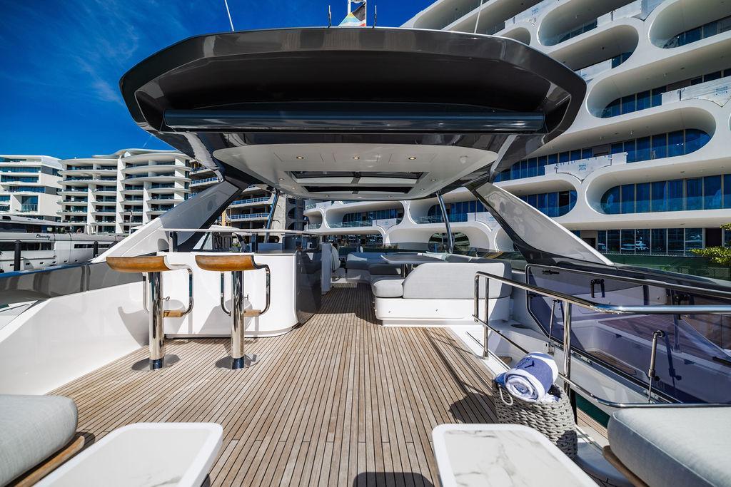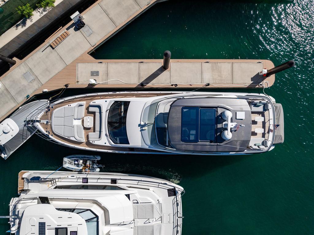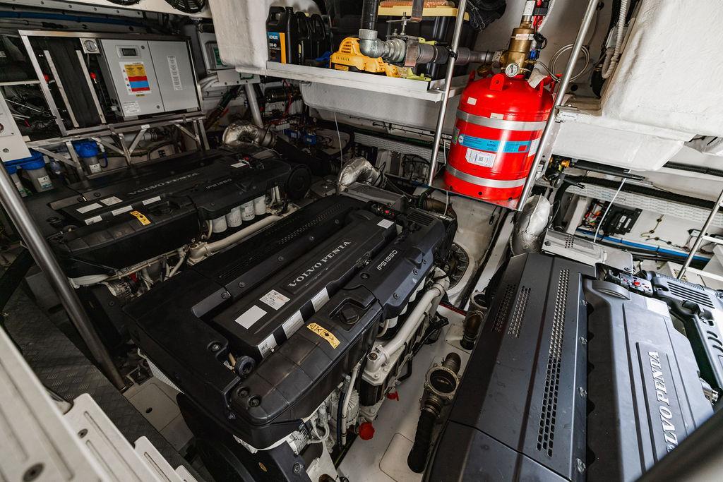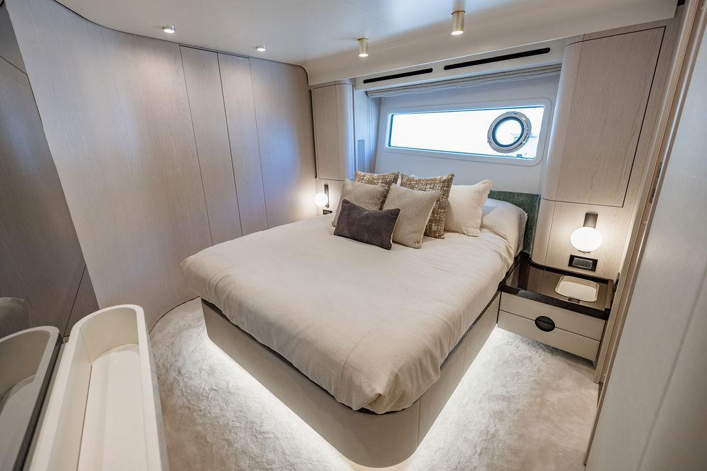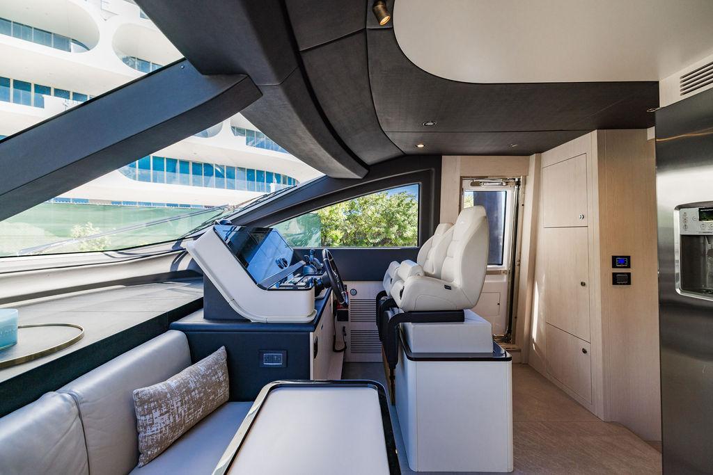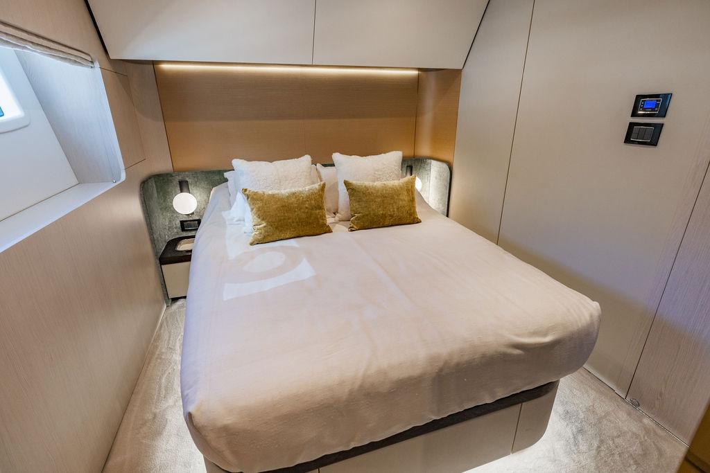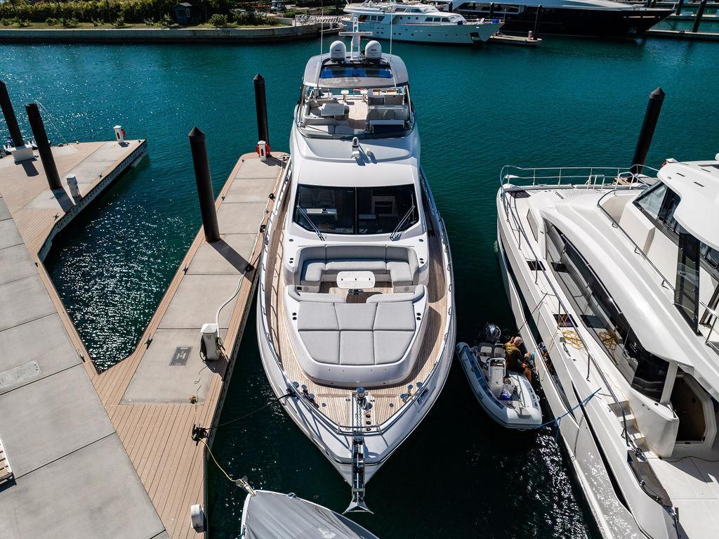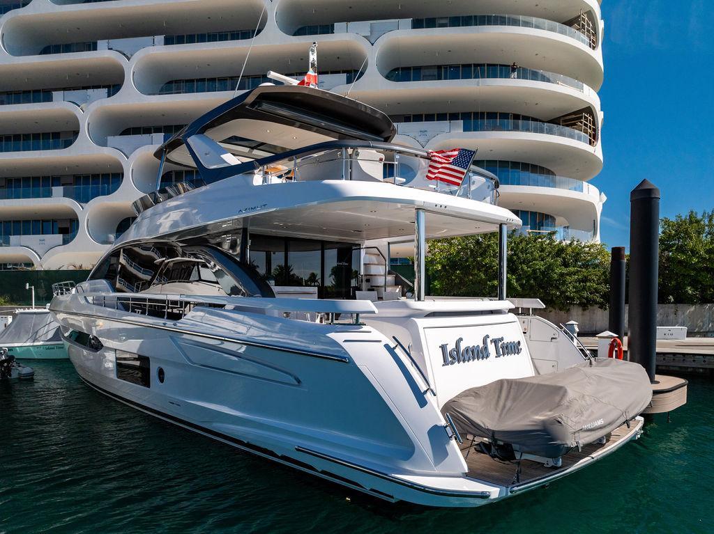Through impeccable spatial solutions, the Fly 78 mimics the ambience of a larger yacht without compromising the sportive agility of smaller vessels. Secluded quarters eclipse behind-the-scenes service happenings, in the first ever boat in its category to organize completely partitioned areas for the galley and crew. A fluid and original onboard culture for the guests, elated by space blissand sheer sophistication.Revel in the atmosphere of the Fly 78, without compromise.Advance package :Black Water Tank Washing System, Dècor Upgrade Extra conduits,Grey Water Tank Washing System,,Miele appliances (upgrade for oven and cooktop), Watermaker predisposition (salt water - fresh water - electrical) OPTIONALS MAIN SYSTEM: 3 x VOLVO IPS 1350 (1000 hp) upgrade, Air Purification System Clearline, air conditioning raw water purification system, Cockpit docking station and bow thruster, (including engines control joystick and thruster control), Dynamic positioning system - Skyhook, Seakeeper Stabilizer 26 EXTERIOR: Bow sun shade with removable carbon fiber poles for sunbathing area and sitting area, Bow table with corian frame and synthetic marble insert, Cockpit awning (automatic), Cockpit Chair (mod. Oskar), Cockpit furniture with corian frame and synthetic marble insert top, Co-pilot seat on fly, Dimmer lights on fly, Electric awning for aft flybridge (requires hard top), Electric searchlight upgrade to ACR Flagpole, Flybridge hatch, Hard top (painted in Etna Grey), Lounge furniture on aft fly with two love seats in Batyline fabric (A000127336) and two coffee tables with corian frame and synthetic marble insert, Luxury lighting package for exteriors, Painted boot stripe, Painted flybridge furniture (frontal panel) in Grigio Savoia, Manouvering lights on bow (nr.2), Teak on flybridge deck, Telescopic gangway, Nr. 2 exterior teak stools for flybridge bar, Spreader lights on aft fly, Synthetic marble insert for the lower part of the flybridge bar furniture top, Underwater lights under sponsons (2X2) and transom (3) Oceanled S3124S, Upgraded standard exterior cushions in Batyline fabric (A000127336), Upgraded standard exterior teak tables and tops in corian frame with syntetic marble insert tops, Watertight hand control for anchor winch.INTERIOR: Co-pilot seat in main helm, Forward salon sofa (lounge version), Additional storage cabinet in vip cabin designed by Achille Salvagni, Black-out system for master cabin curtains, Carpet Besana Royal 43 Divina Icelandic in lower deck, Dividing wall with door in crew cabin, Domotic lighting system in salon, Dresser in master cabin with settee in lieu of standard sofa on port side, Electric roman blinds with integrated blackout system in salon (in lieu of standard manual roman blinds), Gentas Cement floor for galley and main helm, Heads floor in Gentash Cement 26 (in lieu of standard teak floors), Lacquered bronze color inserts on forward salon bulkhead (in lieu of standard white lacquered inserts), Master head shower wall in Quartzite Statuario (in lieu of standard laminate with slate finishing), Mosquito net for portholes Roman blinds in master cabin (in lieu of standard venetian blinds), Roman blinds with integrated blackout system in vip and guest cabins (in lieu of standard venetian blinds), Safe in crew cabin Safe in master cabin Scenic lights for interior, Set of linens for cabins (crew cabin not included), Set of linens for crew cabin (standard configuration), Set of linens for third bed in crew cabin, Set of towels for one person with Azimut logo, Third bed in crew cabin, Toilet with bidet faucet feature in master head Wooden floor in main deckAPPLIANCES: Barbecue for flybridge furniture, Dishwasher Icemaker on fly Refrigerator and icemaker for cockpit furniture, Washer and dryer in crew cabin (2 units), Winecooler in galleyELECTRONICS: Garmin AIS 800 Garmin videocameras (nr.3), Raymarine Flir M364-C thermal camera, Volvo Glass Platinum packageVIDEO - TV - HI-FI Audio/Video Package (with SAT TV Antenna KVH Tracvision HD7 and Decoders) (hi-lo system for TV in salon included), Flybridge furniture with 43'' TV and lift with decoders and antennaEXTRAS; SMALLER HI-LO TABLE IN SALON TO BE ALIGNED TO THE AFT SIDE OF THE SOFA, IN ONE SINGLE FINISHING: BRUSHED OAK GRAY 10 GLOSS SALON COFFEE TABLE IN LEATHER A000120541 IN LIEU OF STD. LEATHER A000139335